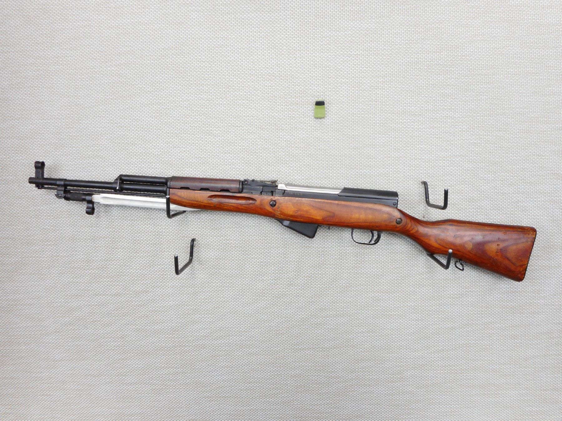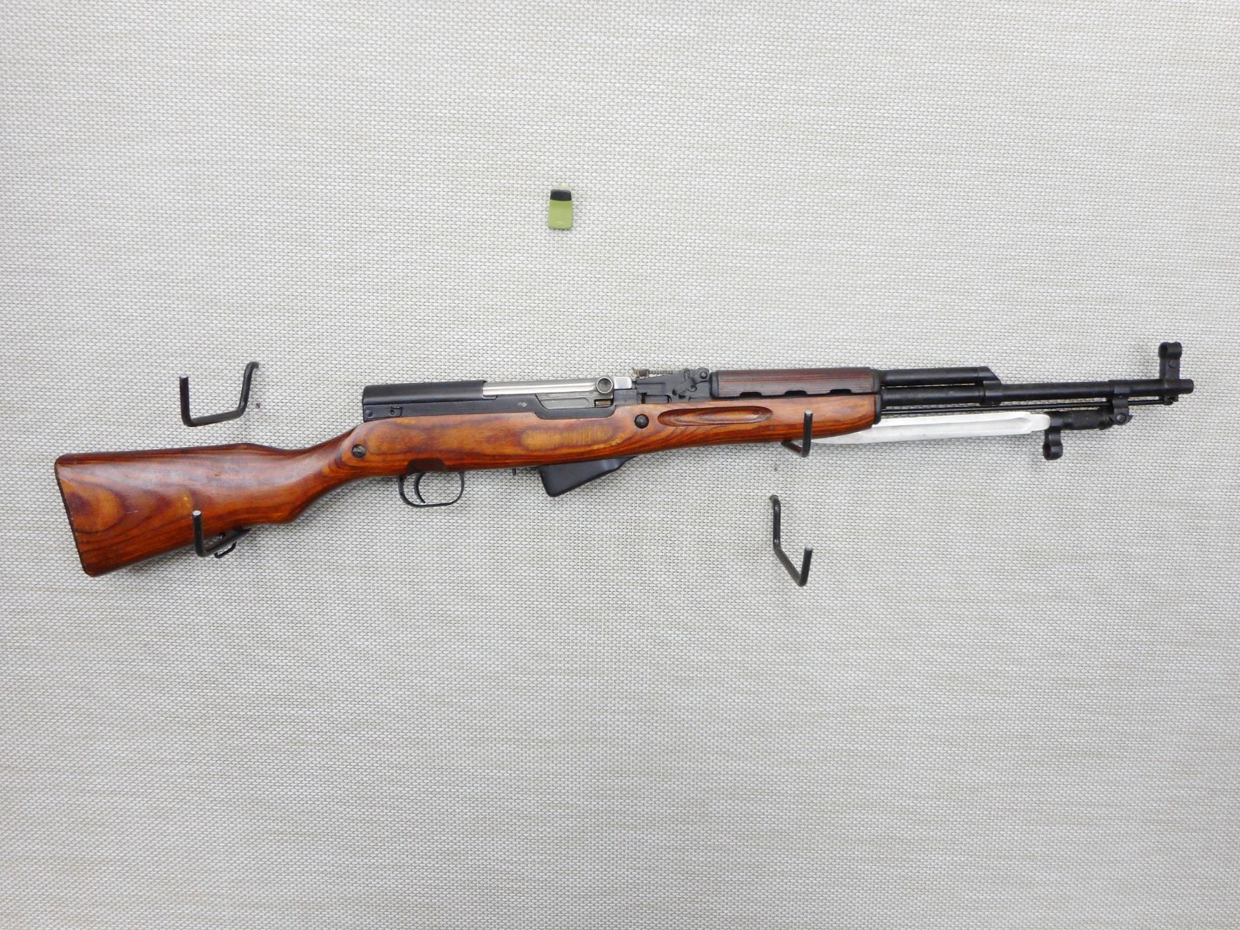 SIMINOV , MODEL: SKS TULA , CALIBER: 7.62 X 39 , MADE AT TULA, DATED 1950, EXCELLENT BORE, HOODED FRONT AND ADJUSTABLE REAR SIGHTS, LAMINATED STOCK, ORIGINAL FOLDING BLADE BAYONET, BOLT AND RECEIVER ARE MATCHING, SHOWS VERY LITTLE HANDLING MARKS , ACTION: SEMI AUTOMATIC RIFLE , BARREL LENGTH: 20 1/2" , CONDITION: 7/10 , STOCK # 9393 , SERIAL # 81892 , CLASS: CANADIAN NON RESTRICTED CLASS
