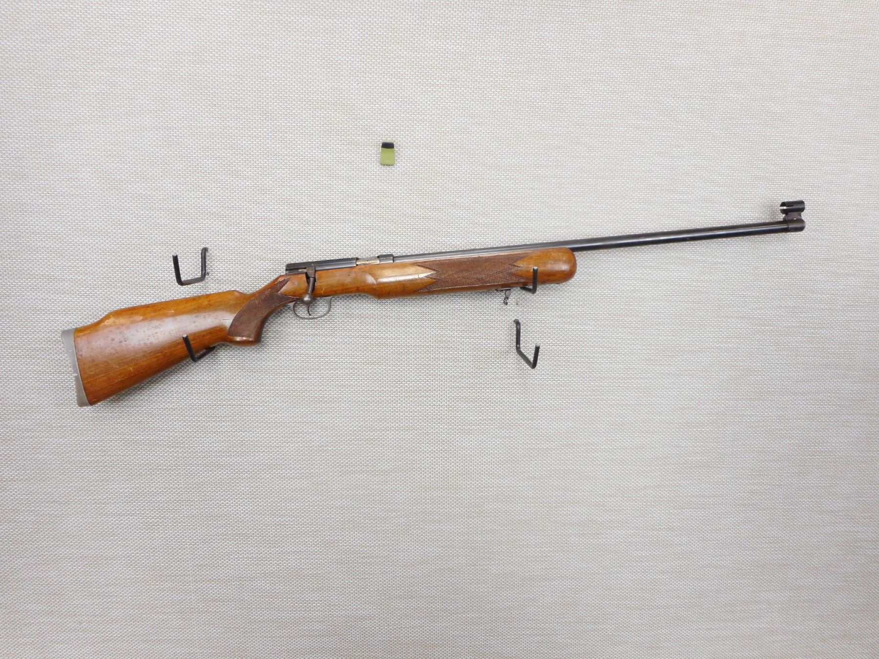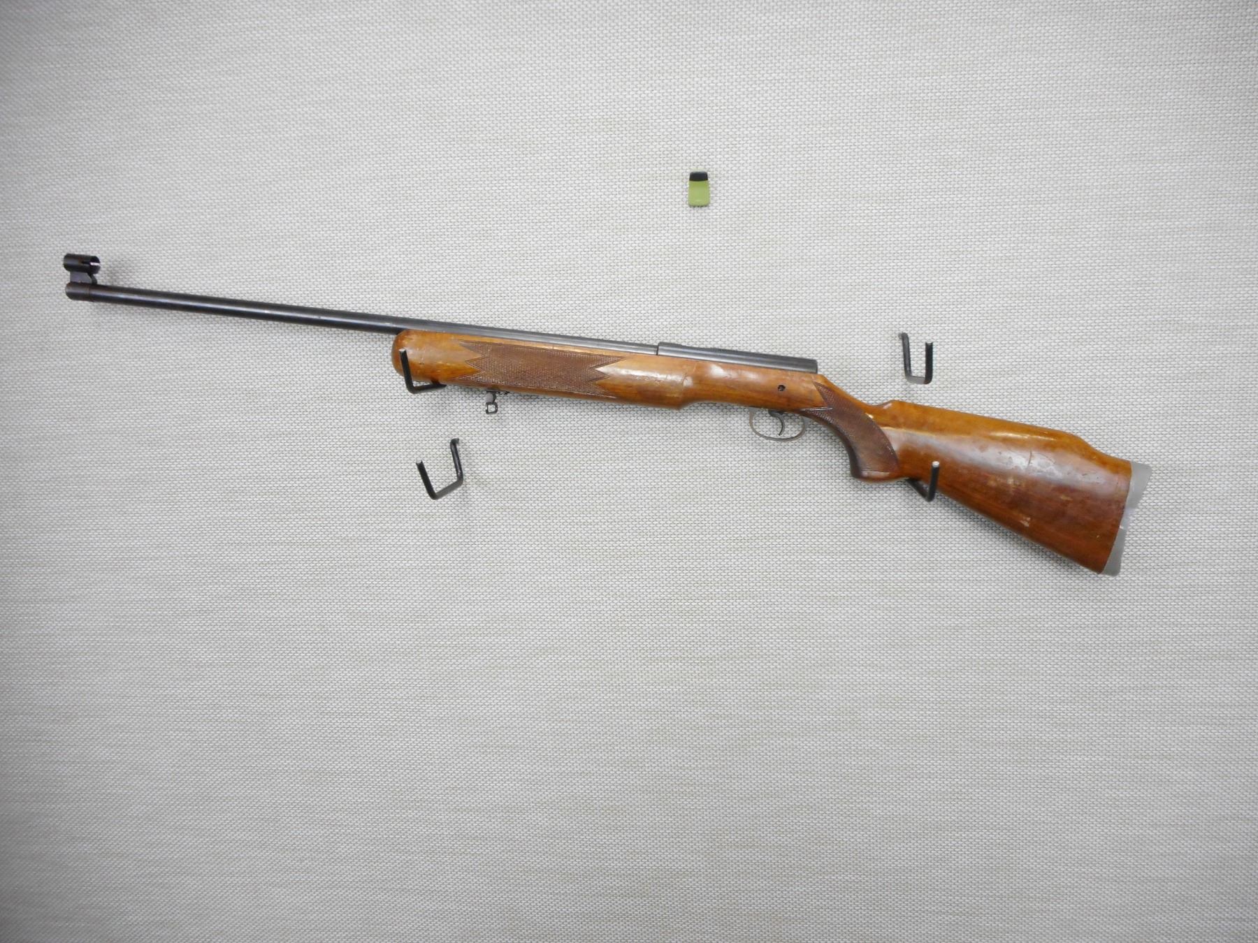 ARMI JAGER , MODEL: AP 62 , CALIBER: 22 LR , GOOD BORE, CHECKERED FOREND AND SEMI PISTOL GRIP BUTT STOCK, ALUMINUM BUTT PLATE, HOODED FRONT, GROOVED RECEIVER REAR SIGHT, SHOWS SOME HANDLING MARKS, HOLE IN LEFT SIDE OF STOCK , ACTION: BOLT ACTION RIFLE , BARREL LENGTH: 26" , CONDITION: 4/10 , STOCK # 9421 , SERIAL # 6767 , CLASS: CANADIAN NON RESTRICTED CLASS