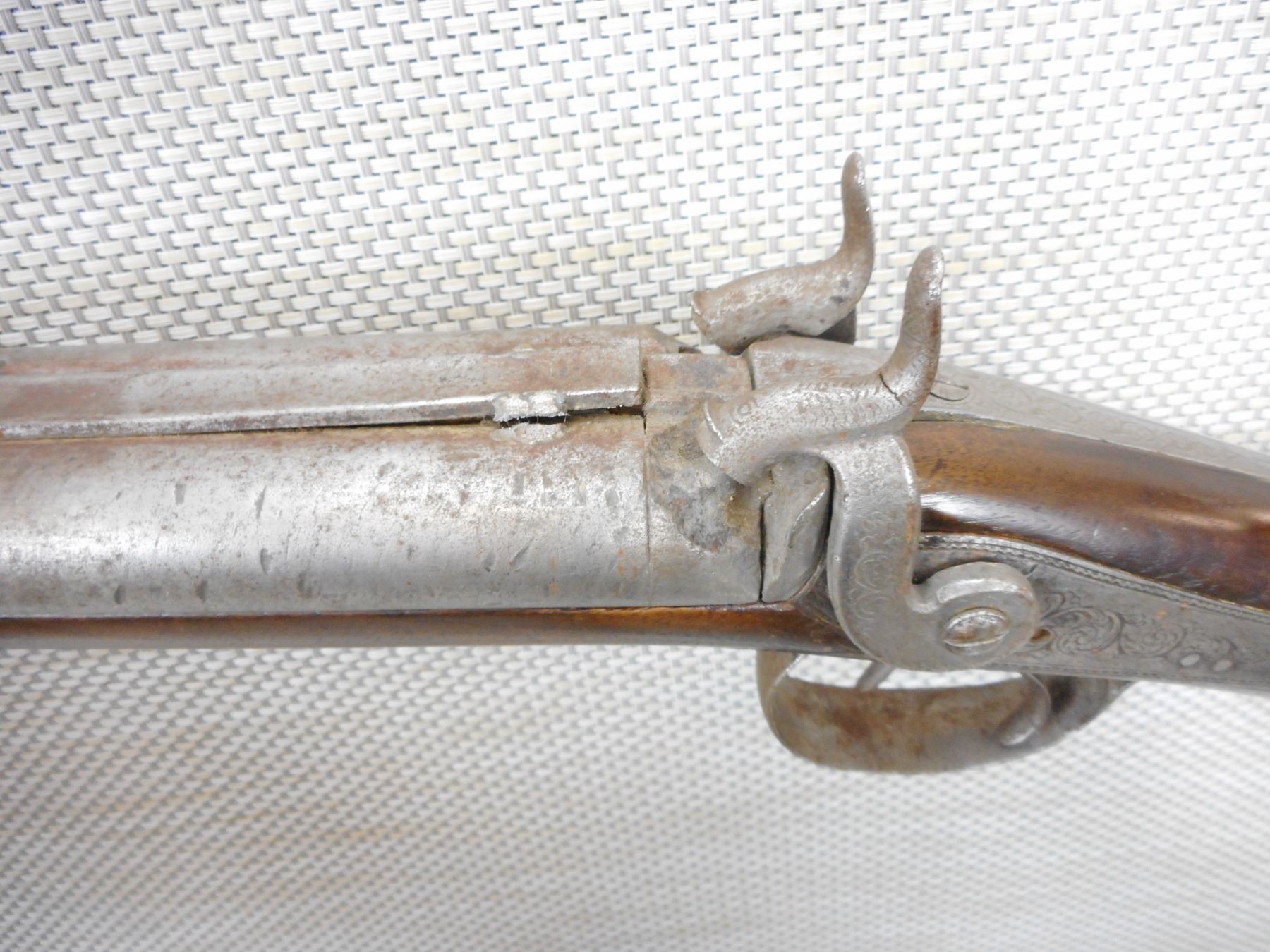 UNKNOWN , MODEL: SIDE BY SIDE , CALIBER: 12GA , BEAD FRONT SIGHT, MISSING THE RIGHT NIPPLE, HOLDS COCK AND FIRES, LIGHTLY ENGRAVED BACK ACTION, BROKEN FRONT BARREL INSPECTION, REPLACED BARREL WEDGE, MISSING RAM ROD, SHOWS EXTENSIVE HANDLING MARKS , ACTION: PERCUSSION MUZZLE LOADER , BARREL LENGTH: 29" , CONDITION: 3/10 , STOCK # 9431 , SERIAL # N/A , CLASS: CANADIAN NON RESTRICTED CLASS