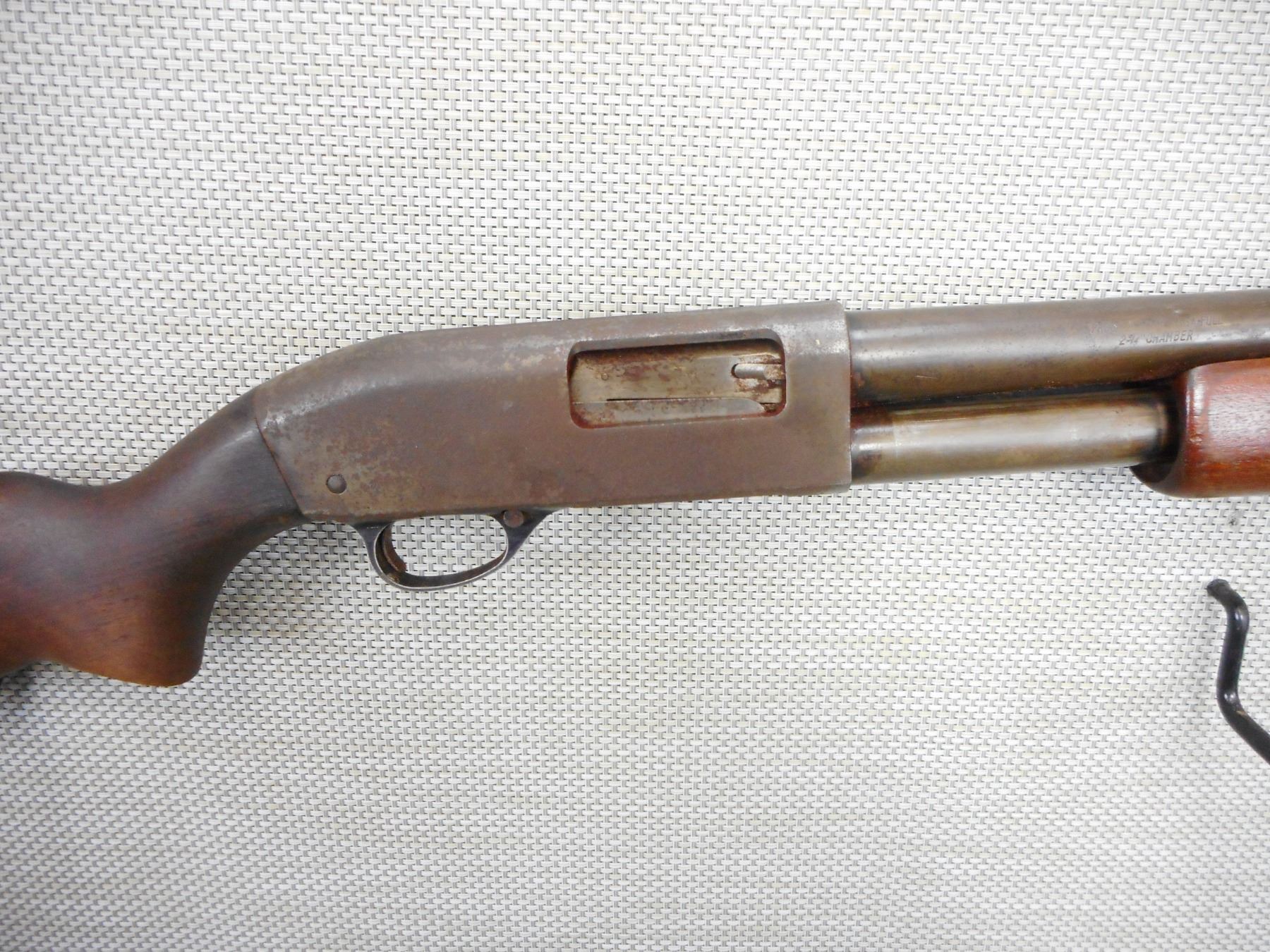 JC HIGGINS, MODEL: 20, CALIBER: 12GA X 2 3/4" , FULL CHOKED BARREL, DARK BORE, FLATTENED BEAD FRONT SIGHT, PITTED AND RUSTY BARREL AND RECEIVER, PLASTIC BUTT PLATE , ACTION: PUMP ACTION SHOTGUN , BARREL LENGTH: 28" , CONDITION: 3/10 , STOCK # 9439 , SERIAL # N/A , CLASS: CANADIAN NON RESTRICTED CLASS