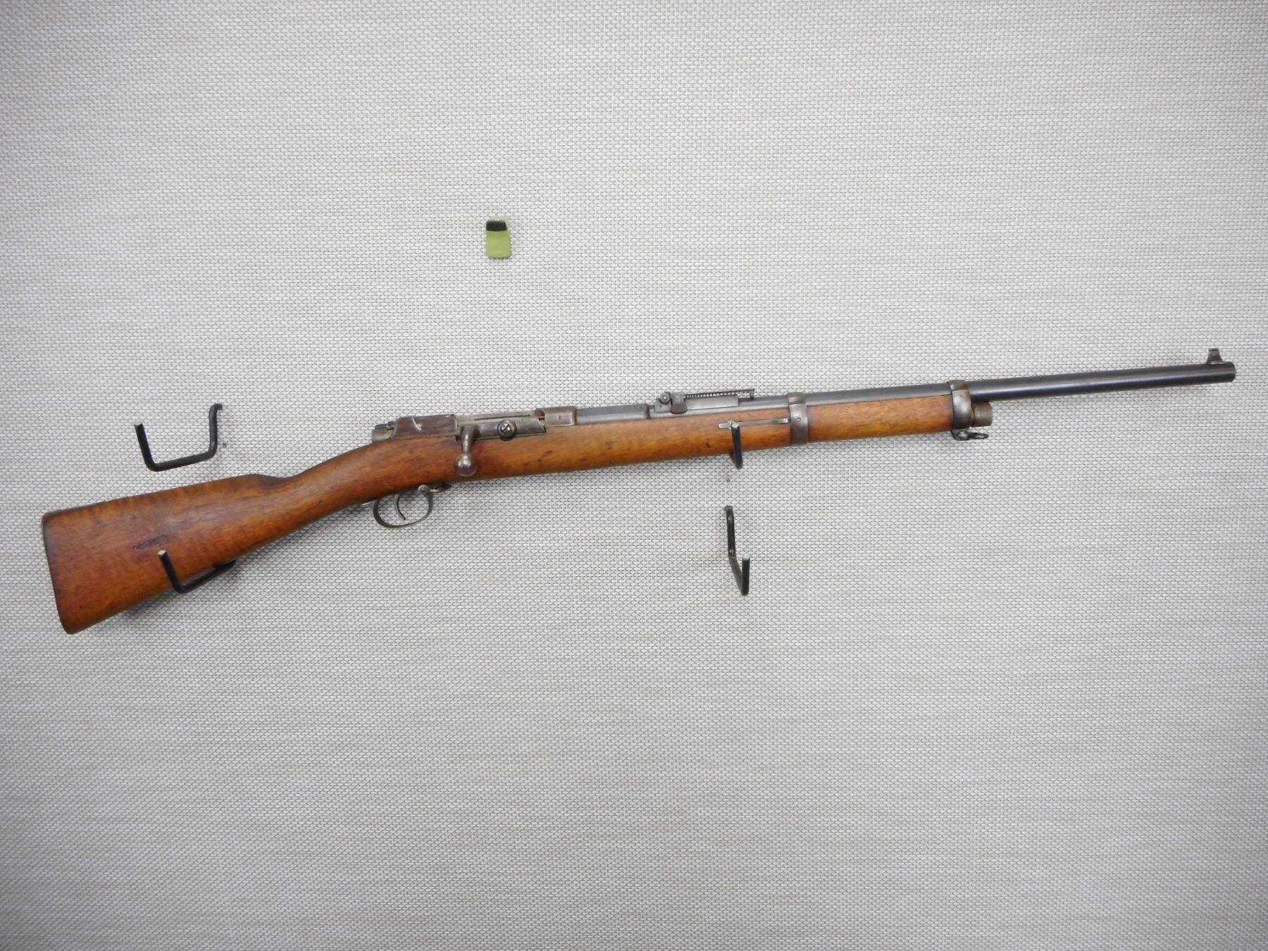 MAUSER, MODEL: CARBINE DANZING , CALIBER: 43 MAUSER , 1887 71/84 MODEL, EXCELLENTBORE, BOLT AND RECEIVERARE MATCHING, SPORTERIZED, BLADE FRONT AND ADJUSTABLE REAR SIGHT, SMALL CRACK IN FOREND, STEEL BUTT PLATE, REGIMENTALLY MARKED, SOME HANDLING MARKS , ACTION: BOLT ACTION, , BARREL LENGTH: 24" , CONDITION: 4/10 , STOCK # 9452 , SERIAL # 1531 , CLASS: CANADIAN NON RESTRICTED CLASS