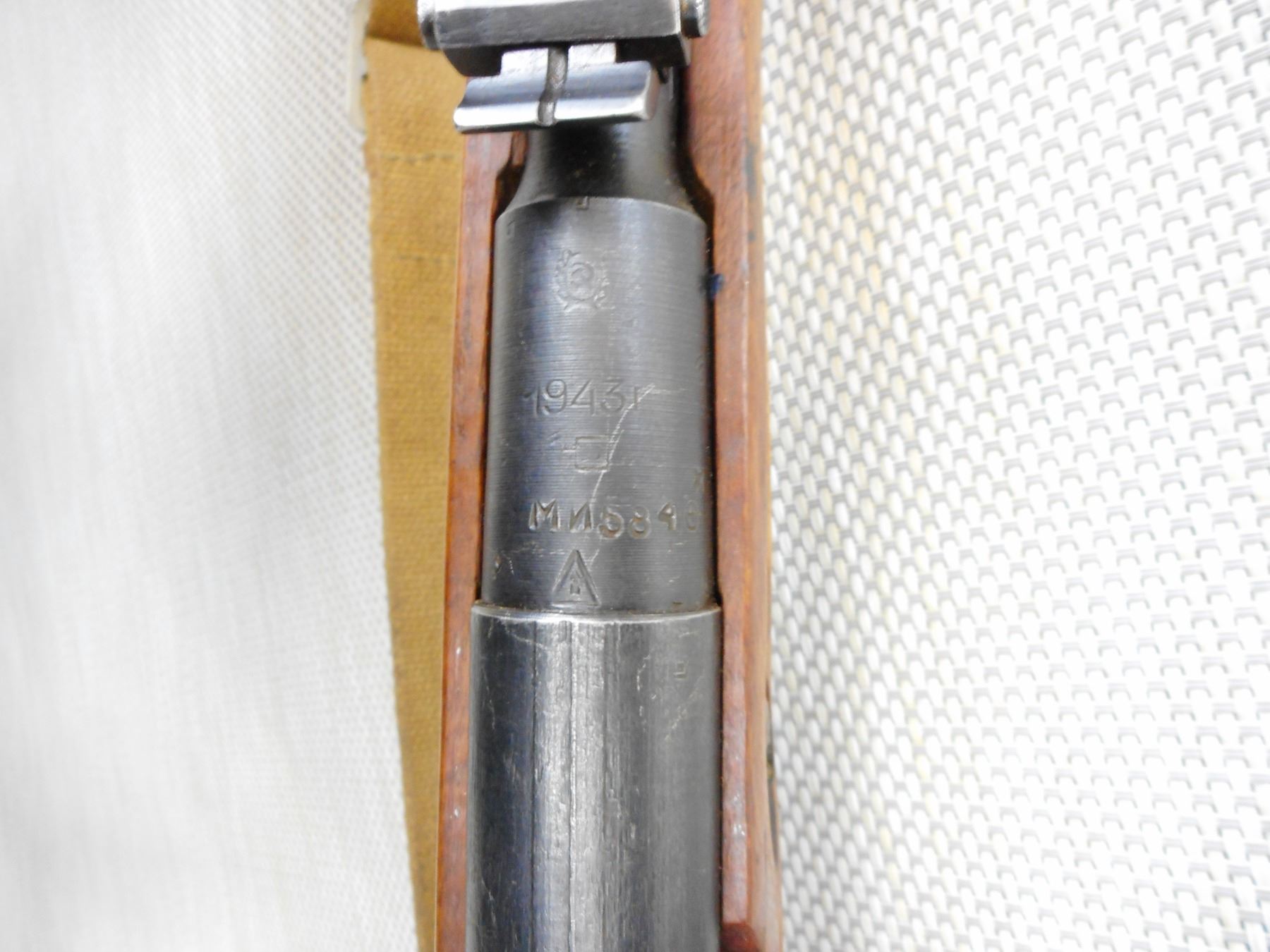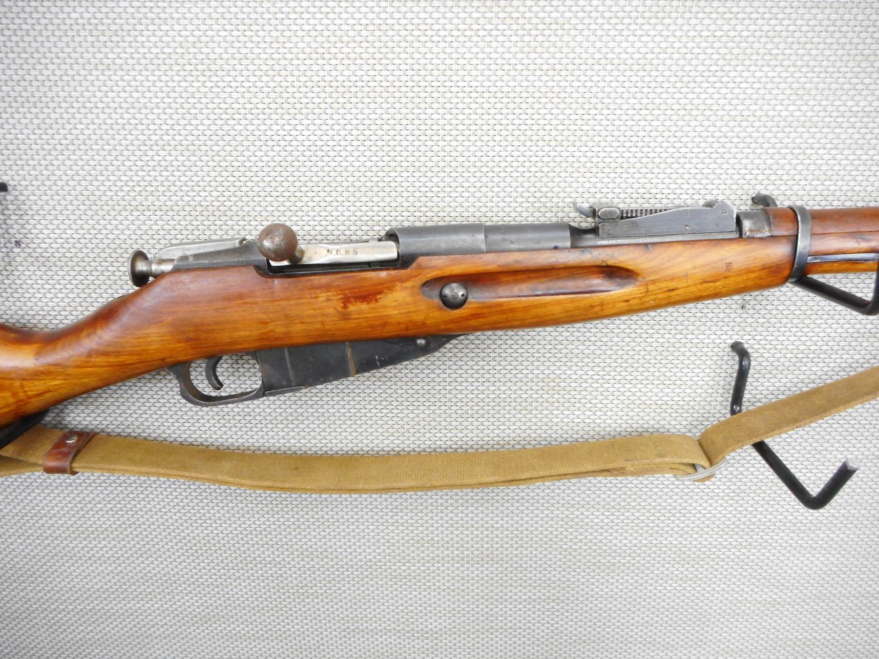 WWII ERA, MOSIN NAGANT, MODEL: 91/30, CALIBER: 7.62 X 54R , GOOD BORE,MADE IN IZVESHK, DATED 1943, BOLT AND RECEIVER DON'T MATCH BY SERIAL #, REPLACED FRONT SIGHT ASSEMBLY, MISSING THE CLEANING ROD, RETAINS FULL MILITARY CONFIGURATION, LEATHER AND CANVAS SLING, SHOWS SOME HANDLING MARKS, STEEL BUTT PLATE , ACTION: BOLT ACTION REPEATER , BARREL LENGTH: 29" , CONDITION: 6/10 , STOCK # 9481 , SERIAL # 5846 , CLASS: CANADIAN NON RESTRICTED CLASS