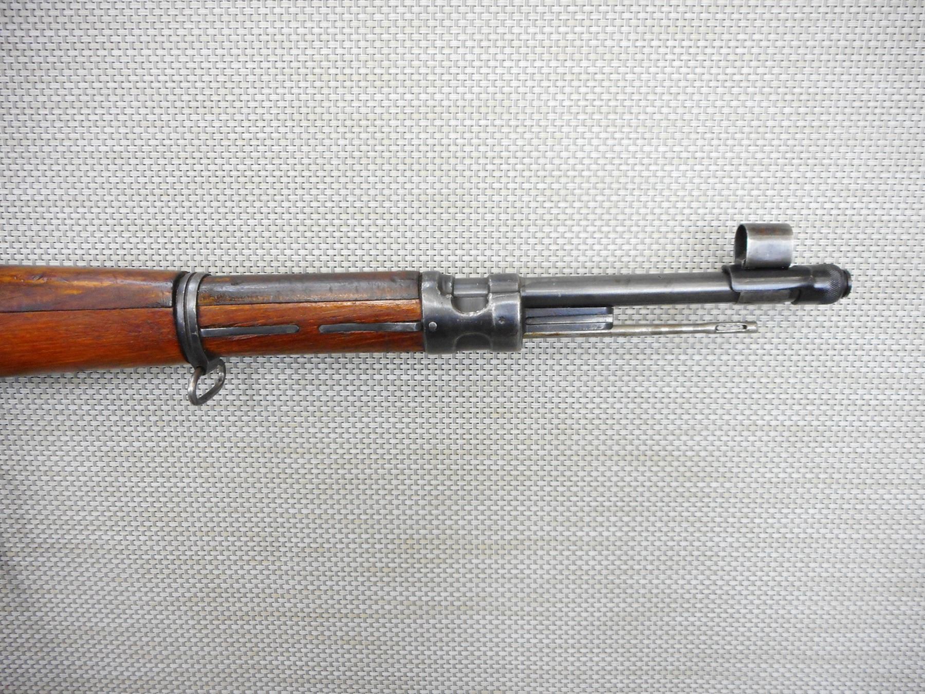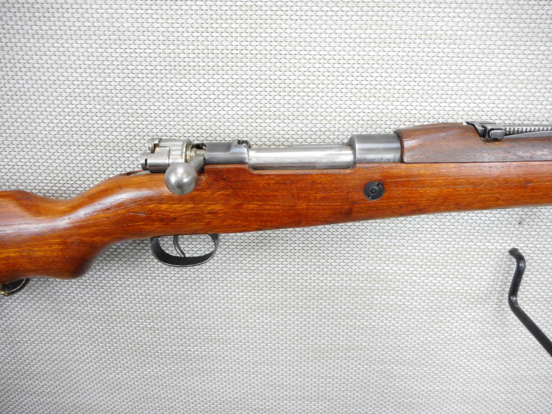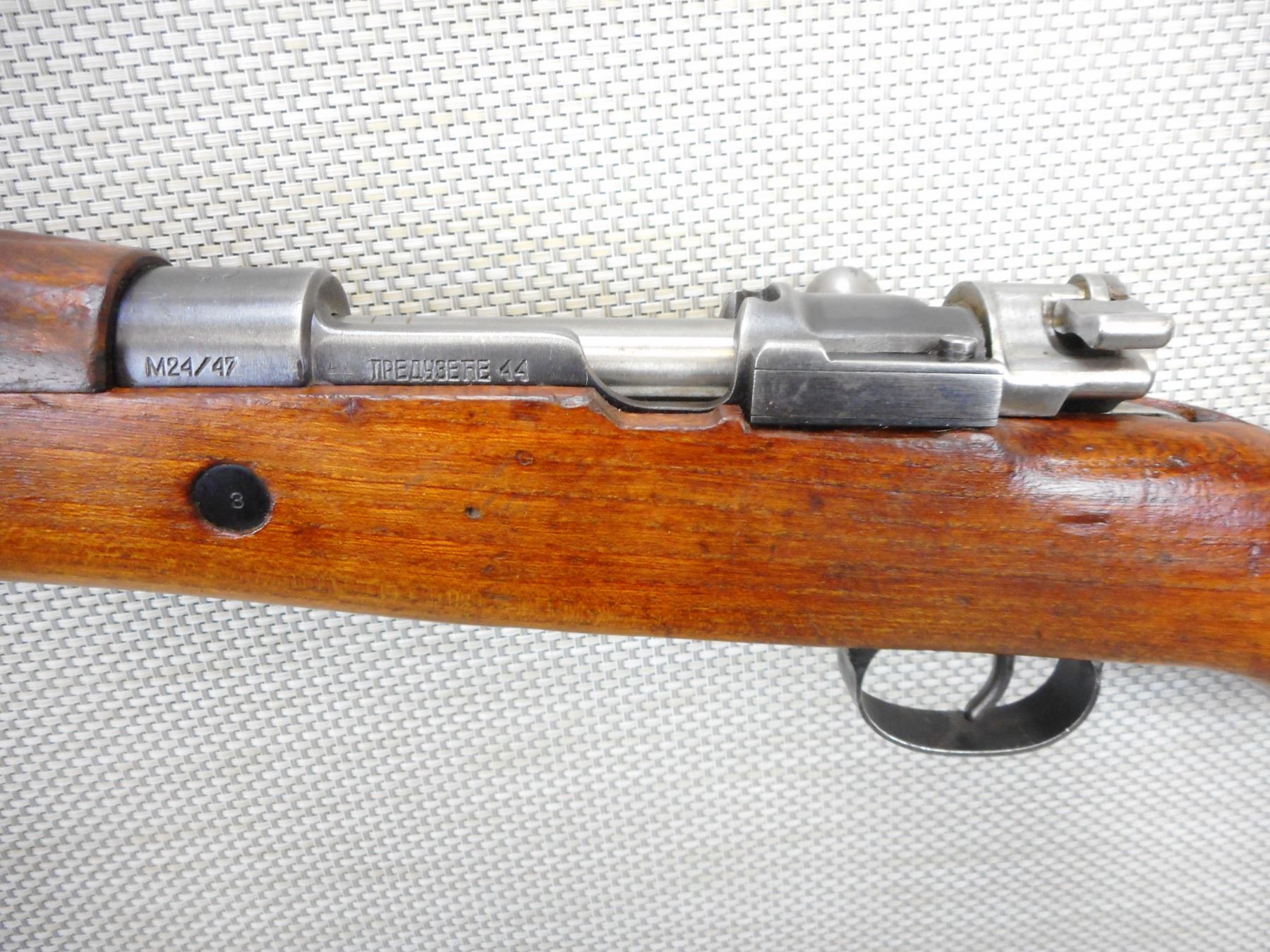 WWII ERA, MAUSER, MODEL: 1924/47 YUGOSLAVIAN SHORT RIFLE , CALIBER: 8MM MAUSER , DATED 1944, BOLT AND RECEIVER MATCH BY SERIAL #, HOODED FRONT SIGHT WITH MUZZLE CAP, ADJUSTABLE REAR SIGHT, RETAINS FULL MILITARY CONFIGURATION, SHOWS SOME HANDLING MARKS, SLING LOOPS , EXCELLENT BORE , ACTION: BOLT ACTION REPEATER , BARREL LENGTH: 24" , CONDITION: 7/10 , STOCK # 9482 , SERIAL # 31750 , CLASS: CANADIAN NON RESTRICTED CLASS