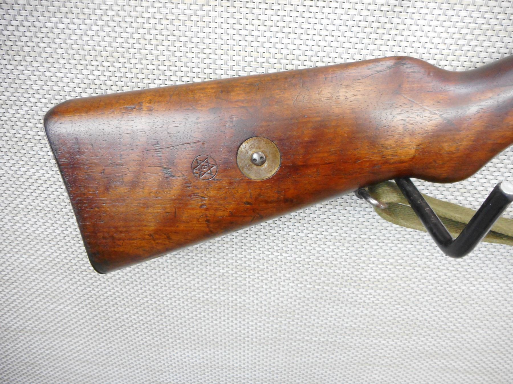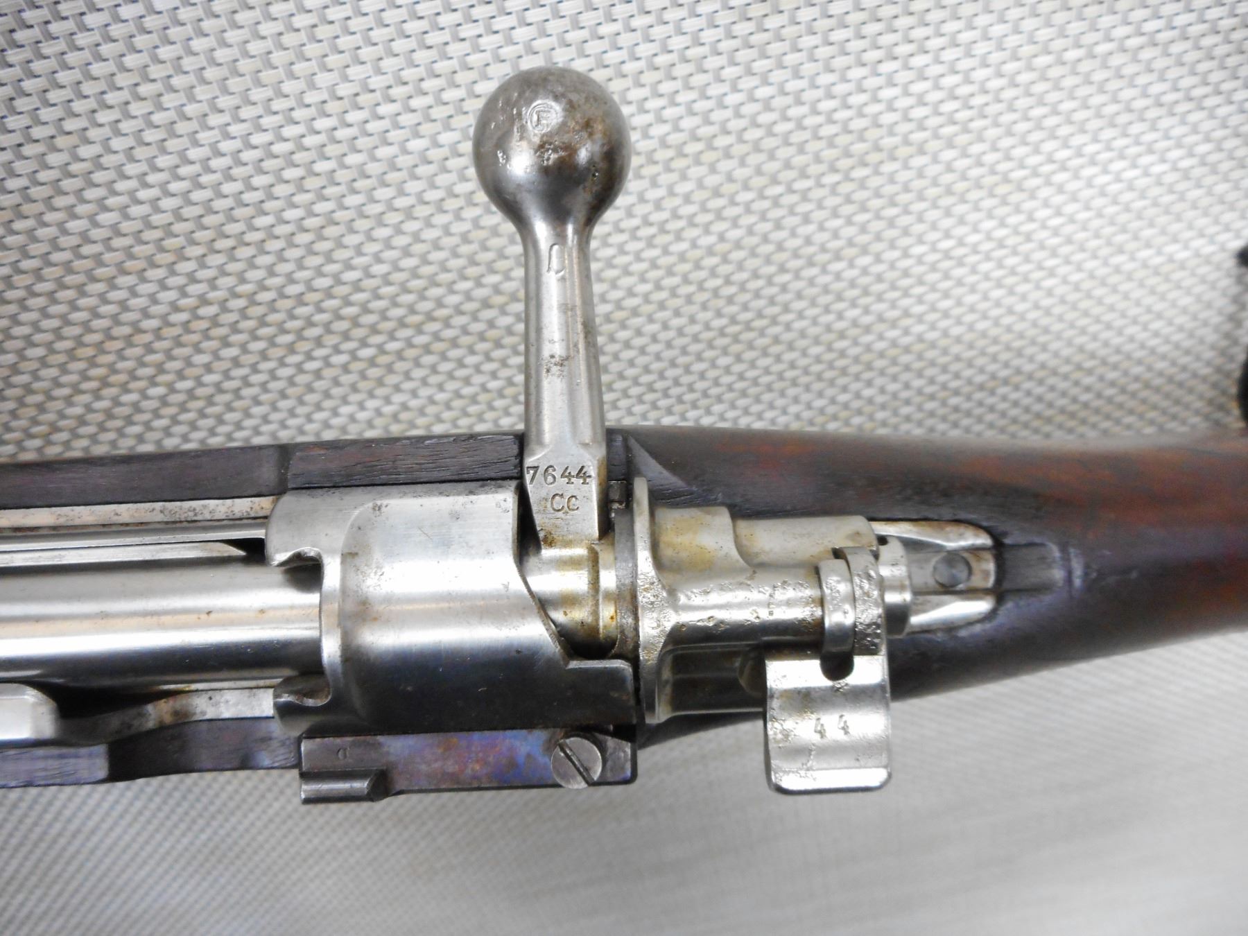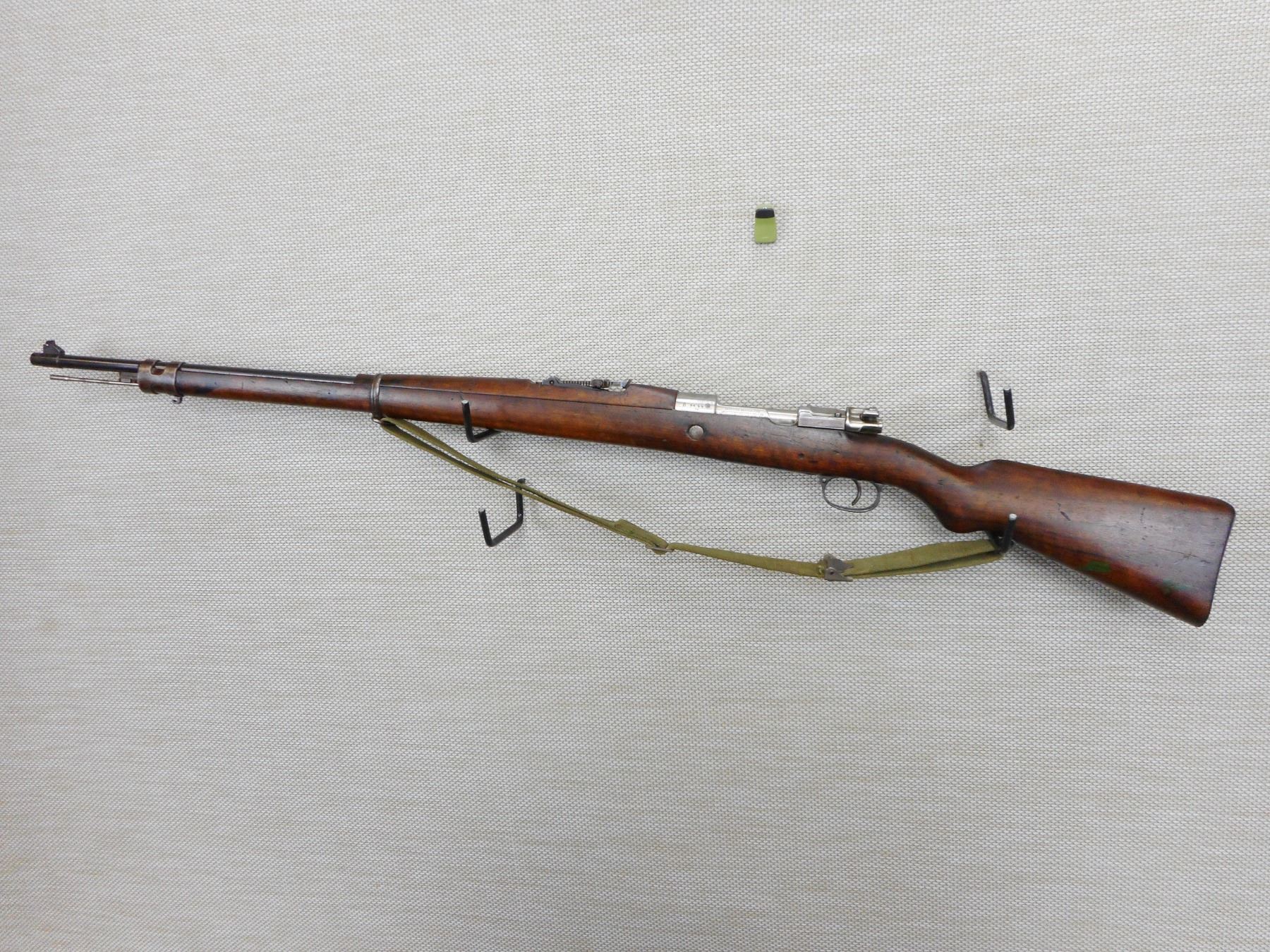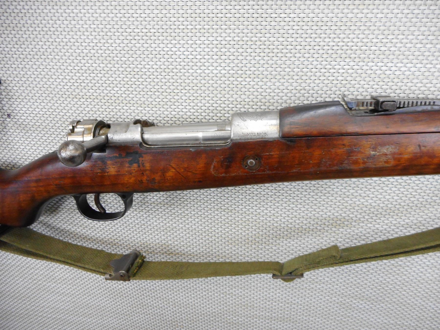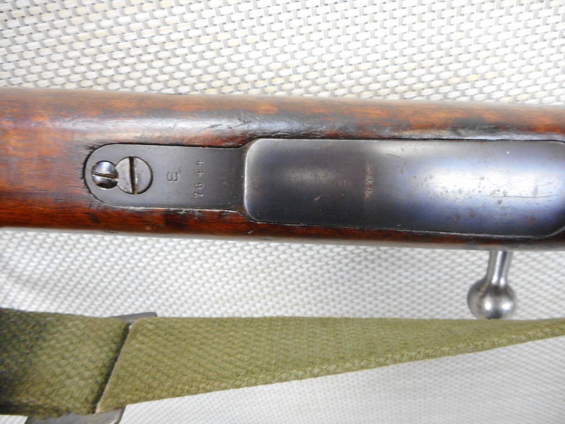 MAUSER, MODEL: 1908 BRAZILIAN RIFLE , CALIBER: 7MM MAUSER , MANUFACTURED BY DWM, BOLT AND RECEIVER MATCH BE SERIAL #, HAS THE BRAZILIAN CREST, SLING SWIVEL LOOPS WITH CANVAS SLING, STEEL BUTT PLATE, RETAINS FULL MILITARY CONFIGURATION, SHOWS SOME HANDLING MARKS, VERY GOOD BORE , ACTION: BOLT ACTION REPEATER , BARREL LENGTH: 29" , CONDITION: 7/10 , STOCK # 9483 , SERIAL # B7644 , CLASS: CANADIAN NON RESTRICTED CLASS