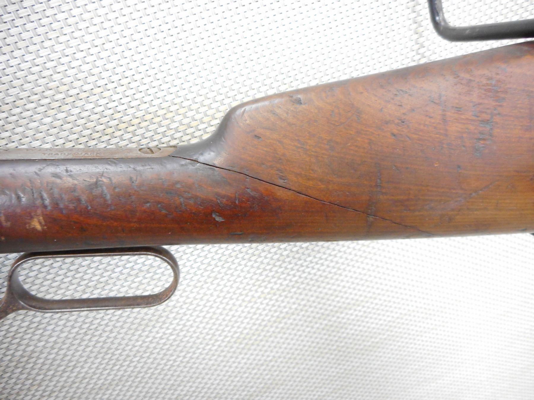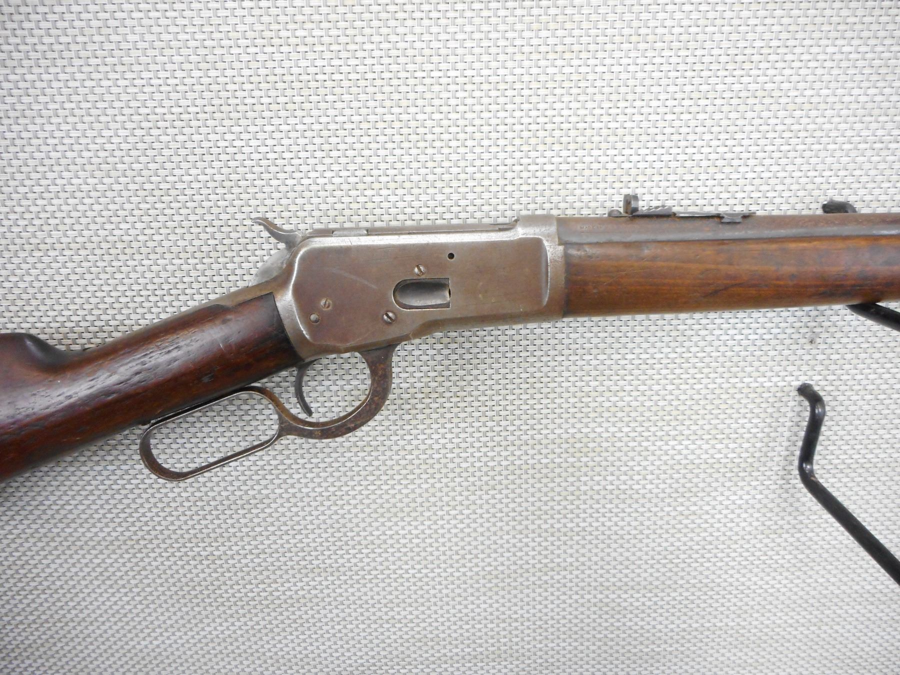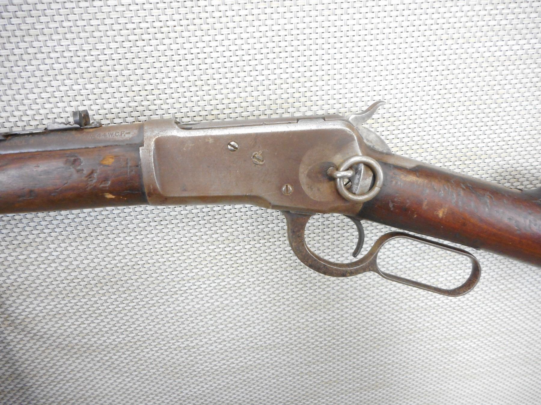 WINCHESTER, MODEL: 92 SADDLE RING CARBINE, CALIBER: 44-40 , MANUFACTURED IN 1906, HAS A SADDLE RING, BORE IS EXCELLENT, BLADE FRONT AND ADJUSTABLE REAR SIGHT, TWO PIECE HARDWOOD STOCK WITH STEEL BUTT PLATE, CRACK IN FOREND AND BUTT STOCK, SHOWS EXTENSIVE HANDLING MARKS, SCREWS ARE MARRED, A NICE HONEST GUN FOR THE ERA , ACTION: LEVER ACTION RIFLE , BARREL LENGTH: 20" , CONDITION: 6/10 , STOCK # 9508 , SERIAL # 393765 , CLASS: CANADIAN NON RESTRICTED CLASS