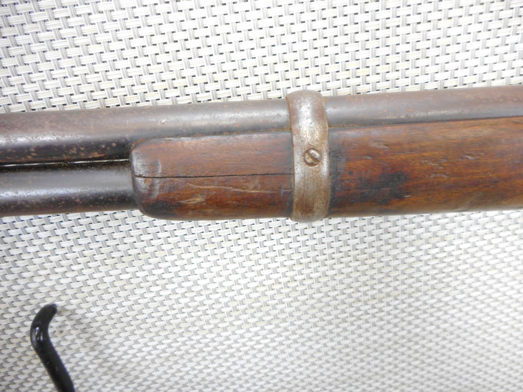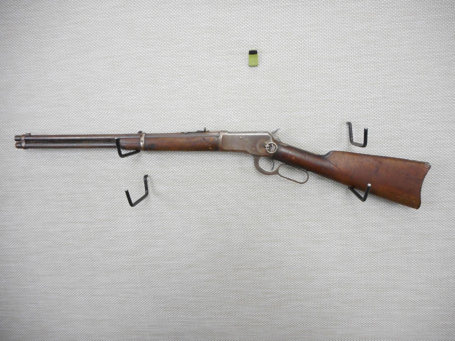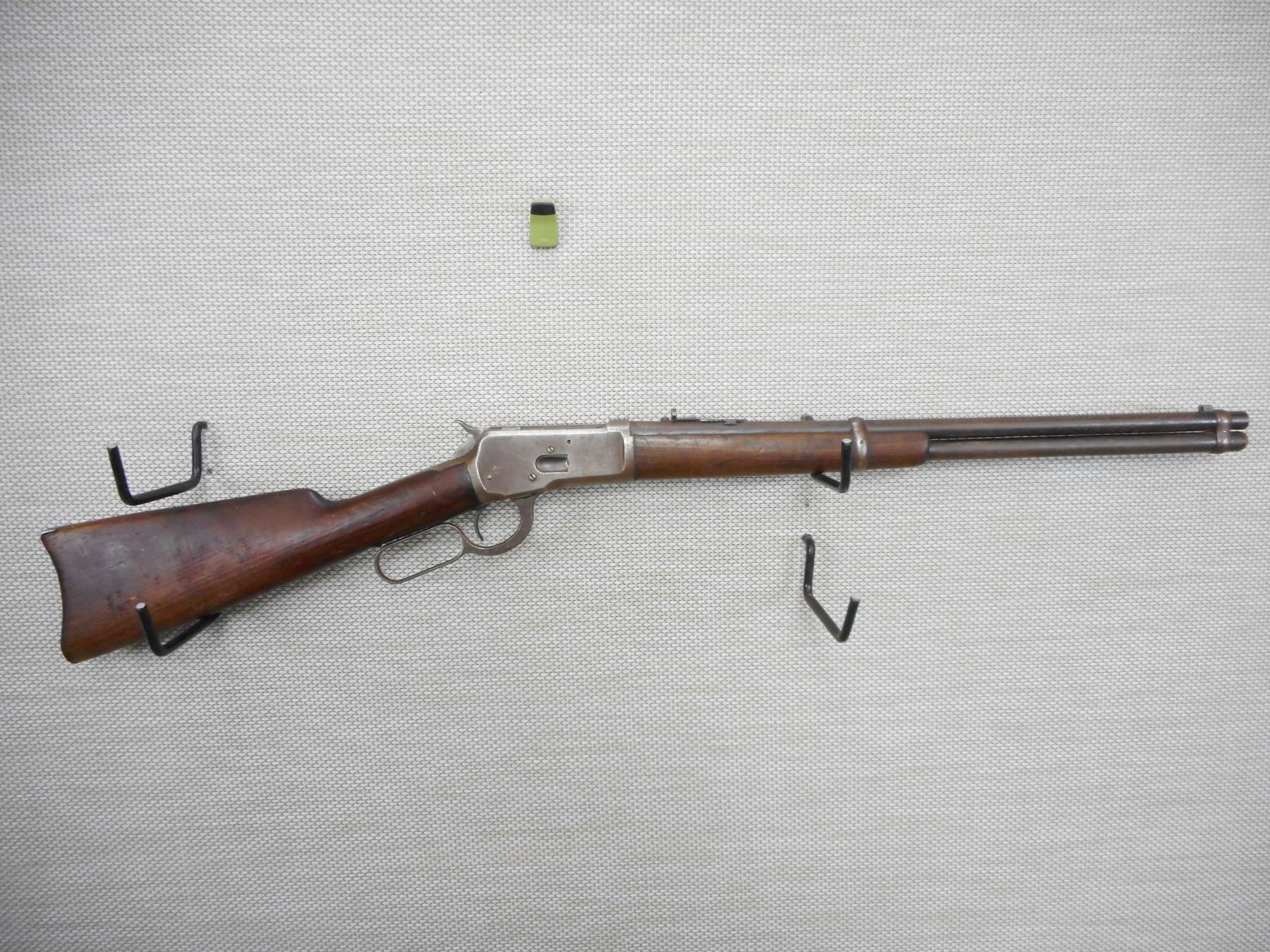 WINCHESTER, MODEL: 92 SADDLE RING CARBINE, CALIBER: 44-40 , MANUFACTURED IN 1906, HAS A SADDLE RING, BORE IS EXCELLENT, BLADE FRONT AND ADJUSTABLE REAR SIGHT, TWO PIECE HARDWOOD STOCK WITH STEEL BUTT PLATE, CRACK IN FOREND AND BUTT STOCK, SHOWS EXTENSIVE HANDLING MARKS, SCREWS ARE MARRED, A NICE HONEST GUN FOR THE ERA , ACTION: LEVER ACTION RIFLE , BARREL LENGTH: 20" , CONDITION: 6/10 , STOCK # 9508 , SERIAL # 393765 , CLASS: CANADIAN NON RESTRICTED CLASS