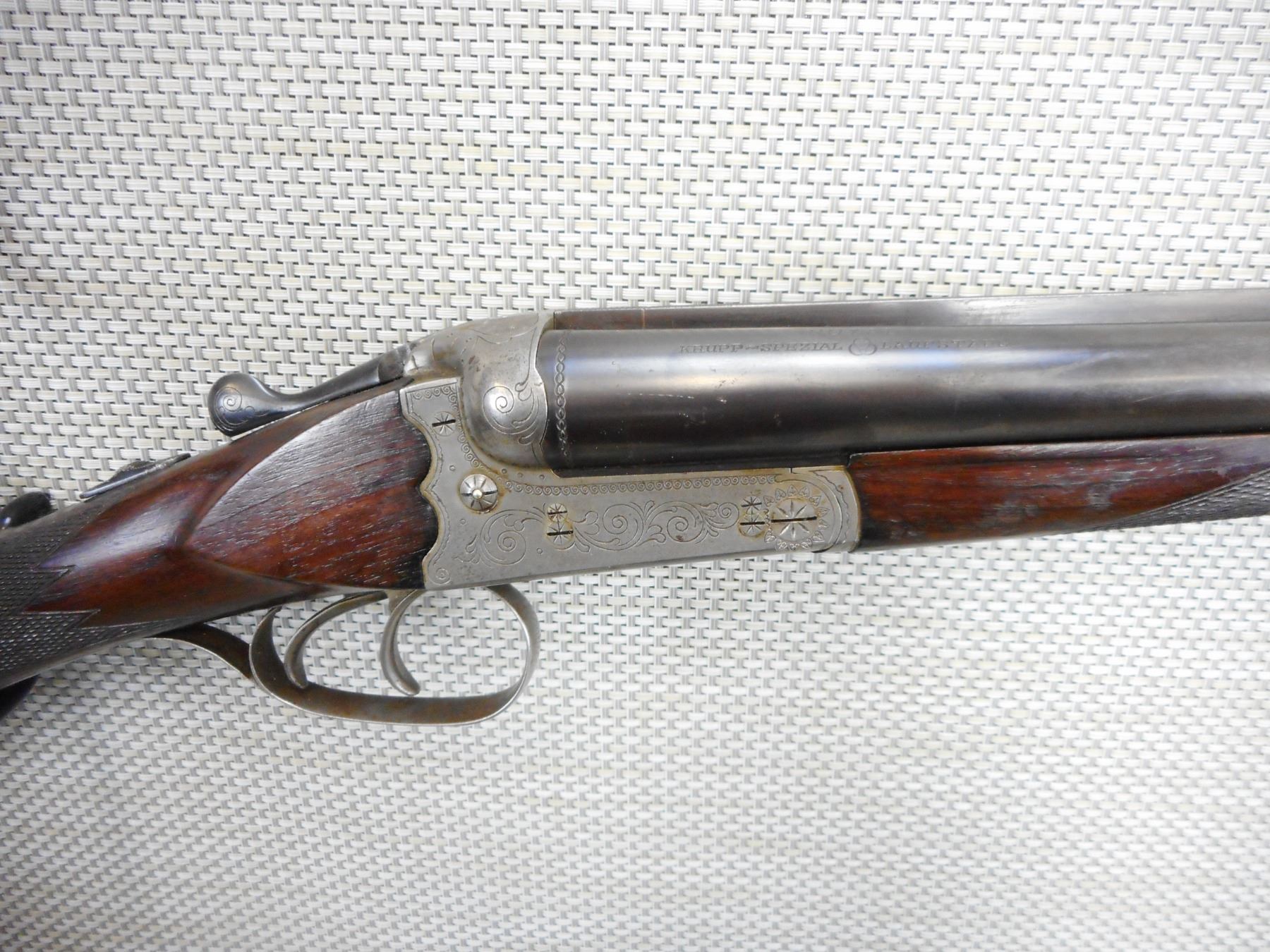 JP SAUER , MODEL: ROYAL , CALIBER: 12GA X 2 3/4" , FIXED FULL AND MODIFIED CHOKES, BORES ARE GOOD, HAS COCKING INDICATORS, BEAD FRONT SIGHT, SOME LIGHT SURFACE PITTING ON THE BARRELS NEAR THE BREACH, CHECKERED FOREND AND STRAIGHT GRIP BUTT STOCK WITH A VENTED RUBBER RECOIL PAD, SLING SWIVEL STUDS, OWNERS INITIALS ARE INLAYED IN THE UNDERSIDE OF THE BUTT STOCK IN A SILVER DISK, LIGHTLY ENGRAVED RECEIVER, SHOWS SOME HANDLING MARKS , ACTION: BREAK ACTION SIDE BY SIDE SHOTGUN , BARREL LENGTH: 28" , CONDITION: 7/10 , STOCK # 9523 , SERIAL # B4640 , CLASS: CANADIAN NON RESTRICTED CLASS