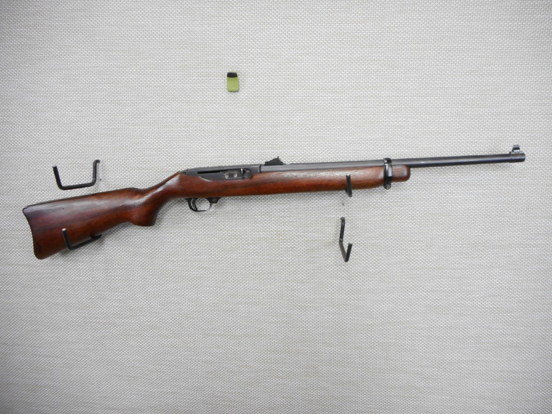 RUGER , MODEL: CARBINE , CALIBER: 44 MAG , HAS A TUBULAR MAG, EXCELLENT BORE, RAMP FRONT SIGHT WITH FIBER OPTIC SIGHT, ADJUSTABLE REAR SIGHT, ONE PIECE HARDWOOD STOCK WITH STEEL BUTT PLATE, SHOWS SOME HANDLING MARKS, DRILLED AND TAPPED FOR SCOPE MOUNTS, TANG SIGHT REMOVED AND HOLES HAVE BEEN FILLED , ACTION: SEMI AUTOMATIC RIFLE , BARREL LENGTH: 18 1/2" , CONDITION: 7/10 , STOCK # 9528 , SERIAL # 10221213 , CLASS: CANADIAN NON RESTRICTED CLASS