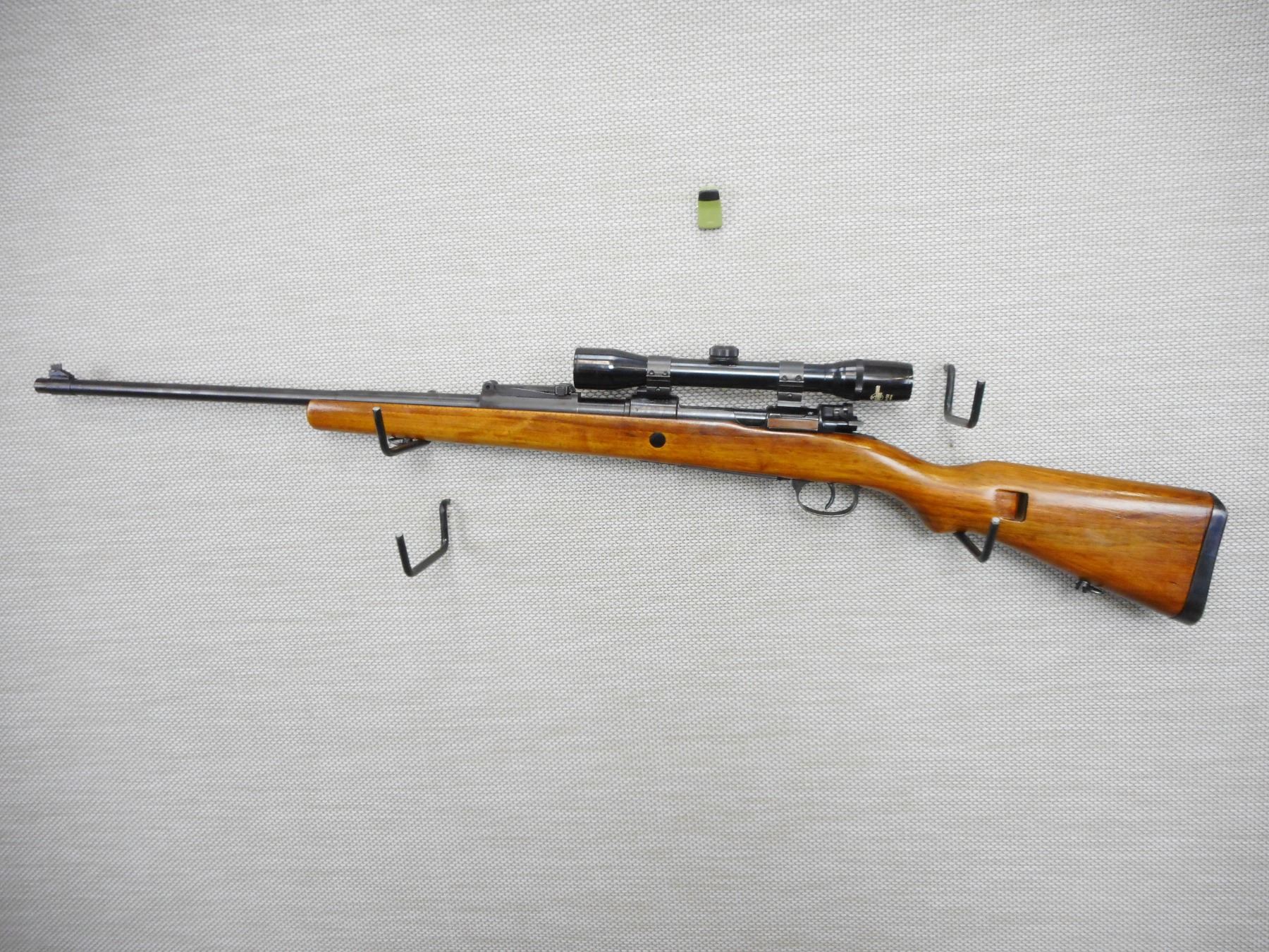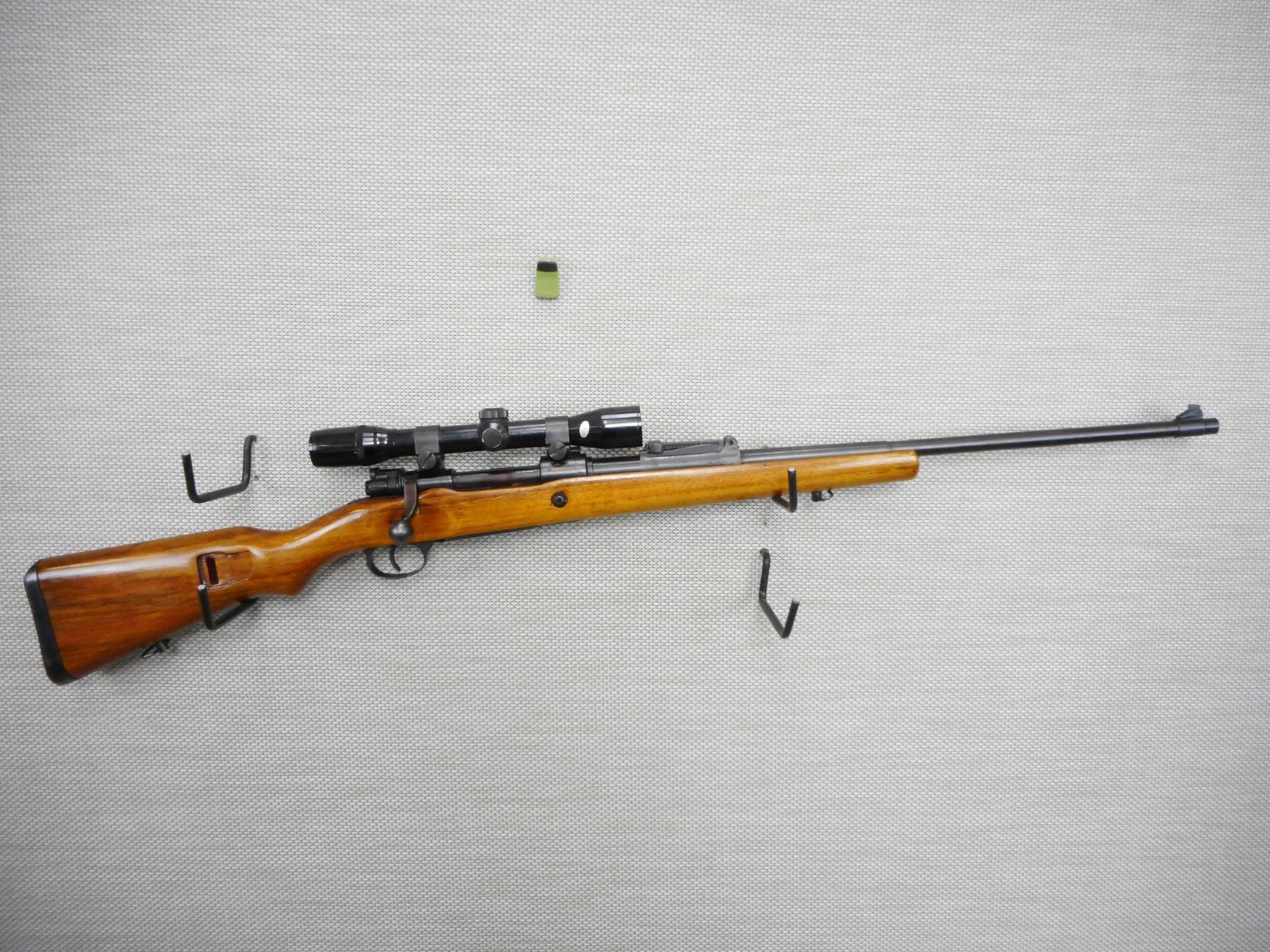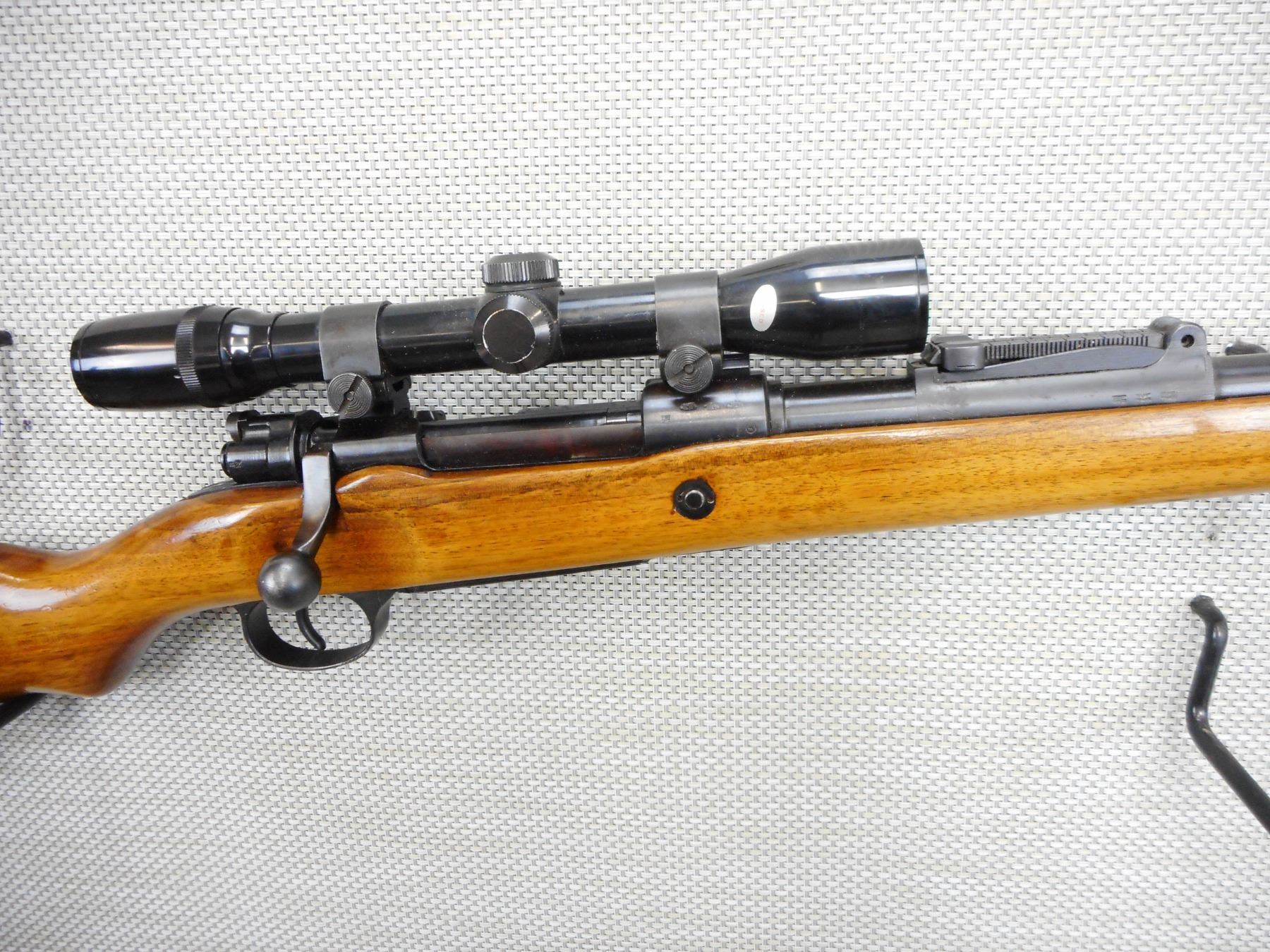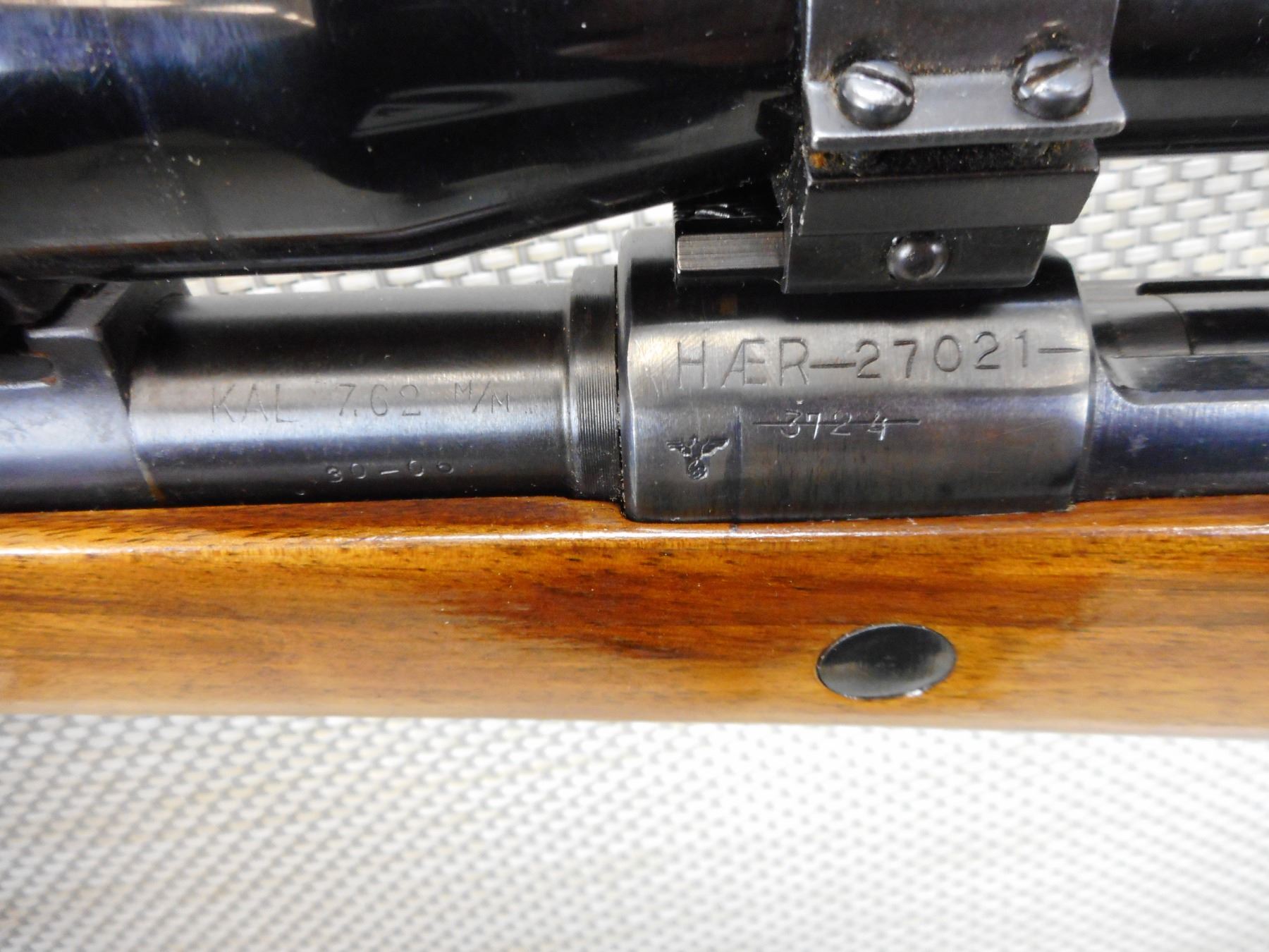 GERMAN MILITARY, MAUSER , MODEL: SPORTER , CALIBER: 30-06 SPRG , REWORKED MILTIARY K98 MAUSER WITH GERMAN MILITARY MARKS, BORE IS VERY GOOD, GLOBE FIREARMS 4 X SCOPE, BLADE FRONT SIGHT AND ADJUSTABLE REAR SIGHT, SLING SWIVEL LOOPS, STEEL BUTT PLATE, SHOWS SOME HANDLING MARKS , ACTION: BOLT ACTION RIFLE , BARREL LENGTH: 24" , CONDITION: 7/10 , STOCK # 9529 , SERIAL # 27021 , CLASS: CANADIAN NON RESTRICTED CLASS