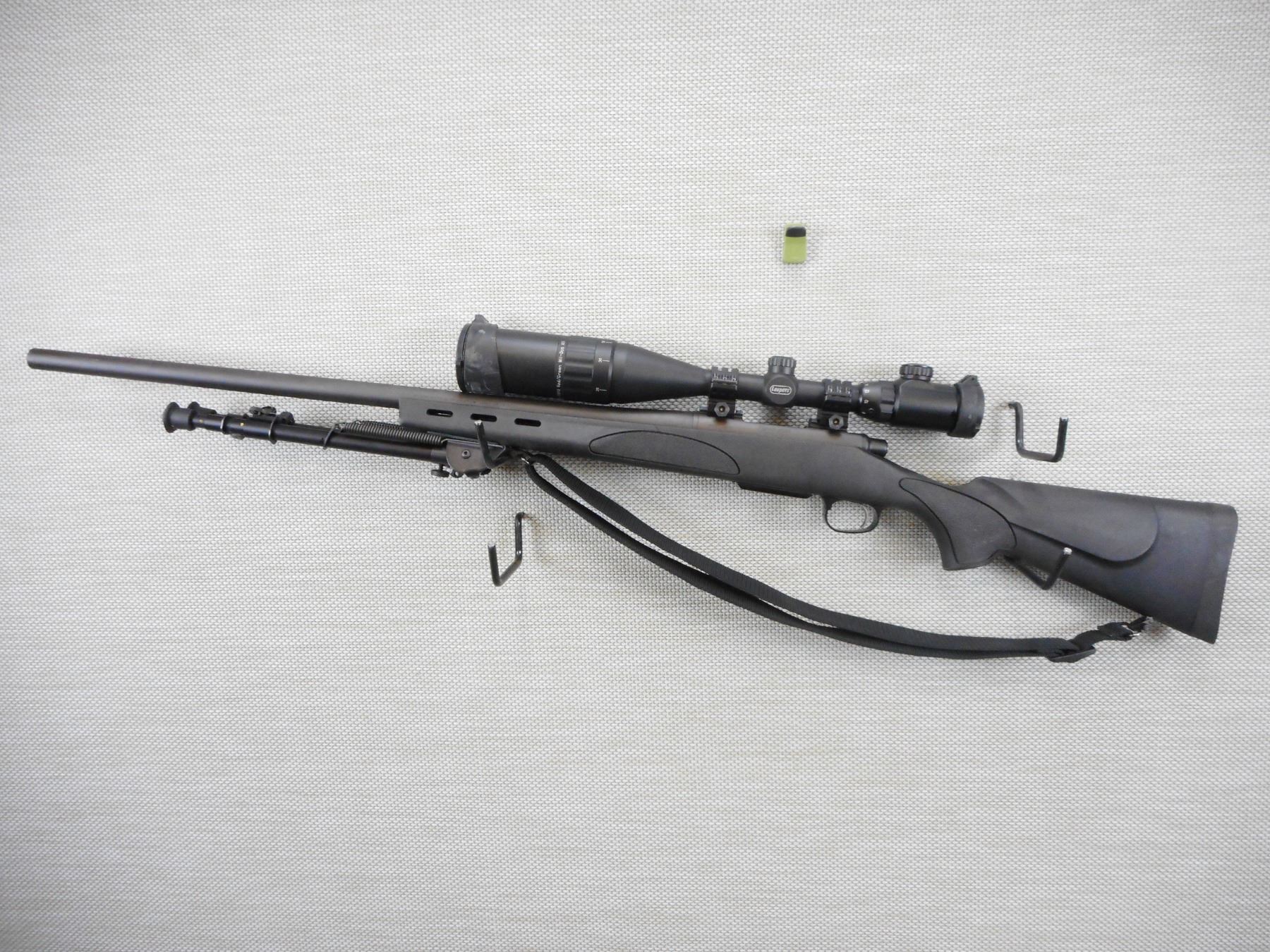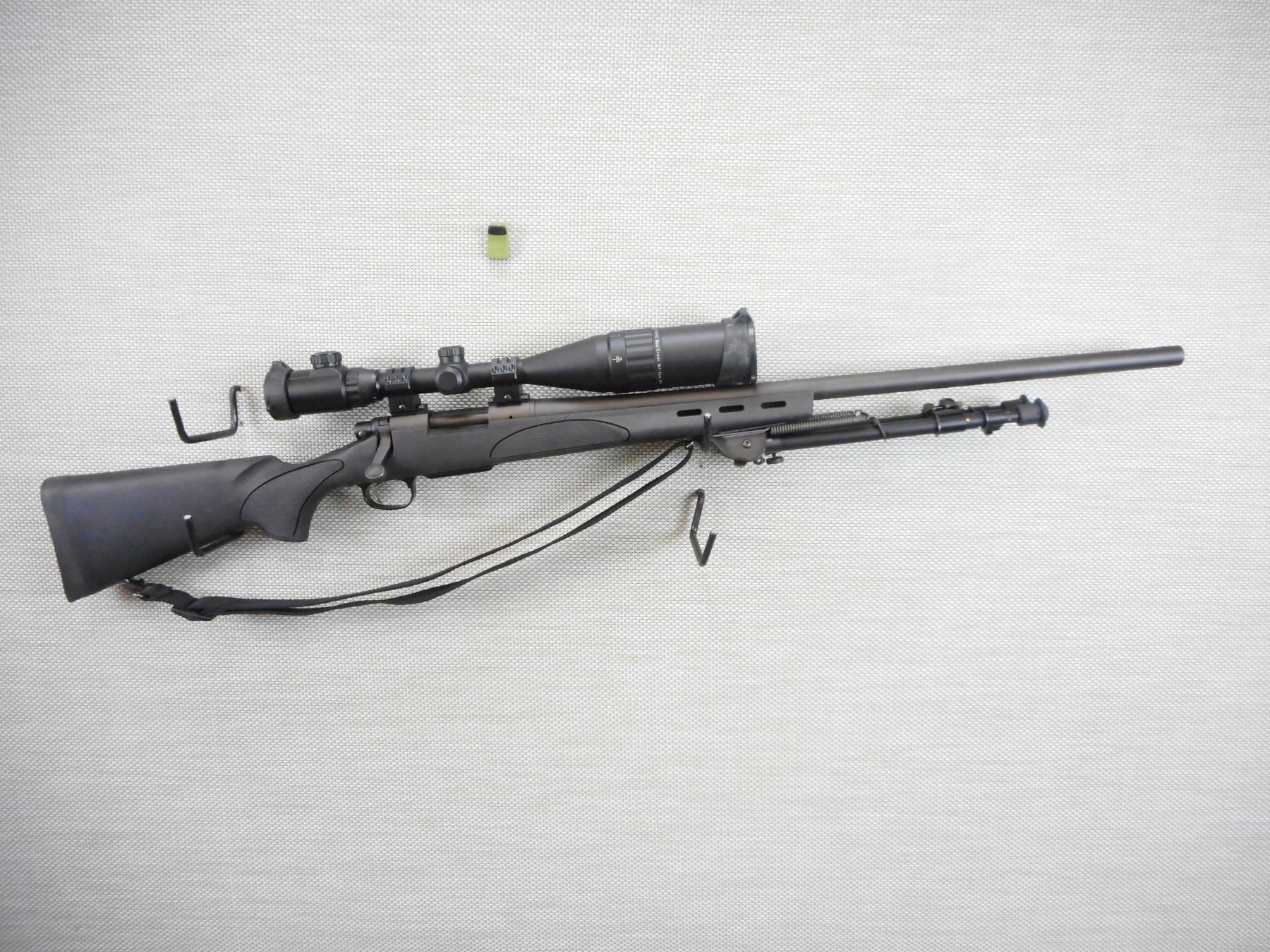 REMINGTON , MODEL: 700, CALIBER: 308 WIN , COMES WITH BOX AND 2 MAGAZINES, EXCELLENT BORE, NO SIGHTS, FEATURES A LEAPERS 4 - 16 POWER RED GREEN MIL DOT SCOPE AND A FOLDING BIPOD, BLACK SYNTHETIC STOCK WITH VENTED FOREND, SEMI PISTOL GRIP BUTT STOCK WITH RAISED CHEEK PIECE, RUBBER RECOIL PAD, SLING SWIVEL LOOPS WITH NYLON SLING, SHOWS VERY LITTLE HANDLING MARKS , ACTION: BOLT ACTION RIFLE , BARREL LENGTH: 26" , CONDITION: 9/10 , STOCK # 9541 , SERIAL # G6844698 , CLASS: CANADIAN NON RESTRICTED CLASS