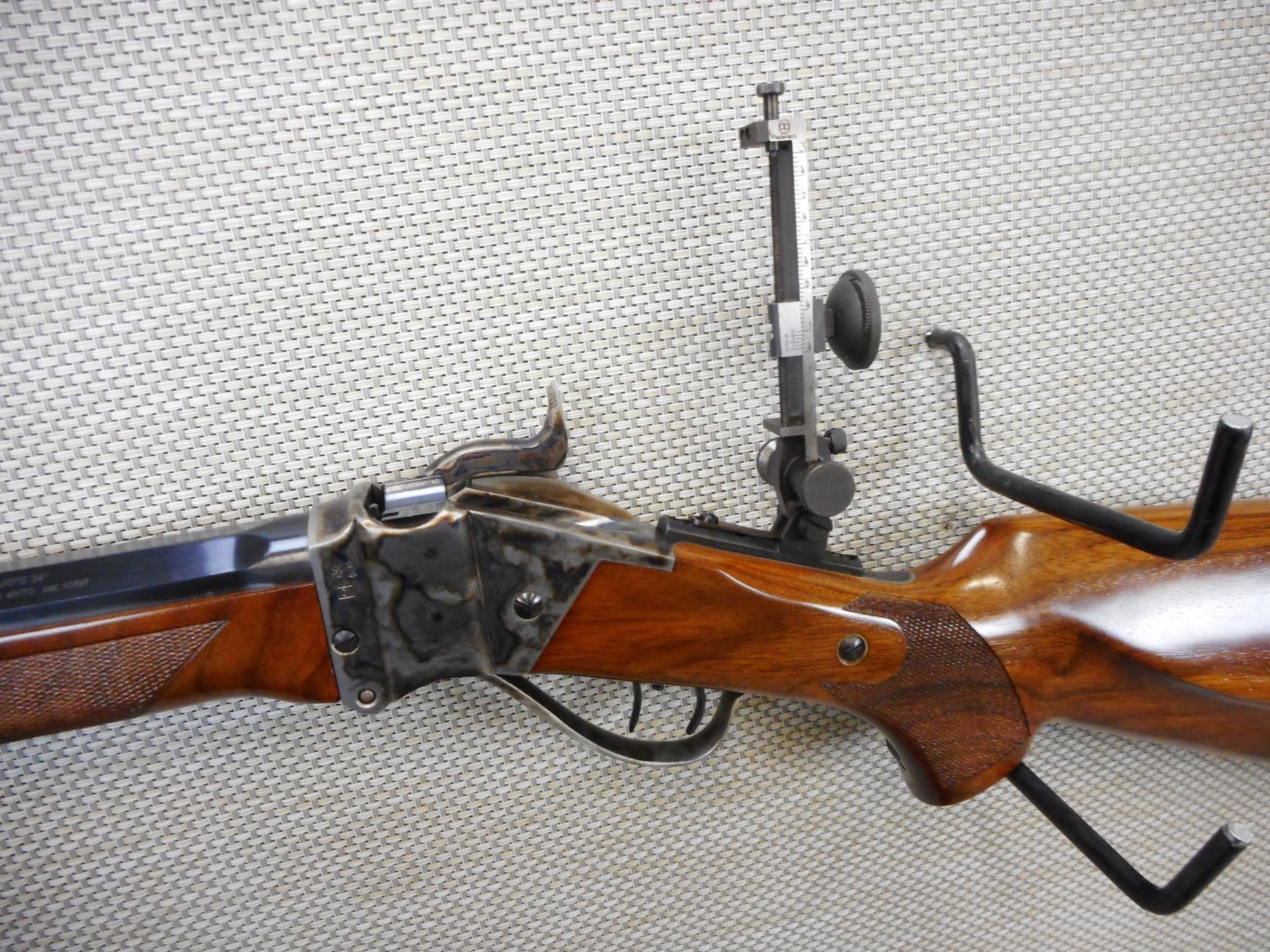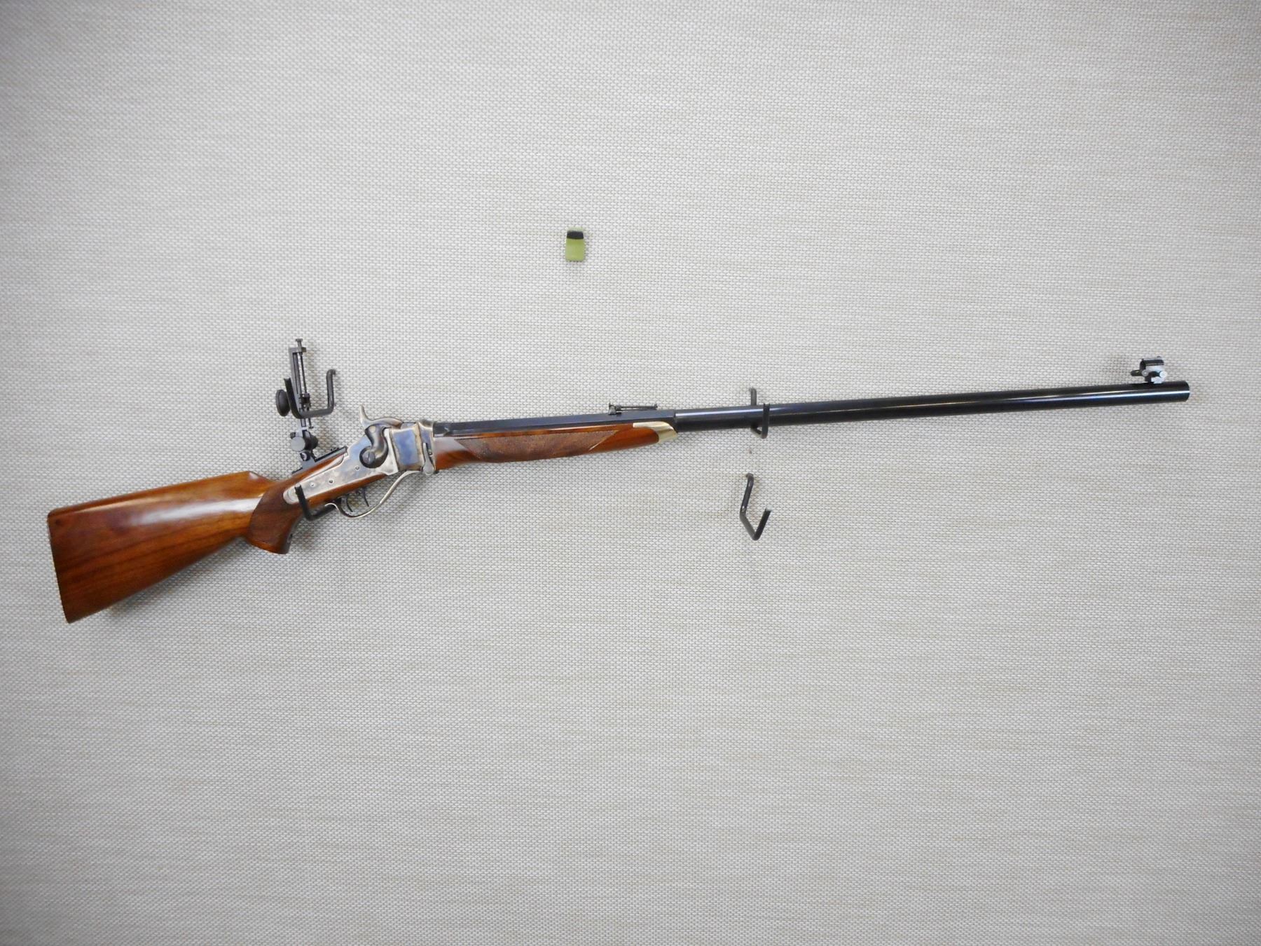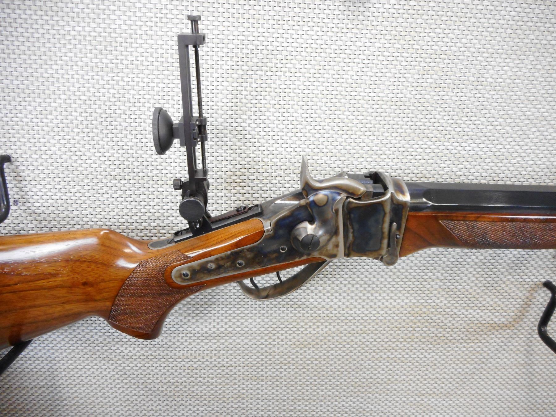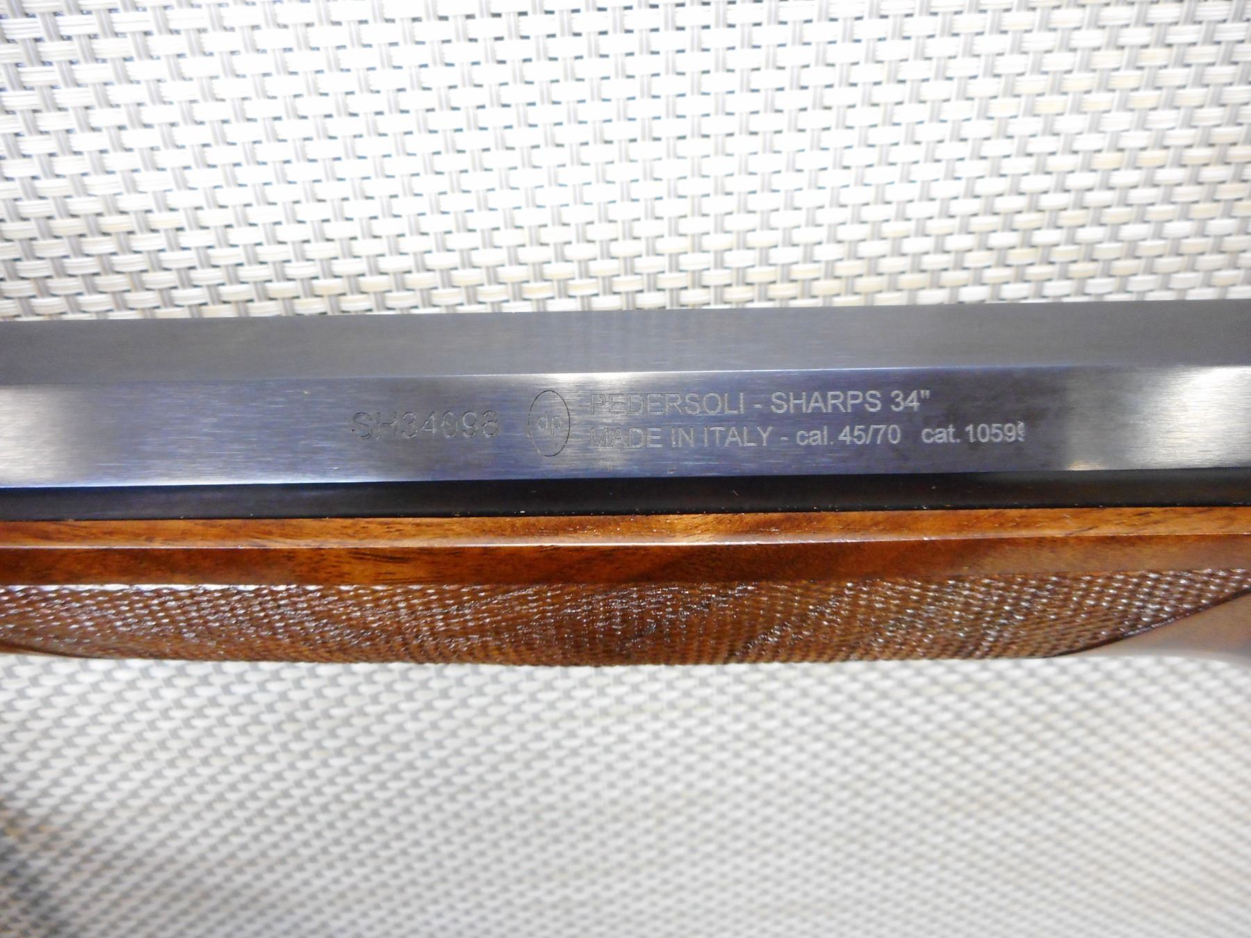 PEDERSOLI SHARPS , MODEL: 1874 LONG RANGE RIFLE REPRODUCTION , CALIBER: 45-70 GOVT , EXCELLENT BORE, ADJUSTABLE FRONT AND REAR SIGHT, VERNIER PEEP APERTURE SIGHT, CHECKERED FOREND AND PISTOL GRIP BUTT STOCK WITH STEEL BUTT PLATE, RICHLY CASE HARDENED RECEIVER, TRIGGER AND TRIGGER GUARD, SET TRIGGER, BRASS FOREND CAP, ROUND TO OCTAGONAL BARREL, RAISED CHEEK PIECE ON BUTT STOCK, SHOWS VERY LITTLE HANDLING MARKS, , ACTION: SINGLE SHOT FALLING BLOCK RIFLE , BARREL LENGTH: 34" , CONDITION: 9/10 , STOCK # 9544 , SERIAL # SH34098 , CLASS: CANADIAN NON RESTRICTED CLASS