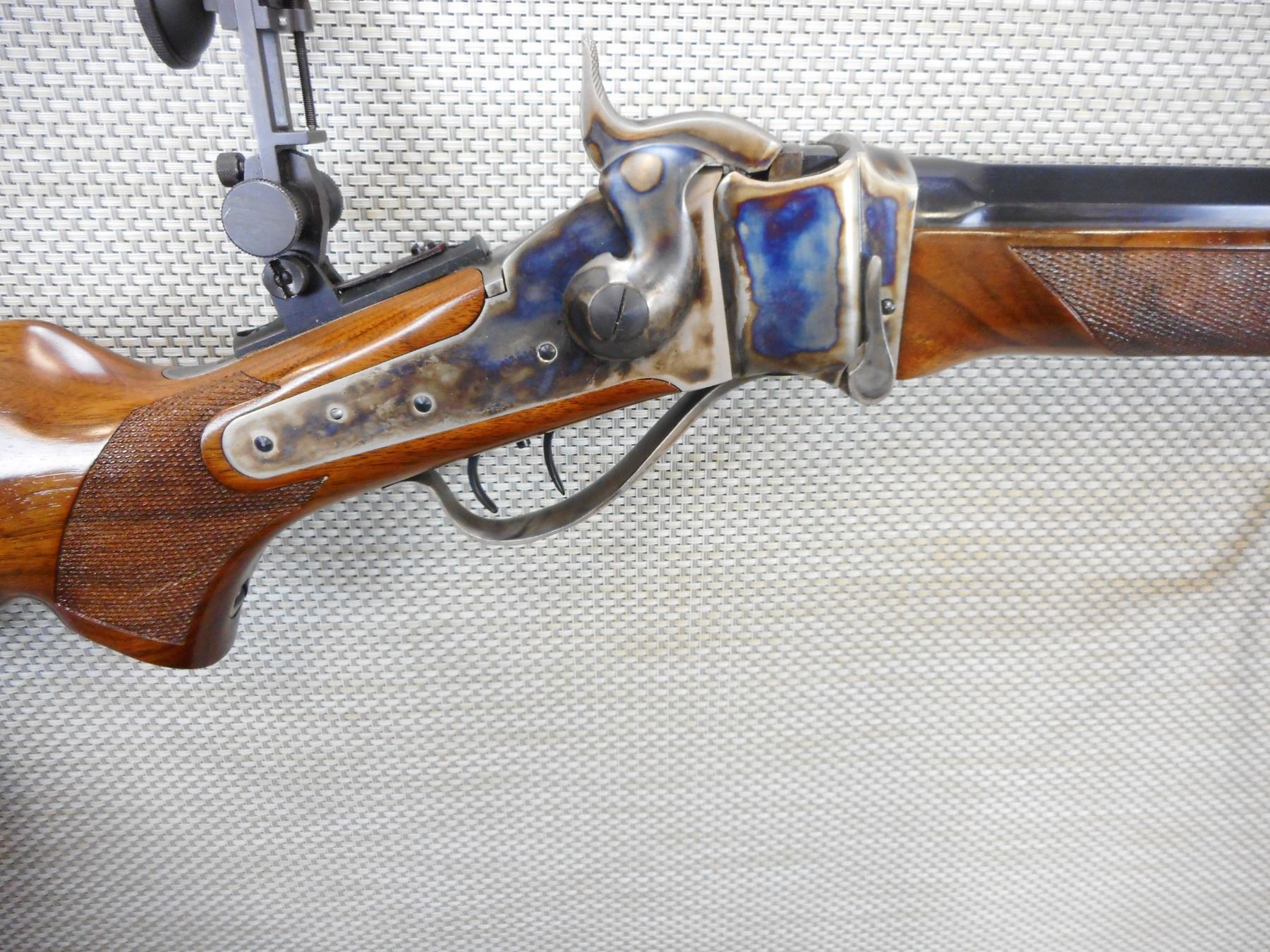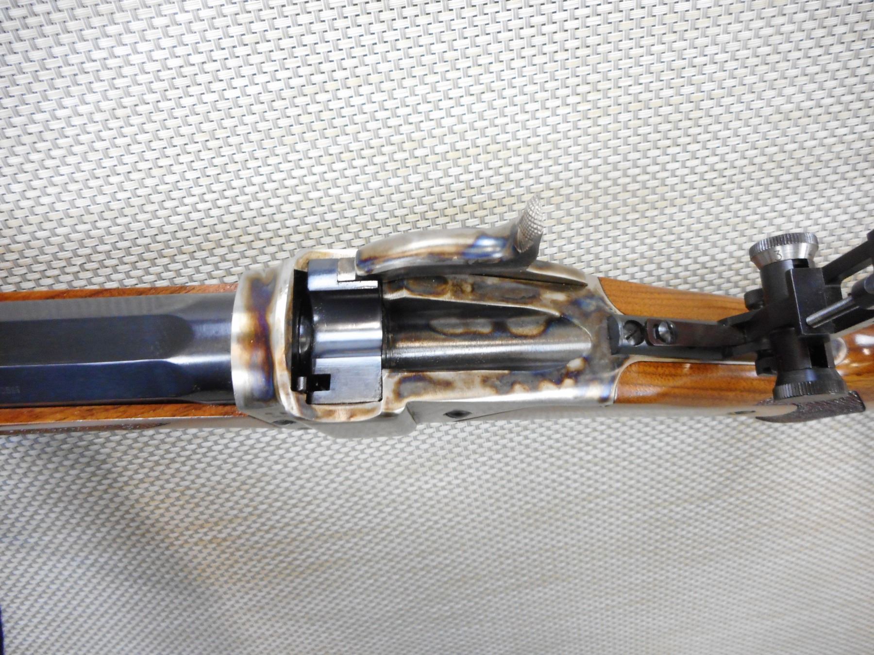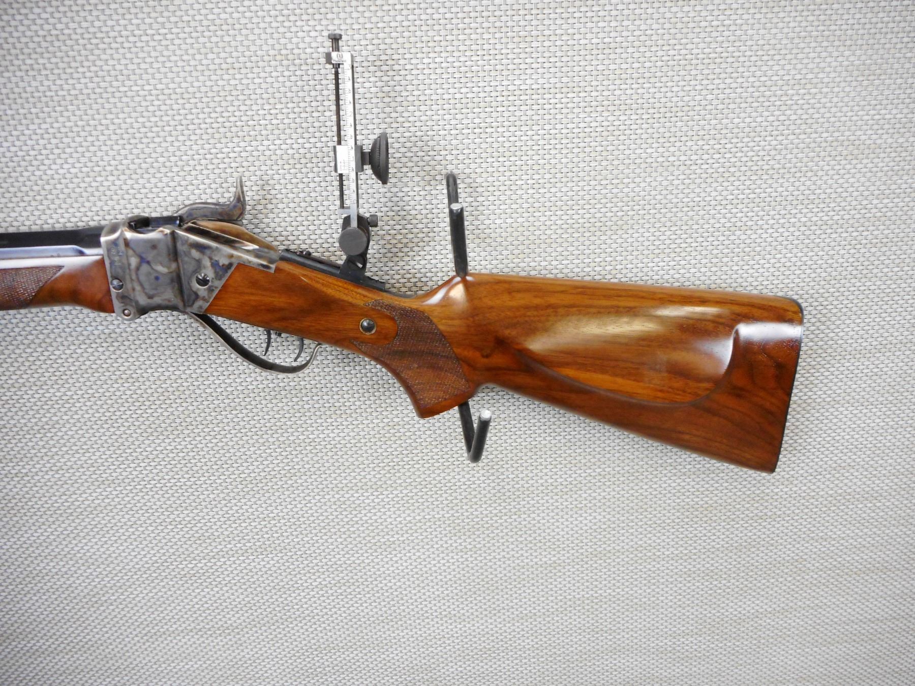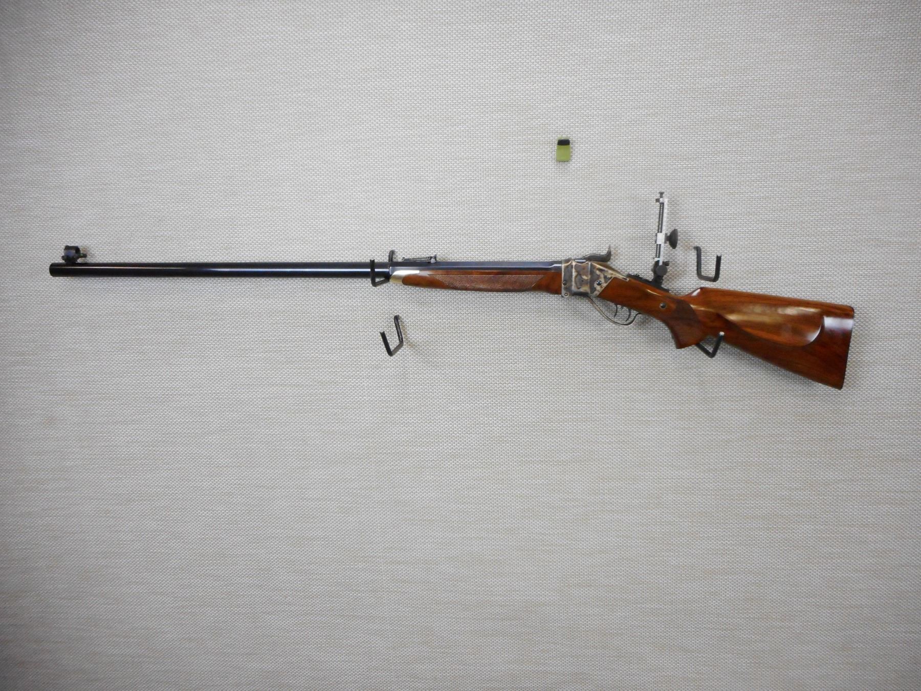 PEDERSOLI SHARPS , MODEL: 1874 LONG RANGE RIFLE REPRODUCTION , CALIBER: 45-70 GOVT , EXCELLENT BORE, ADJUSTABLE FRONT AND REAR SIGHT, VERNIER PEEP APERTURE SIGHT, CHECKERED FOREND AND PISTOL GRIP BUTT STOCK WITH STEEL BUTT PLATE, RICHLY CASE HARDENED RECEIVER, TRIGGER AND TRIGGER GUARD, SET TRIGGER, BRASS FOREND CAP, ROUND TO OCTAGONAL BARREL, RAISED CHEEK PIECE ON BUTT STOCK, SHOWS VERY LITTLE HANDLING MARKS, , ACTION: SINGLE SHOT FALLING BLOCK RIFLE , BARREL LENGTH: 34" , CONDITION: 9/10 , STOCK # 9544 , SERIAL # SH34098 , CLASS: CANADIAN NON RESTRICTED CLASS