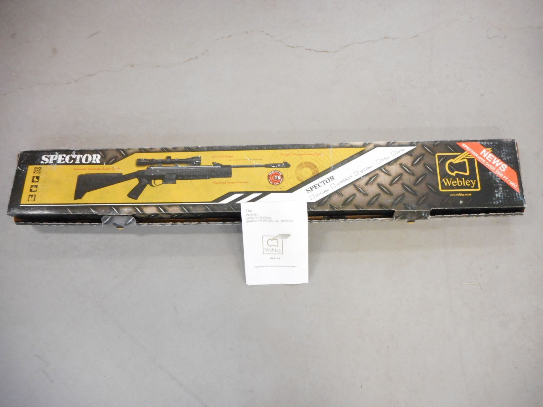 WEBLEY , MODEL: SPORTER, CALIBER: 22 CAL PELLET , COMES WITH BOX, AND MANUAL, BORE IS EXCELLENT, FIBER OPTIC FRONT AND REAR SIGHTS, ONE PIECE SYNTHETIC STOCK, FULL PISTOL GRIP STOCK, VENTED RUBBER RECOIL PAD, FLASE MAGAZINE HOUSING IN THE STOCK, APPEARS TO BE UNFIRED , ACTION: BREAK ACTION SINGLE SHOT AIR RIFLE , BARREL LENGTH: 17" , CONDITION: 9+/10 , STOCK # 9556 , SERIAL # 091504312 , CLASS: CANADIAN NON RESTRICTED CLASS