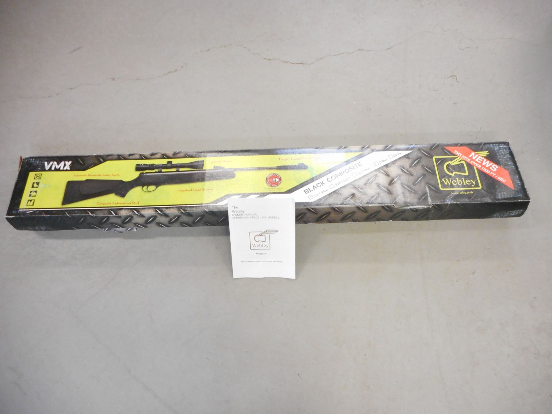 WEBLEY , MODEL: VMX -BLACK , CALIBER: 177 CAL PELLET , COMES WITH BOX, AND MANUAL, EXCELLENT BORE, ONE PIECE SYNTHETIC BLACK STOCK WITH VENTED RUBBER RECOIIL PAD, APPEARS NEW IN THE BOX WITH LABEL , ACTION: BREAK ACTION SINGLE SHOT AIR RIFLE , BARREL LENGTH: 17" , CONDITION: NEW IN BOX , STOCK # 9558 , SERIAL # 061507132 , CLASS: CANADIAN NON RESTRICTED CLASS