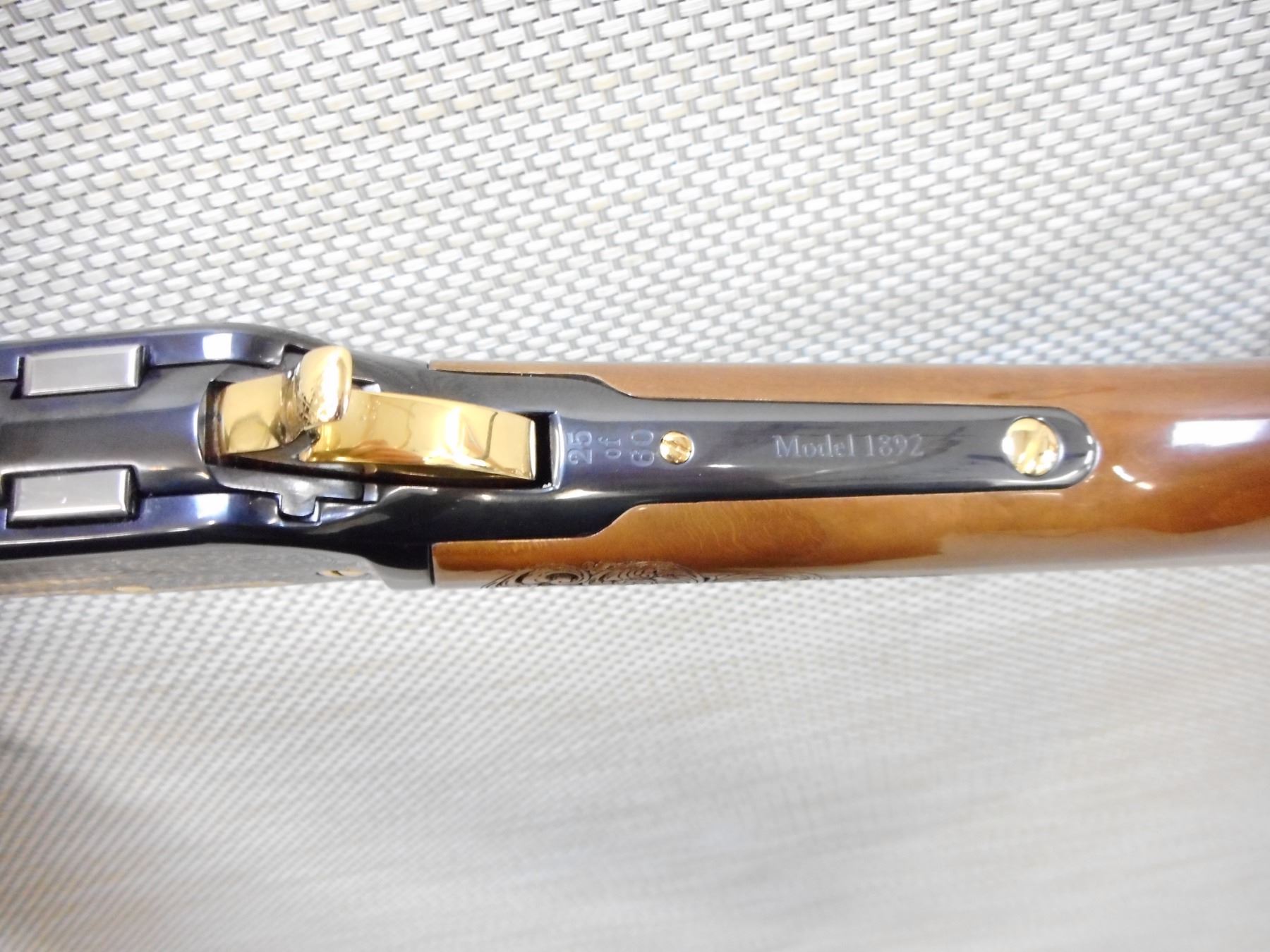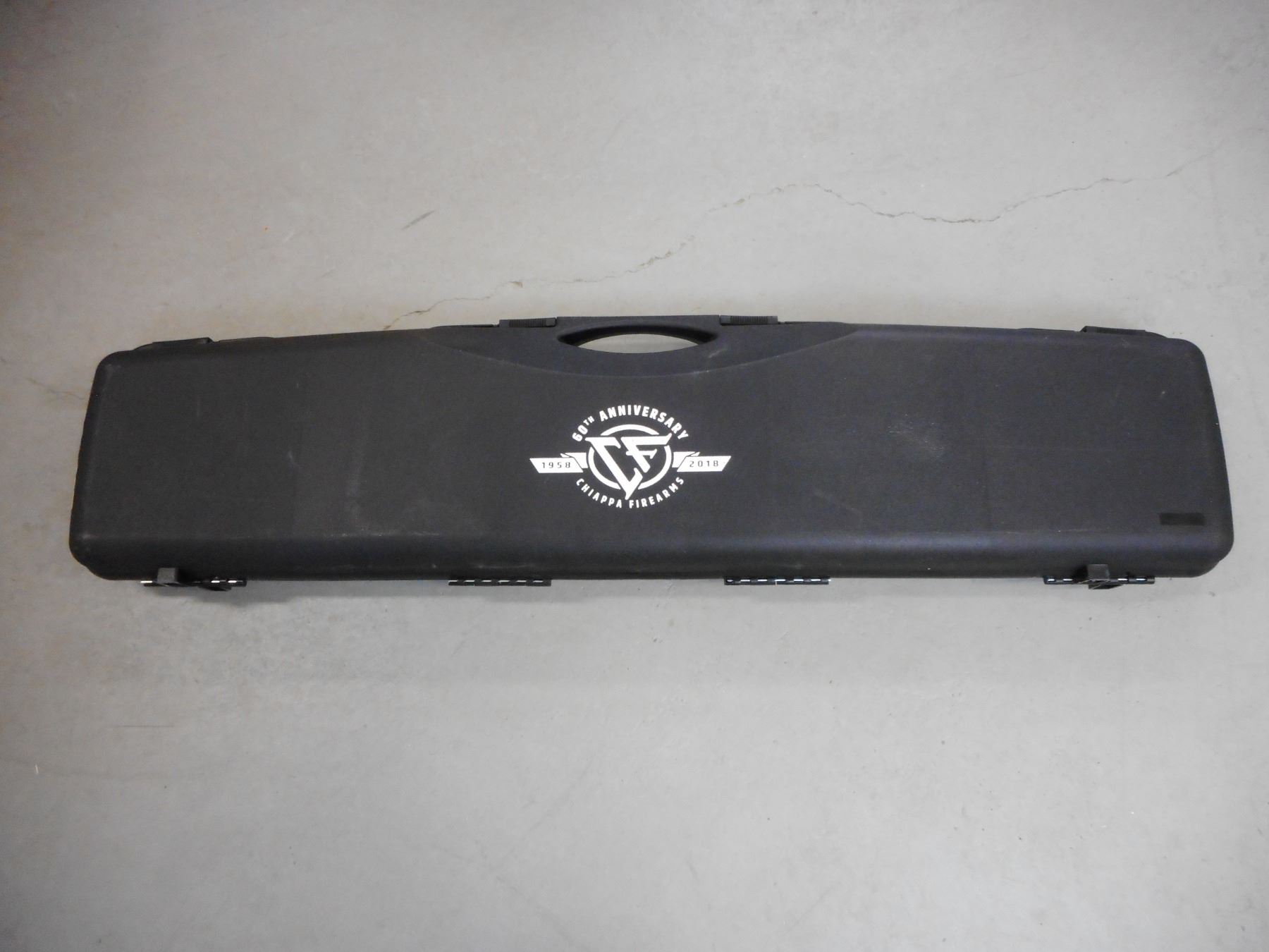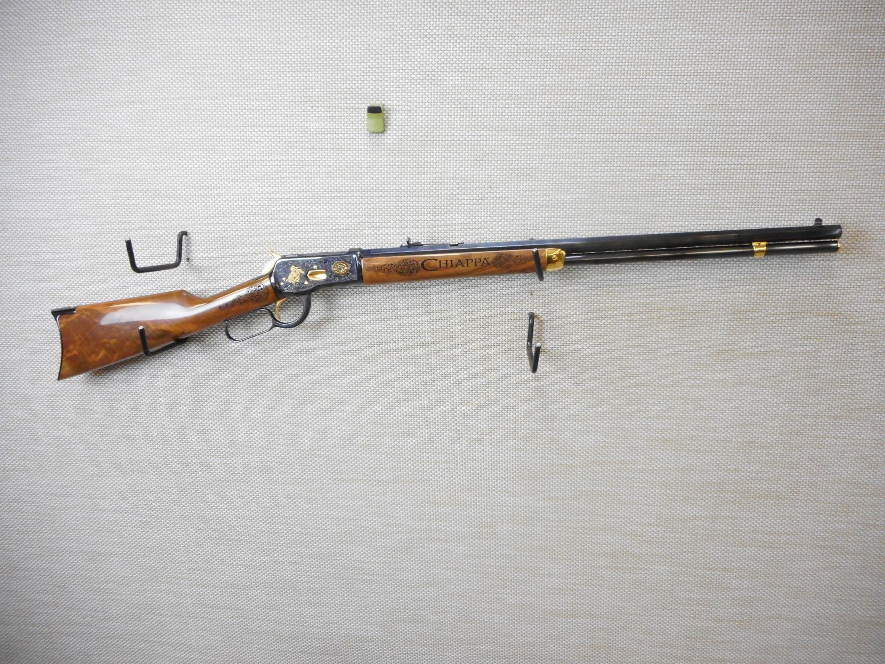 RARE, CHIAPPA, MODEL: 60TH ANNIVERSARY, CALIBER: 45 COLT , COMES NEW IN A CASE, MANUAL AND SOCK, 60TH ANNIVERSARY THAT IS FASHIONED ON THE WINCHESTER MODEL 1892 LEVER ACTION RIFLE, LASER ENGRAVING MARKINGS ON THE RECEIVER THAT SAY 60TH ANNIVERSARY CHIAPPA FIREARMS 1958-2018, HAND FINISH GLOSS WALNUT STOCKS, BUCKHORN REAR SIGHT, RAMP FRONT SIGHT, GOLD ACCENT MAG TUBE CAP BARREL BAND FOREND CAP LOADING GATE HAMMER AND TRIGGER ALONG WITH NUMEROUS GOLD SCREWS, OCTAGONAL BARREL, CRESCENT BUTT PLATE , ACTION: LEVER ACTION RIFLE , BARREL LENGTH: 24" , CONDITION: NEW IN CASE , STOCK # 9560 , SERIAL # 18B06889 , CLASS: CANADIAN NON RESTRICTED CLASS