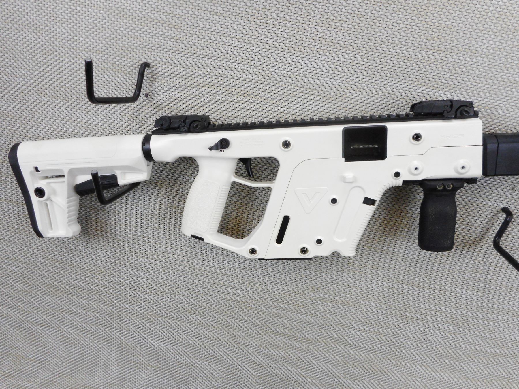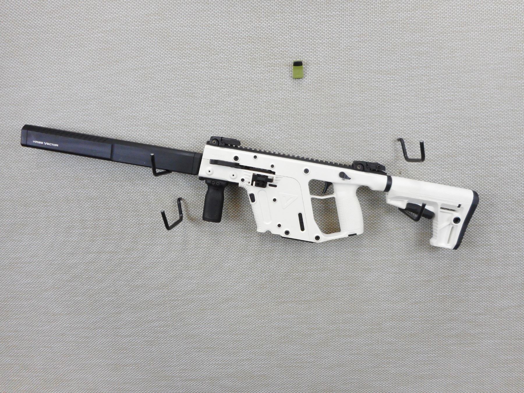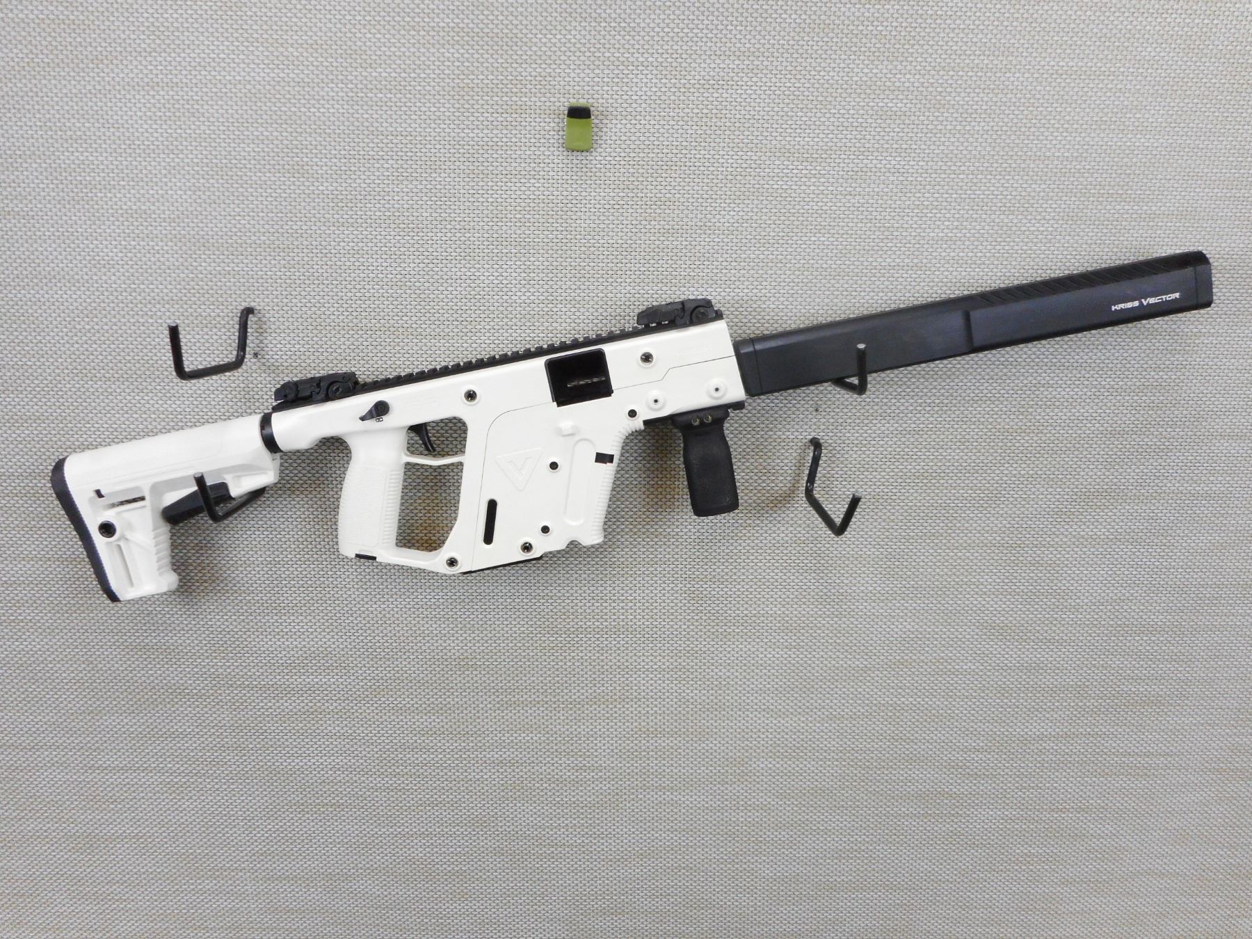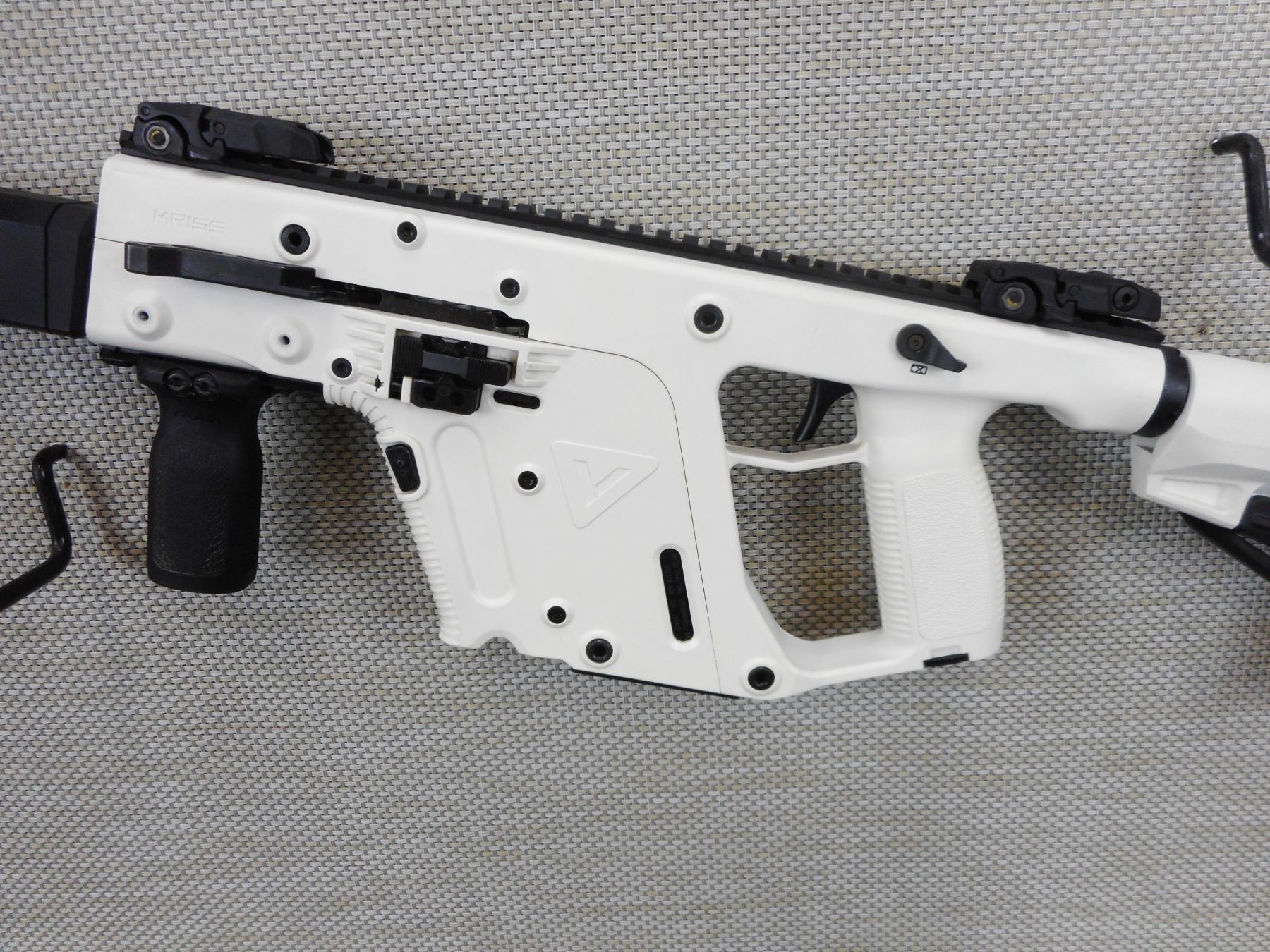 KRISS VECTOR, MODEL: CRB, CALIBER: 45 ACP , DOES NOT COME WITH MAGAZINE, TWO PIECE MODULAR DESIGN, WHITE SYNTHETIC STOCK WITH FULLY SHROUDED BARREL, FLIP FRONT AND REAR SIGHTS ON FULL ACCESSORY RAIL, PISTOL GRIP WITH COLLAPSABLE BUTT STOCK, EXCELLENT BORE, SHOWS VERY LITTLE HANDLING MARKS , ACTION: SEMI AUTOMATIC RIFLE , BARREL LENGTH: 472MM , CONDITION: 8/10 , STOCK # 9561 , SERIAL # 45C019409 , CLASS: CANADIAN NON RESTRICTED CLASS