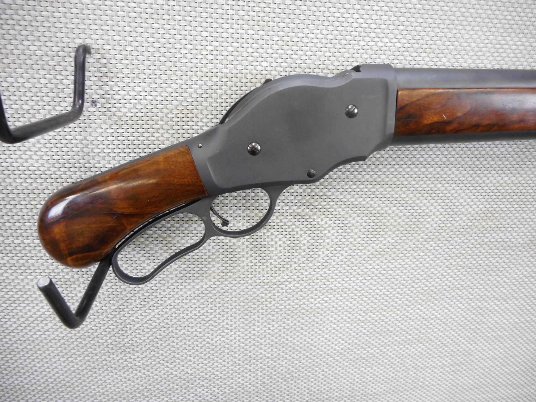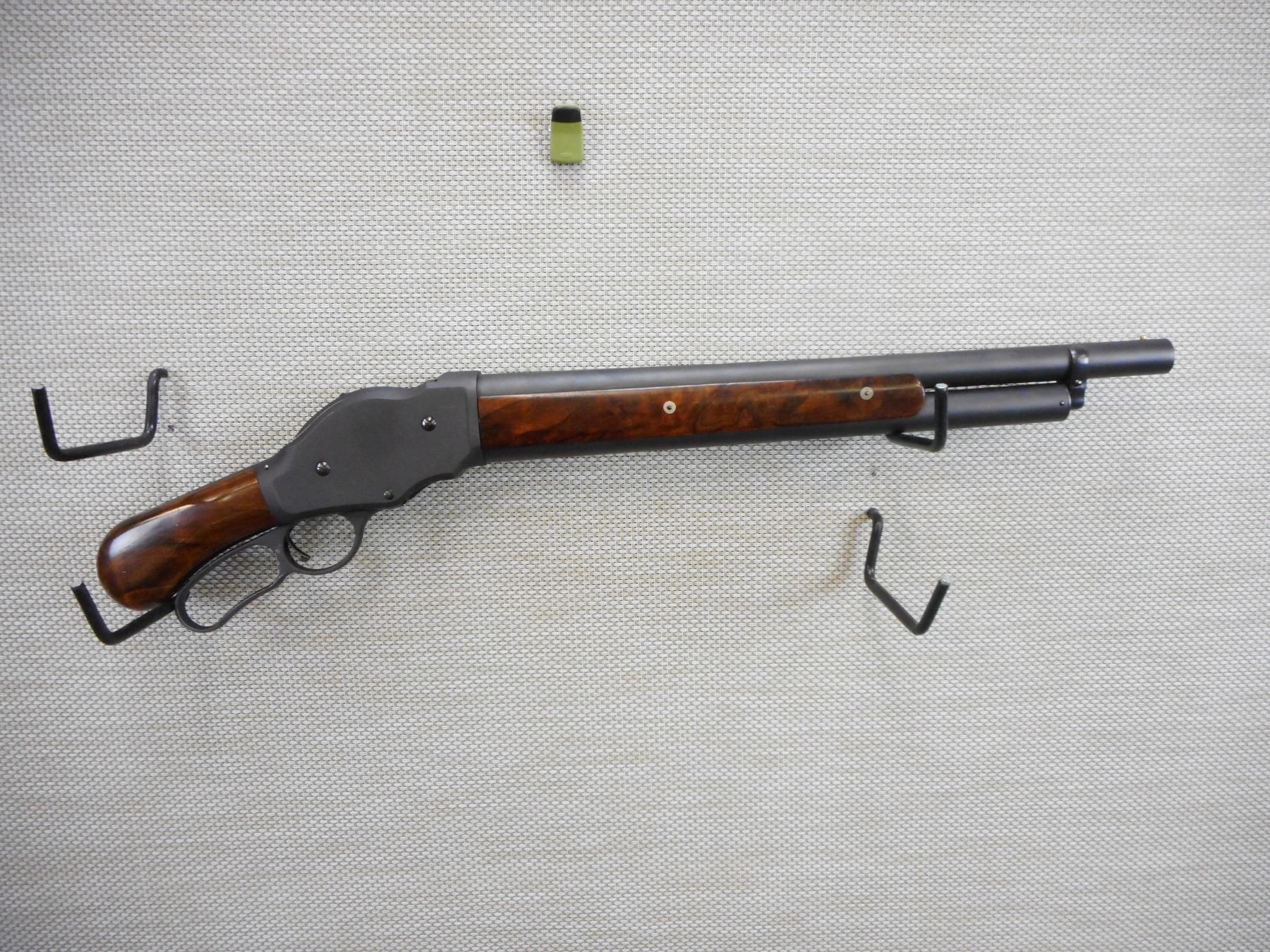 CHIAPPA, MODEL: 1887 REPRODUCTION MARES LEG , CALIBER: 12GA X 3" , HAS A CYLINDER BORE, PLAIN WOOD FOREND AND MARES LEG BUTT STOCK, BEAD FRONT SIGHT, BORE IS GOOD,SHOWS VERY LITTLE HANDLING MARKS , ACTION: LEVER ACTION SHOTGUN , BARREL LENGTH: 18 1/2" , CONDITION: 9/10 , STOCK # 9565 , SERIAL # 8700978 , CLASS: CANADIAN NON RESTRICTED CLASS