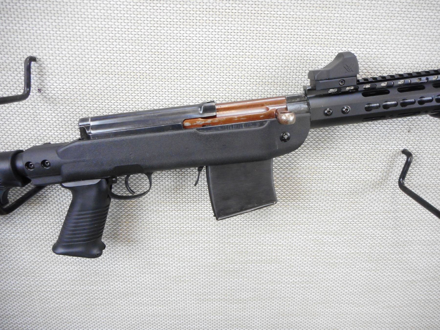 WWII ERA, TOKAREV , MODEL: SVT40, CALIBER: 7.62 X 54R , COMES WITH A MAGAZINE, DATED 1942, MATCHING BOLT AND RECEIVER, FULL LENGTH RAIL SYSTEM, GHOST RING REAR SIGHT, VENTED BARREL SHROUD, TAPCO SYNTHETIC STOCK WITH FULL PISTOL GRIP AND COLLAPSABLE BUTT, SLING SWIVEL LOOPS, SOME LIGHT SURFACE PITTING ON THE BOLT KNOB, BORE IS GOOD, THIS IS AN EXTENSIVLY CUSTOMIZED MILITARY RIFLE , ACTION: SEMI AUTOMATIC RIFLE , BARREL LENGTH: 20" , CONDITION: 7/10 , STOCK # 9567 , SERIAL # C61024 , CLASS: CANADIAN NON RESTRICTED CLASS