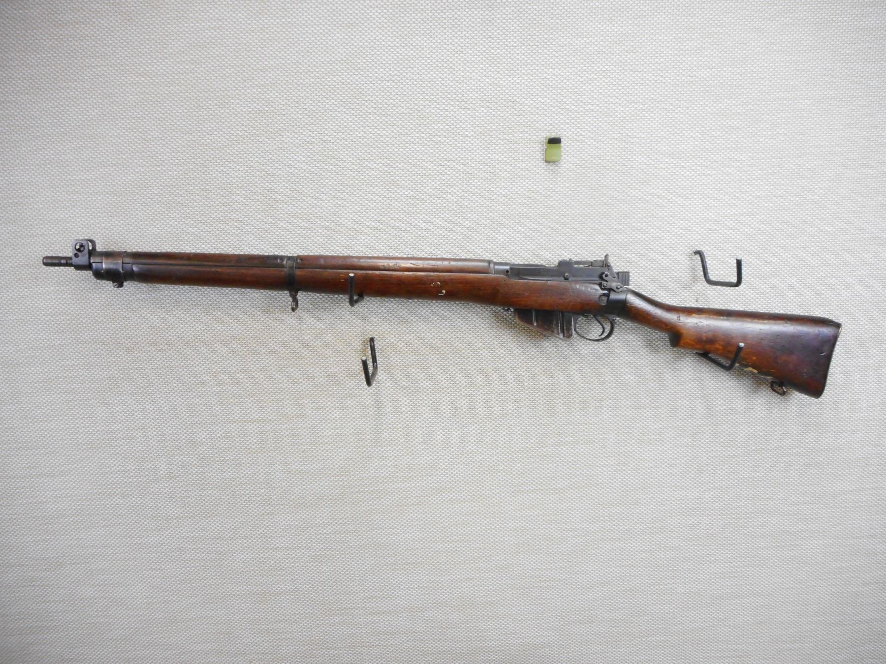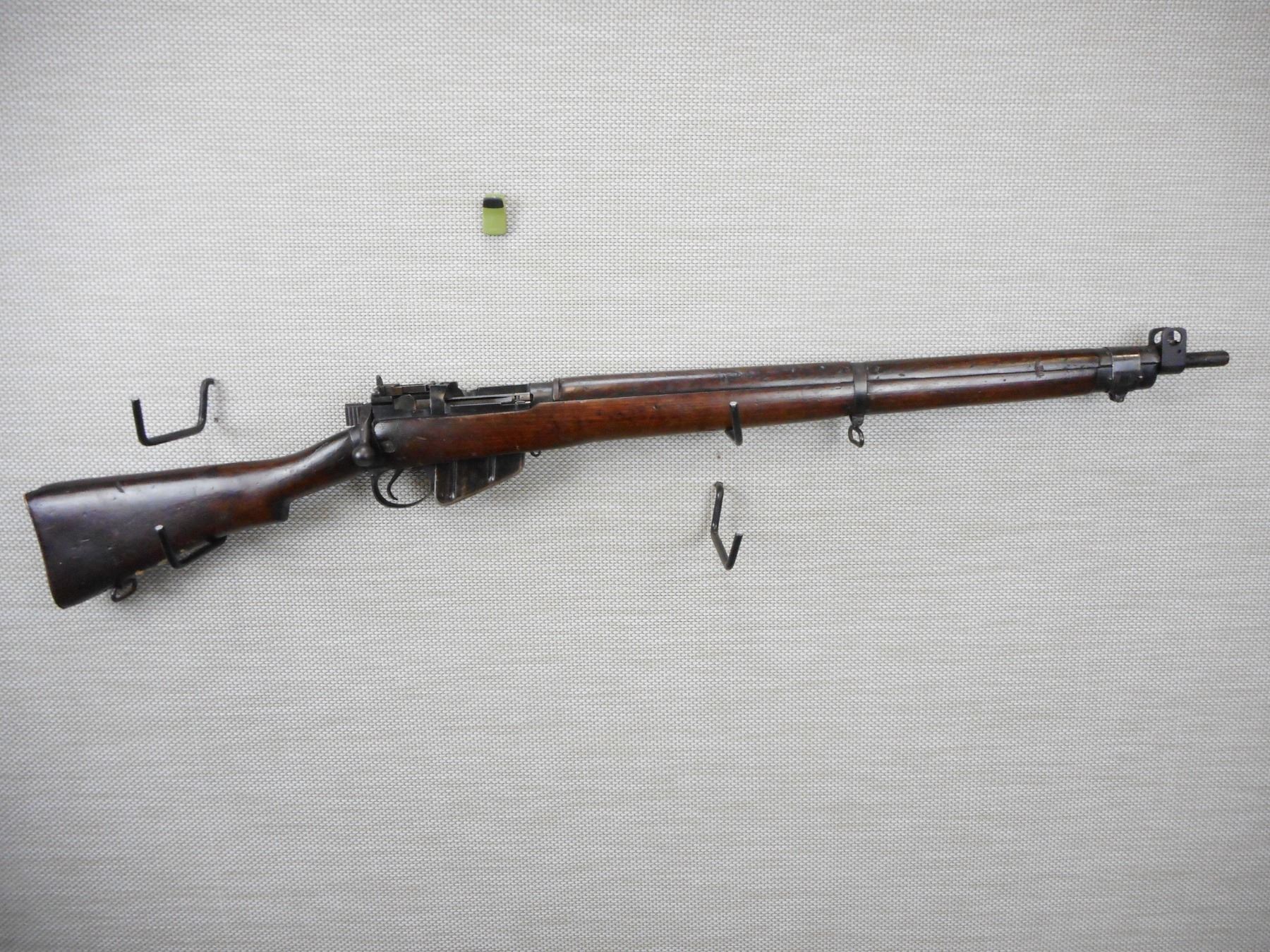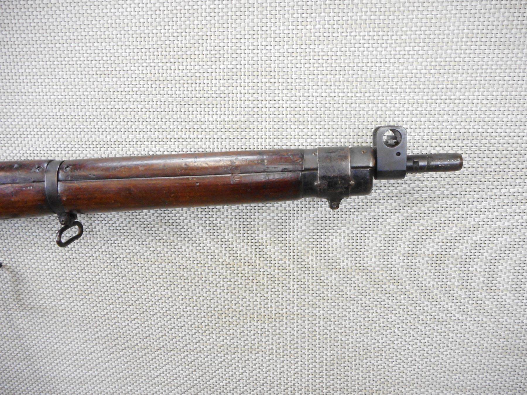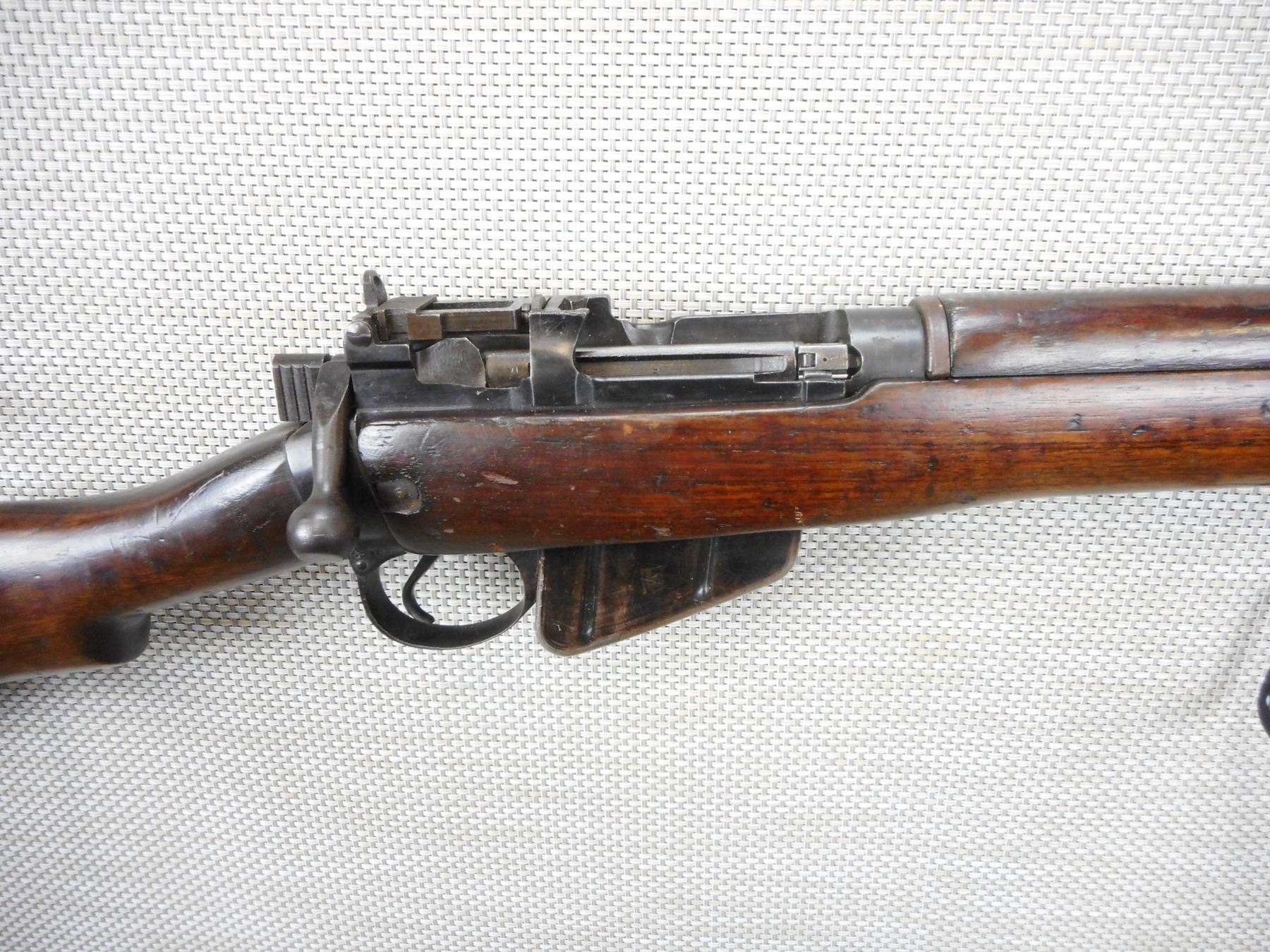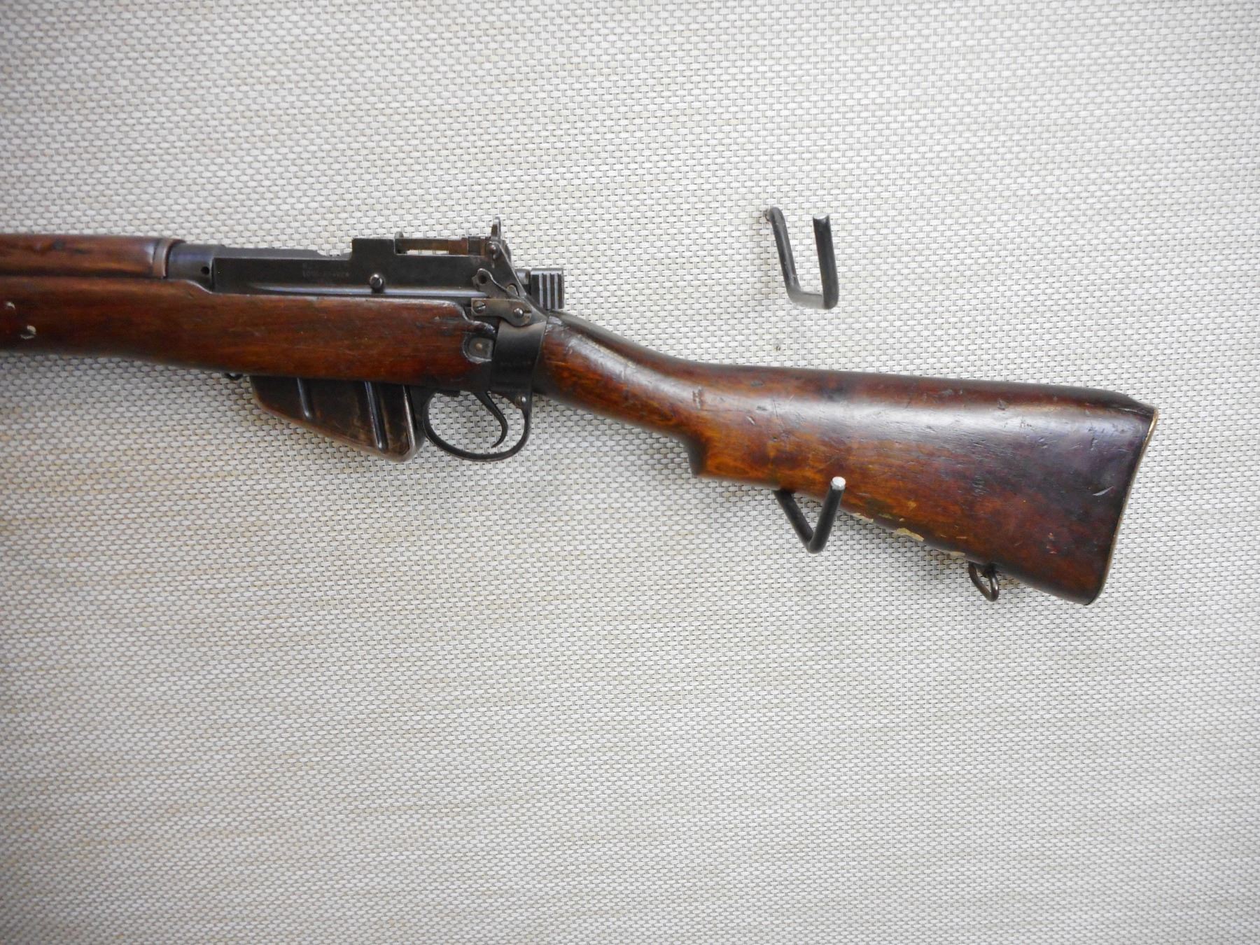 WWII ERA, LEE ENFIELD, MODEL: NO 4 MKI* LONG BRANCH , CALIBER: 303 BR , COMES WITH A MAGAZINE, WWII ERA DATED 1943, HAS A POSSIBLE REPLACED BRASS BUTT PLATE, NOT STEEL BUTT PLATE, BOLT AND RECEIVER DON'T MATCH BY SERIAL #, RETAINS FULL MILITARY CONFIGURATION AND SIGHTS, SLING SWIVEL LOOPS, SHOWS SOME HANDLING MARKS, BORE IS VERY GOOD , ACTION: BOLT ACTION RIFLE , BARREL LENGTH: 25" , CONDITION: 8/10 , STOCK # 9573 , SERIAL # 36L8907 , CLASS: CANADIAN NON RESTRICTED CLASS