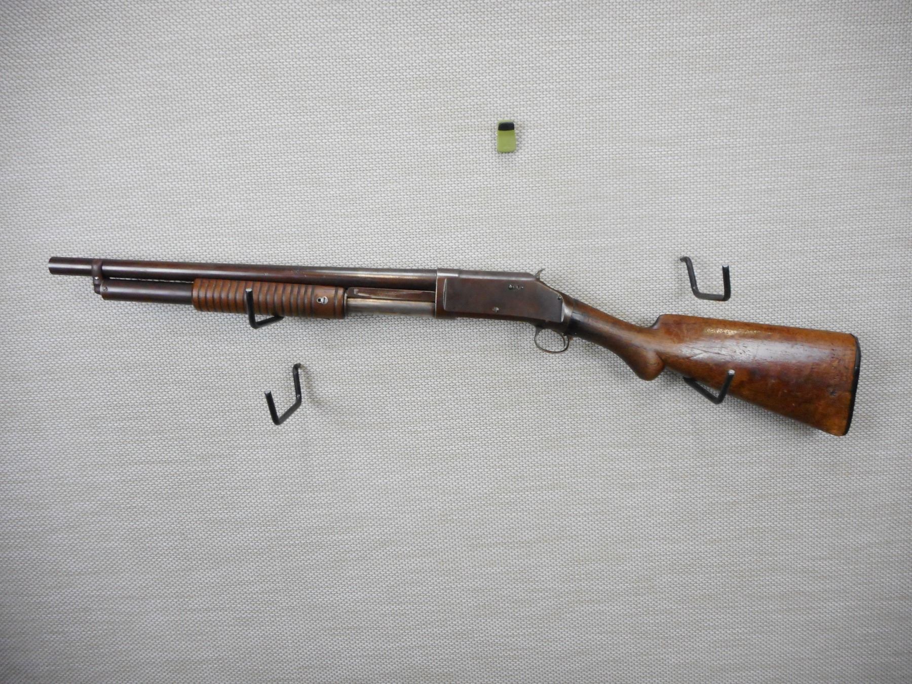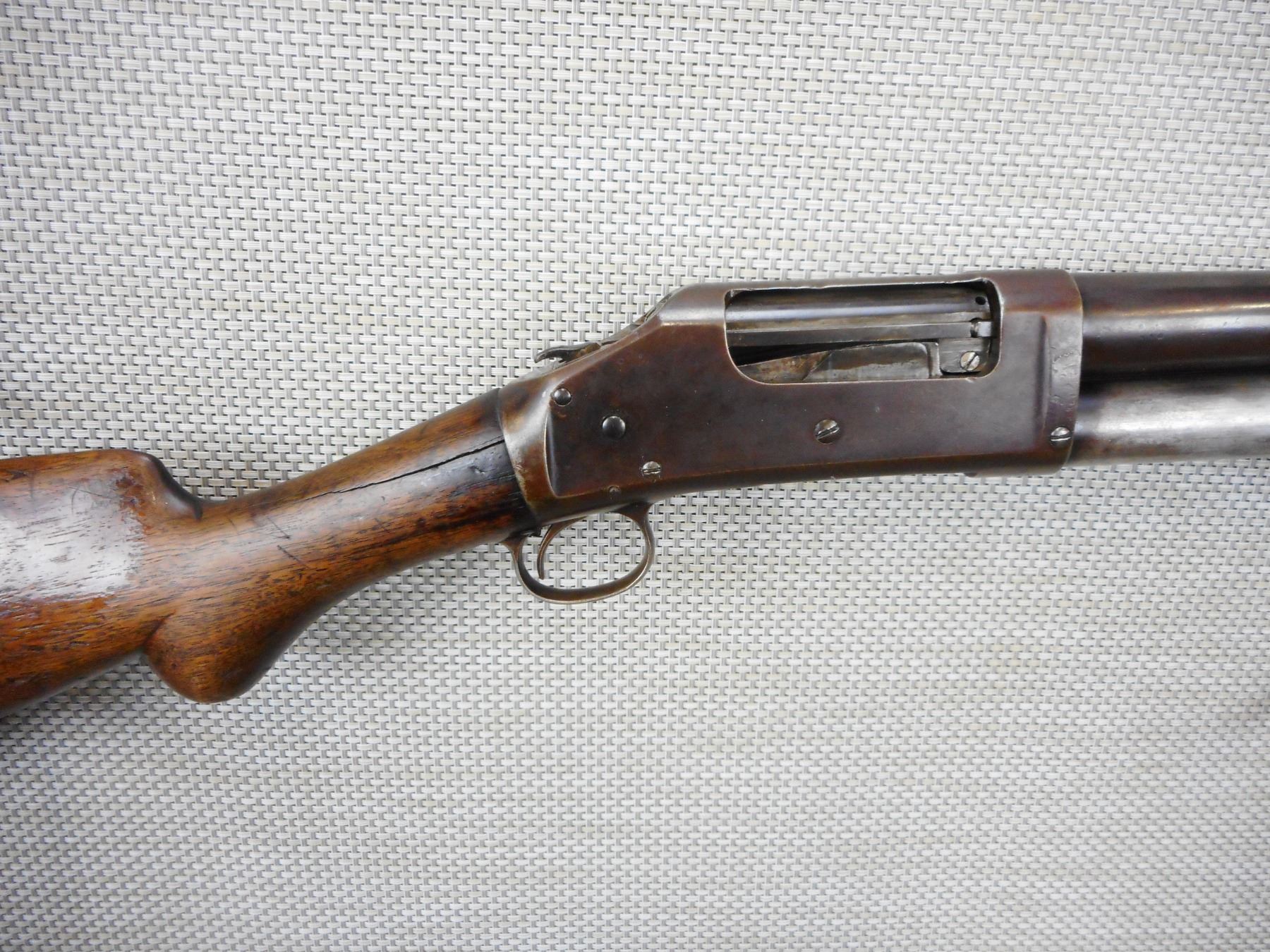 WINCHESTER, MODEL: 1897, CALIBER: 12GA , MANUFACTURED IN 1903, BORE IS VERY GOOD, CYLINDER BORE, BARREL HAS BEEN REDUCED, NO FRONT SIGHT, WOOD FOREND AND SEMI PISTOL GRIP BUTT STOCK THAT HAS BEEN CRACKED AT THE WRIST, REPLACED RUBBER RECOIL PAD, SHOWS EXTENSIVE HANDLING MARKS, , ACTION: PUMP ACTION SHOTGUN , BARREL LENGTH: 18 1/2" , CONDITION: 4/10 , STOCK # 9574 , SERIAL # C245017 , CLASS: CANADIAN NON RESTRICTED CLASS