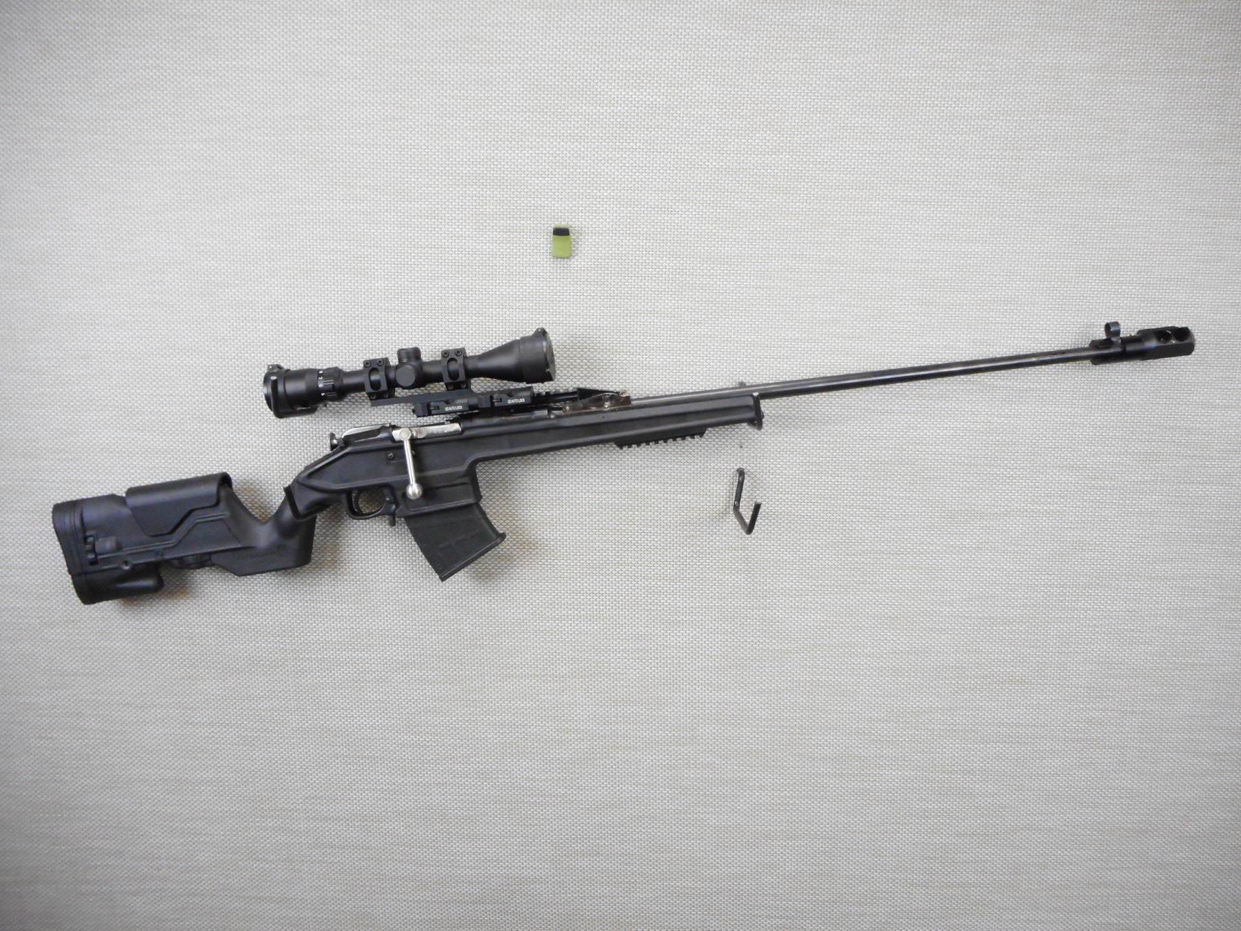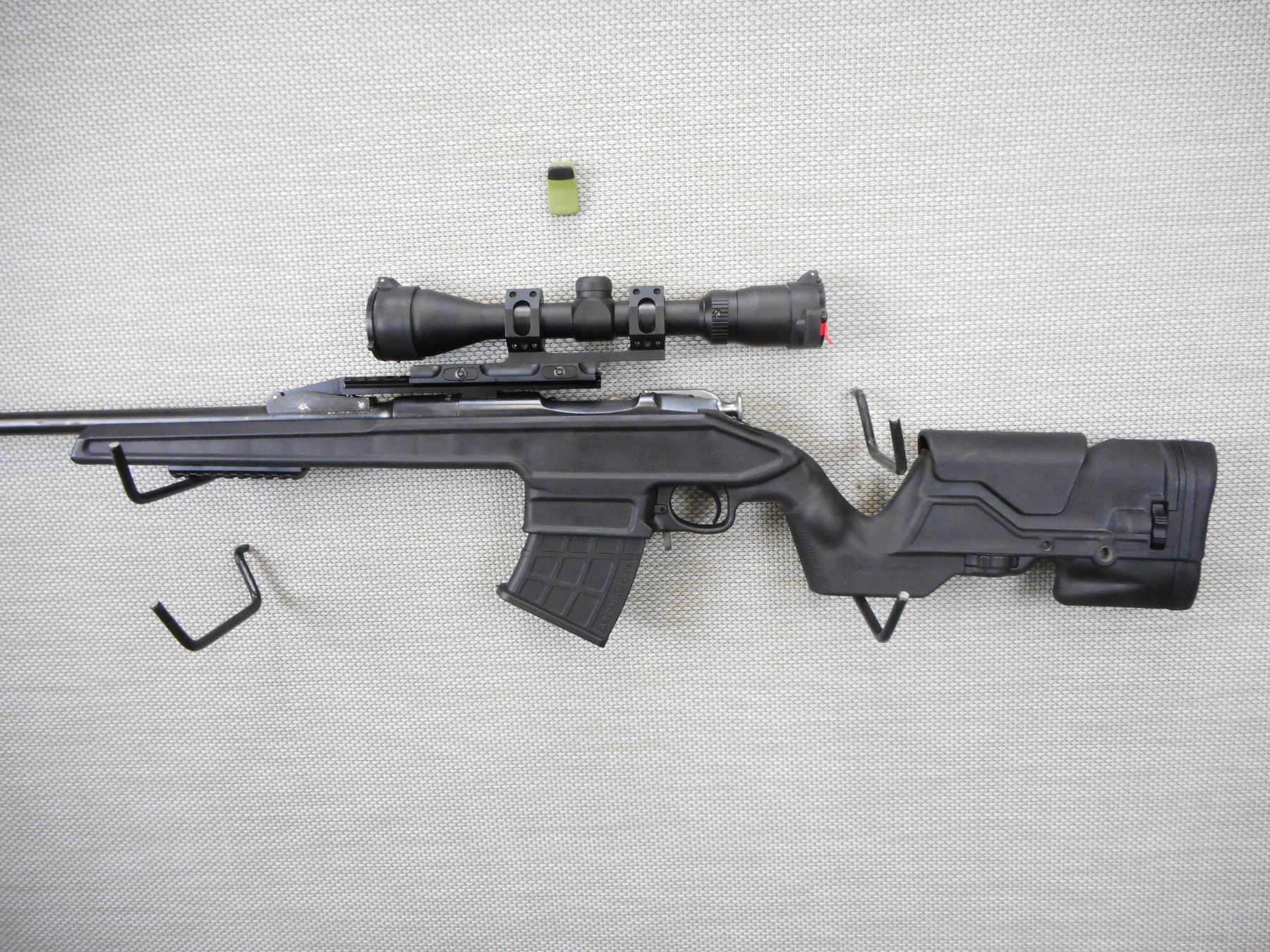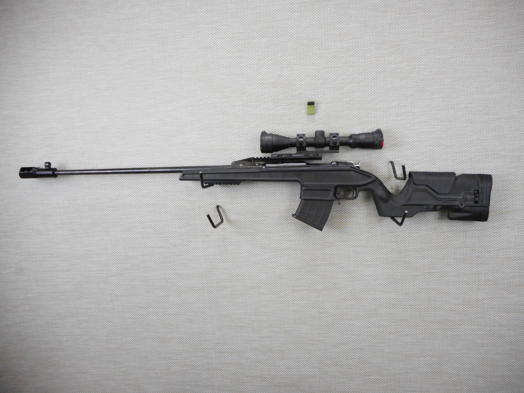 MOSIN NAGANT , MODEL: CUSTOM 91/30, CALIBER: 7.62 X 54R , COMES WITH 2 MAGAZINES AND A BIPOD, BORE IS VERY GOOD, MUZZLE BREAK, OD AUTO LOCK SCOPE MOUNTING SYSTEM ON AN ACCESSORY RAIL WITH A HOODED FRONT AND MUZZLE BREAK, THERE IS A 3 - 9 SCOPE WITH BUTLER CREEK COVERS, ARCHANGEL SYNTHETIC STOCK WITH ADJUSTABLE CHEEK PIECE AND RUBBER RECOIL PAD, CUSTOM TURN DOWN BOLT KNOB, SHOWS SOME HANDLING MARKS , ACTION: BOLT ACTION RIFLE , BARREL LENGTH: 29" , CONDITION: 7/10 , STOCK # 9577 , SERIAL # 475 , CLASS: CANADIAN NON RESTRICTED CLASS
