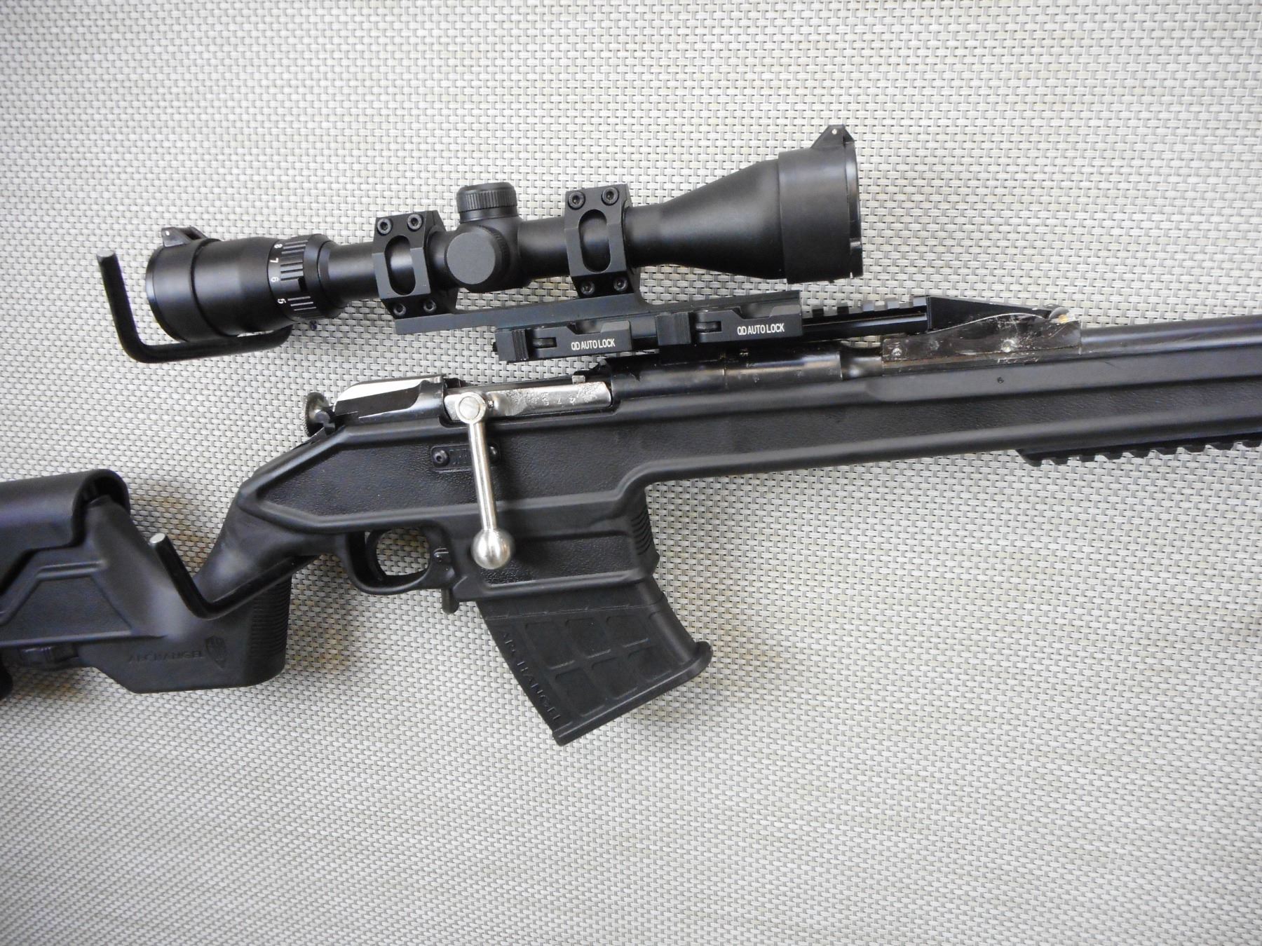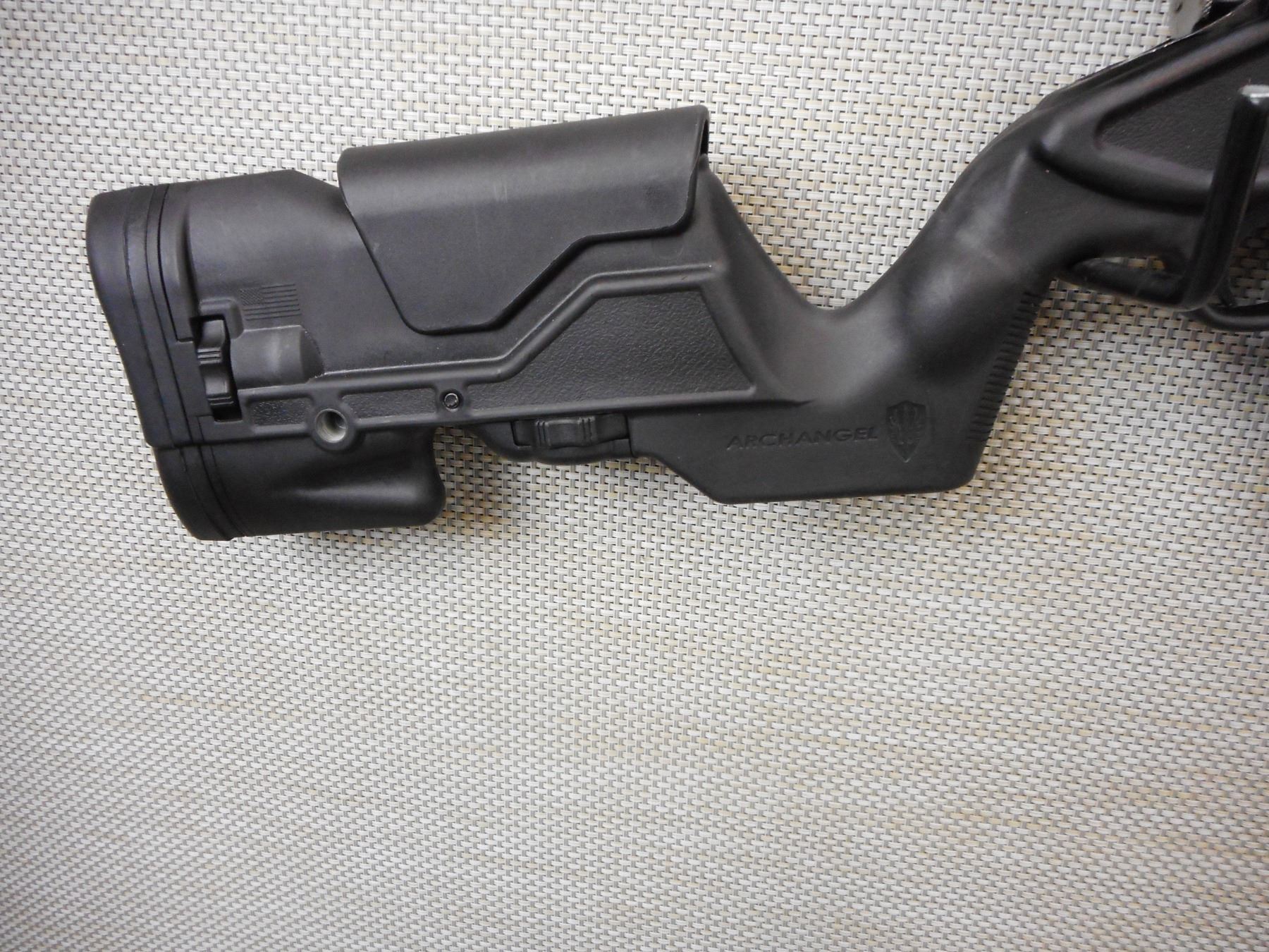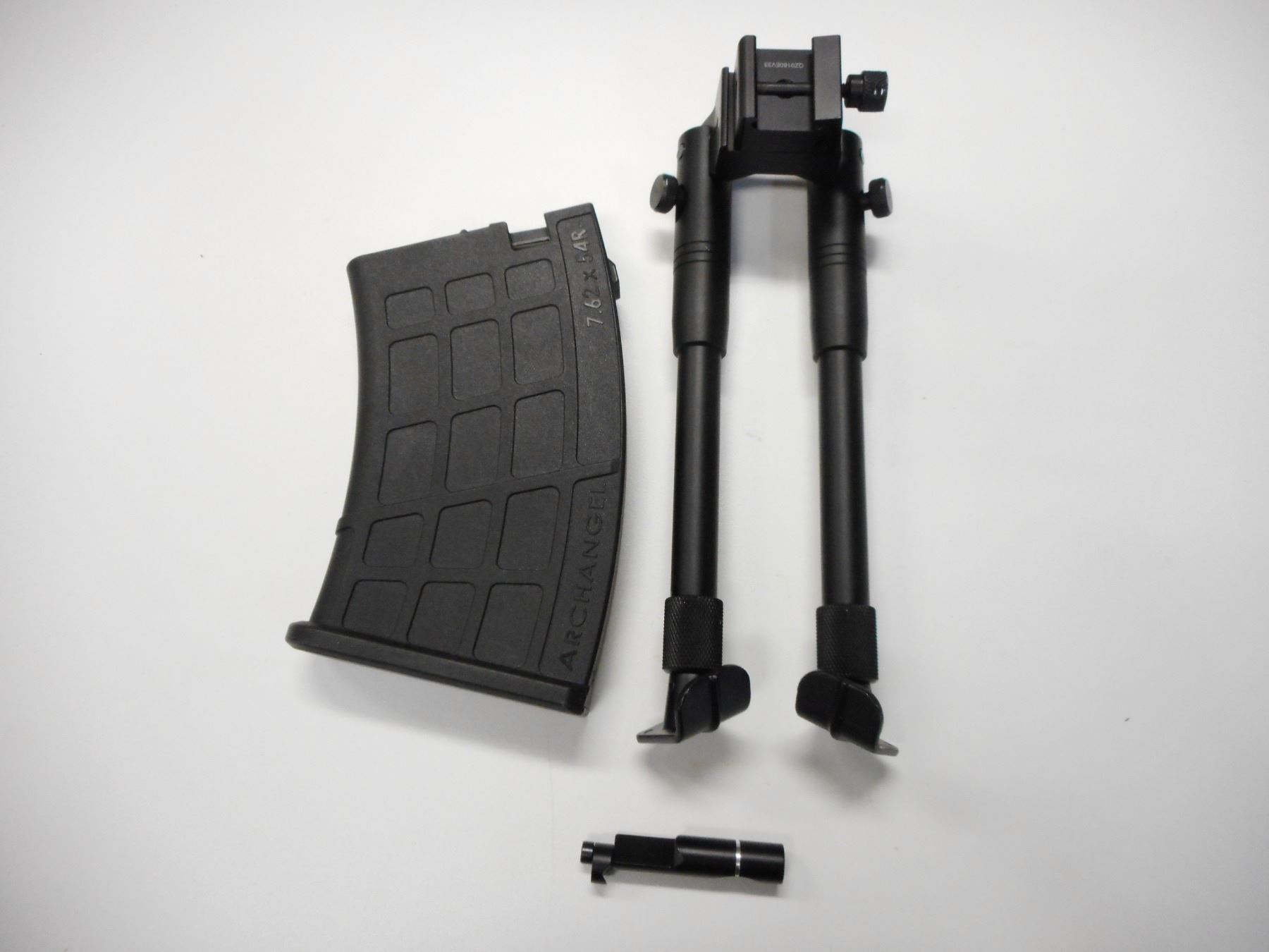 MOSIN NAGANT , MODEL: CUSTOM 91/30, CALIBER: 7.62 X 54R , COMES WITH 2 MAGAZINES AND A BIPOD, BORE IS VERY GOOD, MUZZLE BREAK, OD AUTO LOCK SCOPE MOUNTING SYSTEM ON AN ACCESSORY RAIL WITH A HOODED FRONT AND MUZZLE BREAK, THERE IS A 3 - 9 SCOPE WITH BUTLER CREEK COVERS, ARCHANGEL SYNTHETIC STOCK WITH ADJUSTABLE CHEEK PIECE AND RUBBER RECOIL PAD, CUSTOM TURN DOWN BOLT KNOB, SHOWS SOME HANDLING MARKS , ACTION: BOLT ACTION RIFLE , BARREL LENGTH: 29" , CONDITION: 7/10 , STOCK # 9577 , SERIAL # 475 , CLASS: CANADIAN NON RESTRICTED CLASS