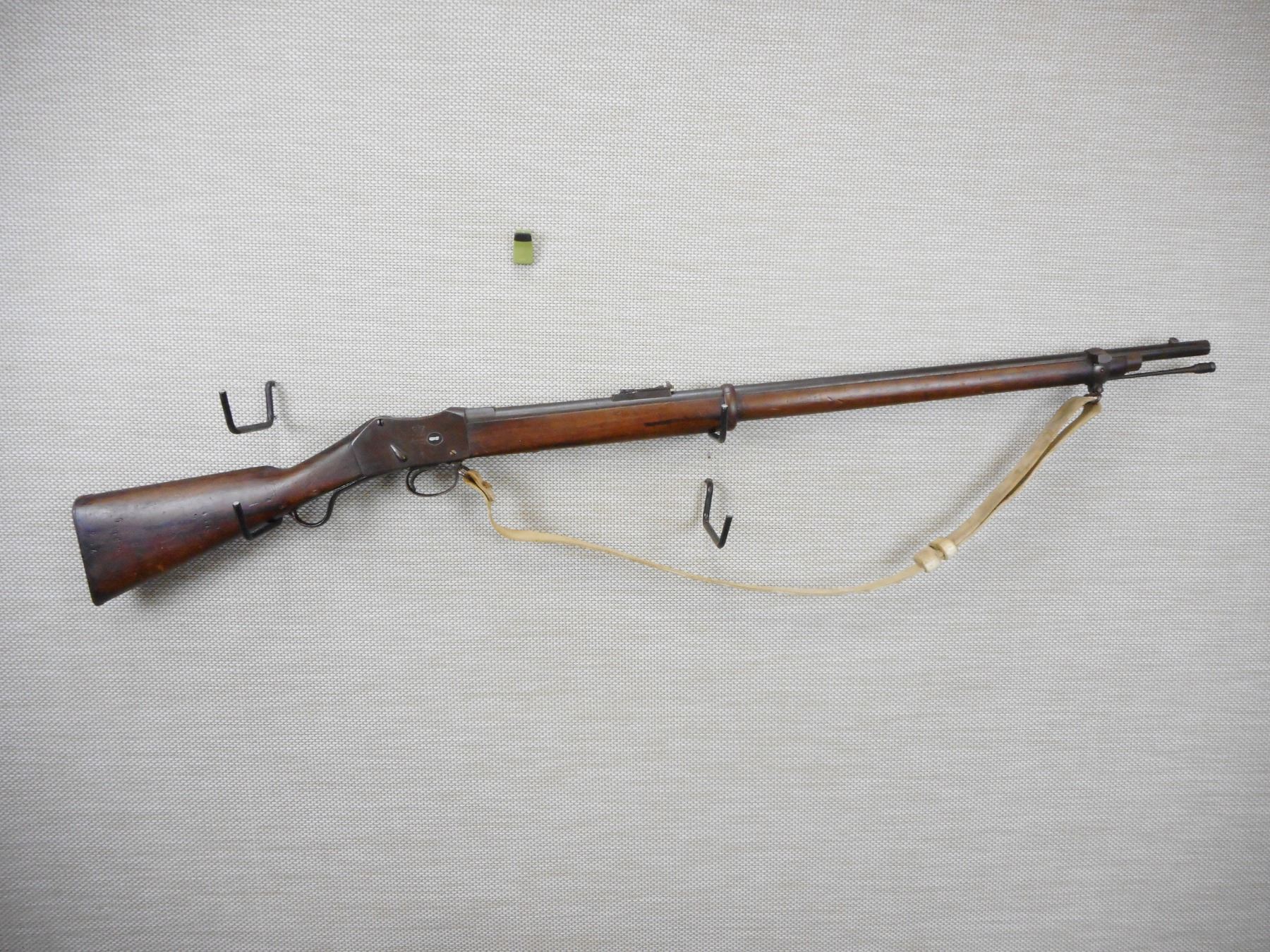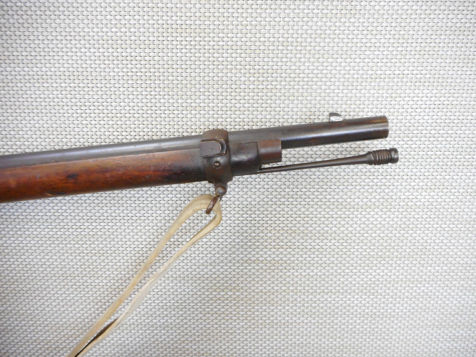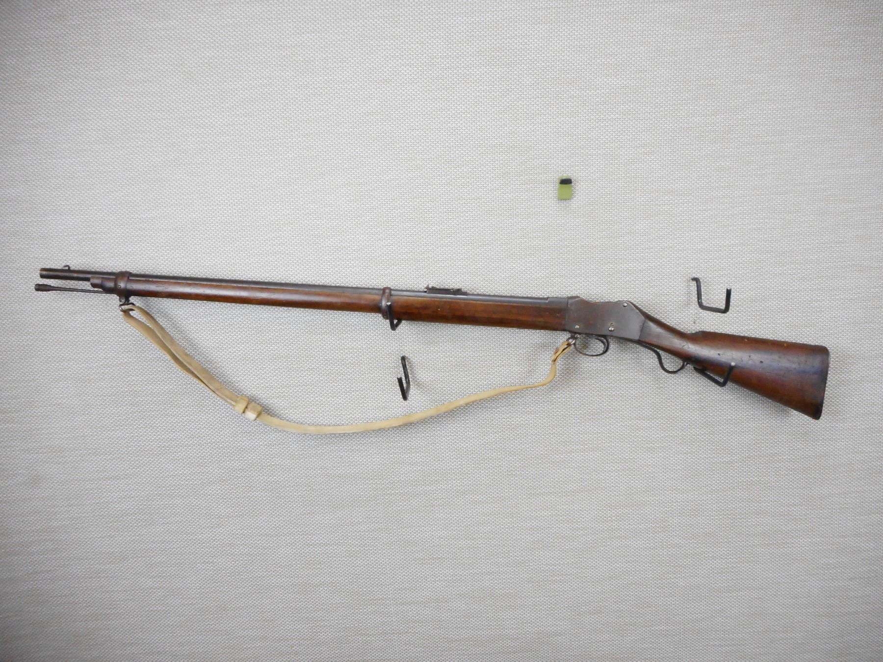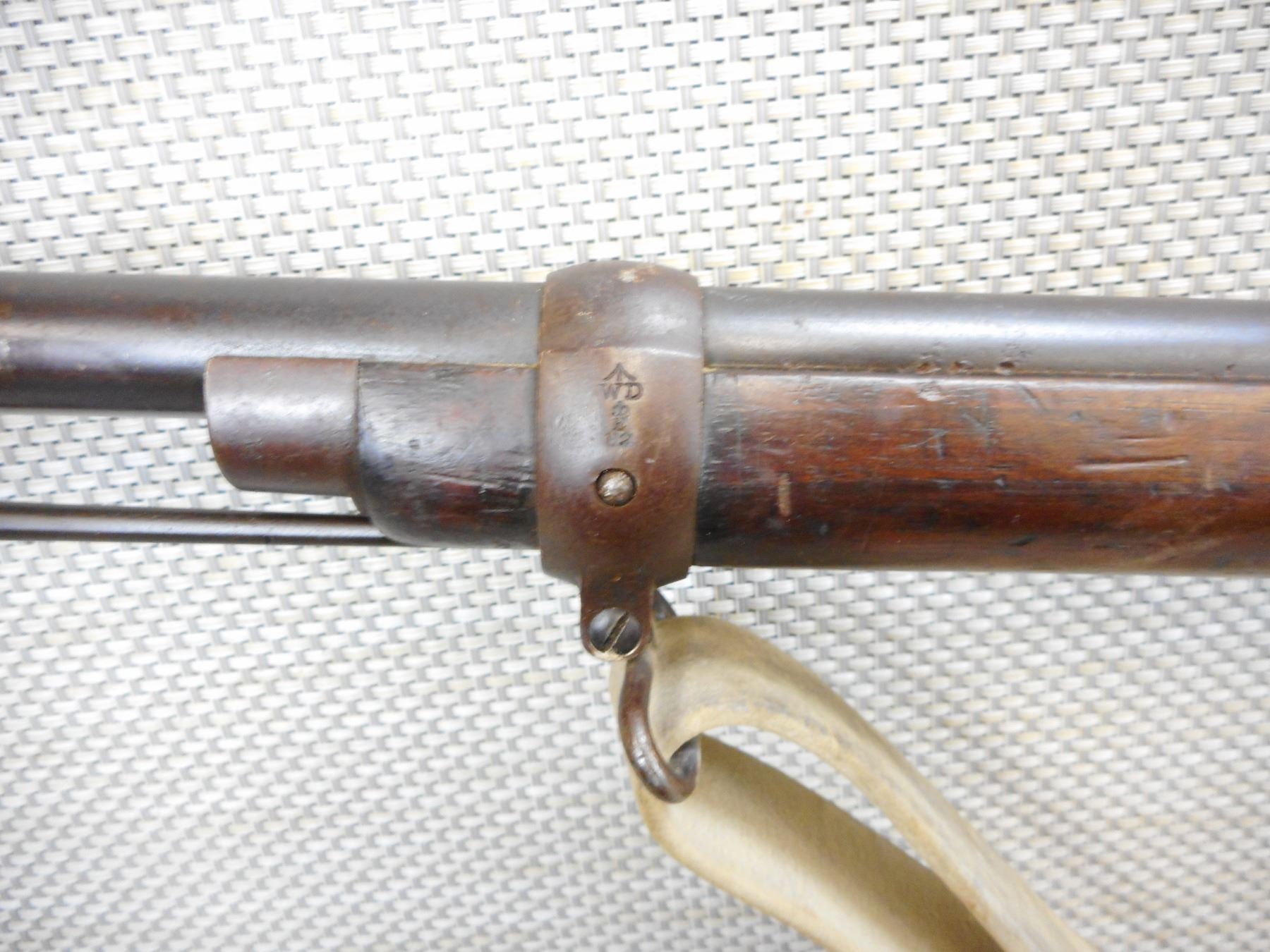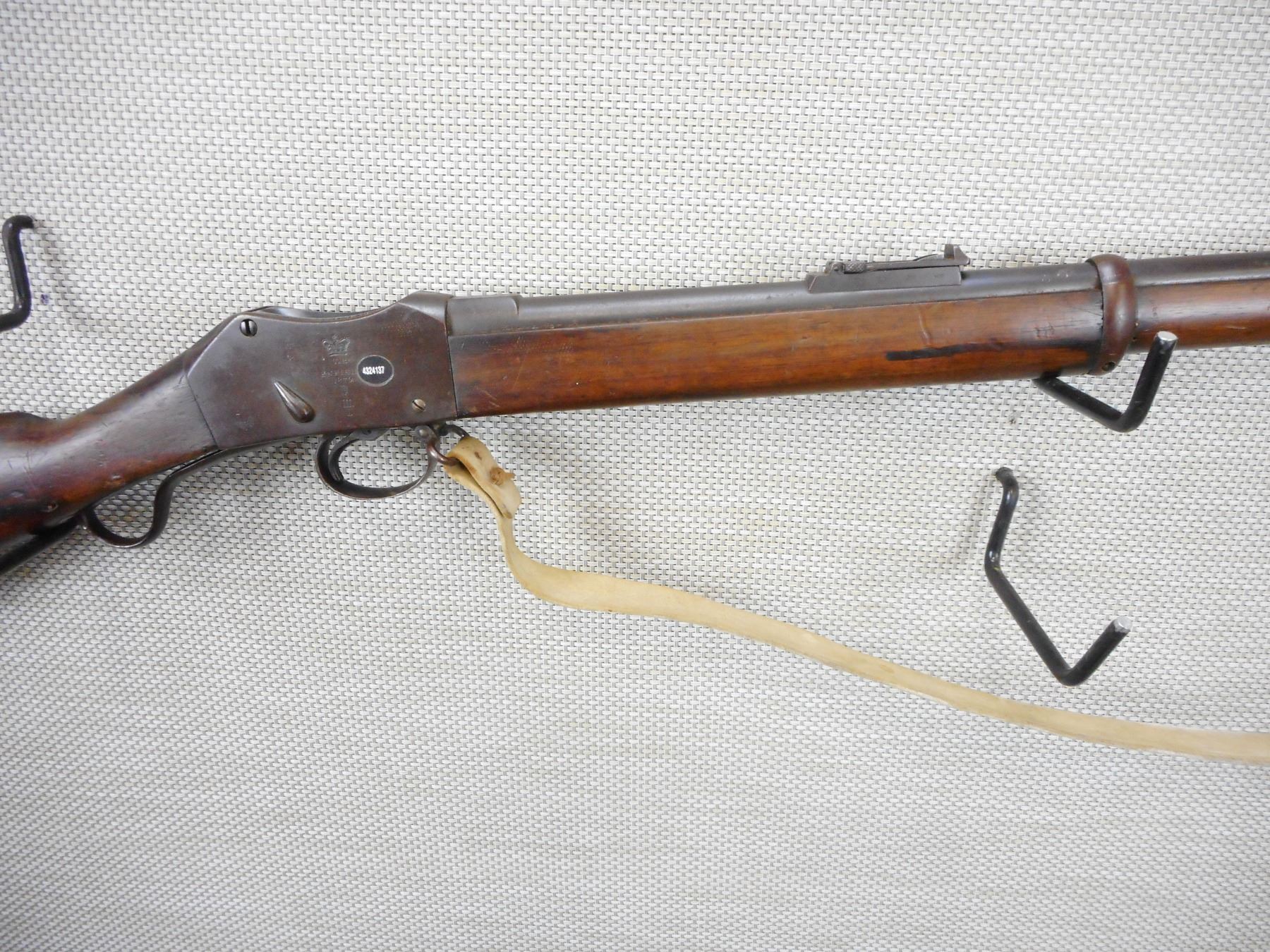 MARTINI HENRY, MODEL: MARK III, CALIBER: 577/450 , EXCELLENT BORE, RETAINS FULL MILITARY CONFIGURATION, SHORT LEVER ACTION, BLADE FRONT AND ADJUSTABLE REAR SIGHTS, ORIGINAL CLEANING ROD, ORIGINAL WHITE LEATHER SCABBARD, STEEL BUTT PLATE, NUMEROUS MILITARY MARKS AND BRD ARROWS, SHOWS SOME HANDLING MARKS , ACTION: SINGLE SHOT REAR HINGED TIPPING BLOCK , BARREL LENGTH: 32 1/2" , CONDITION: 7/10 ANTIQUE , STOCK # , SERIAL # 6618 , CLASS: CANADIAN ANTIQUE