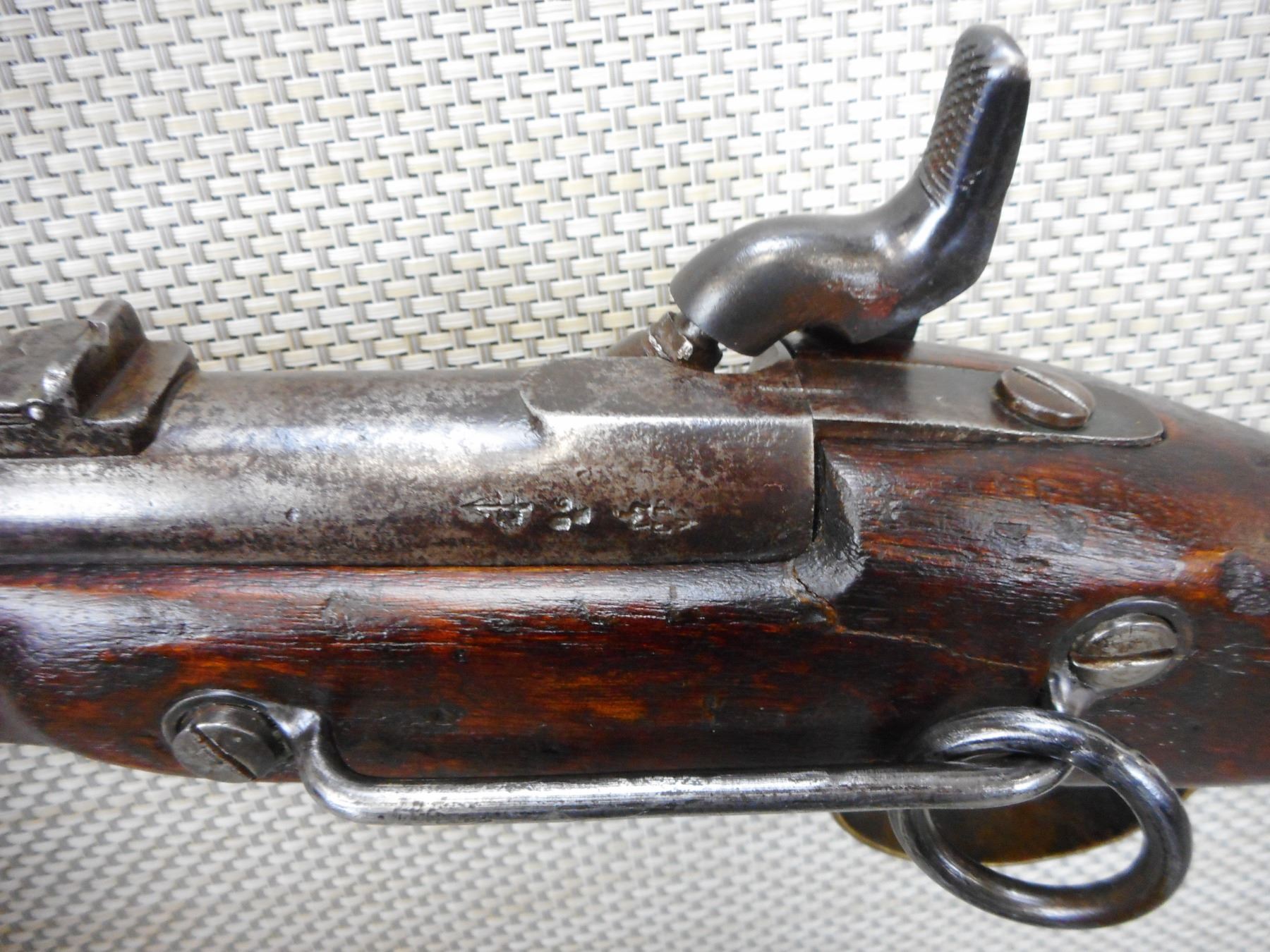 BRITISH SERVICE , MODEL: PATTERN 1856 CAVALRY CARBINE, CALIBER: 577 PERCUSSION , MANUFACTURED BY TOWER, DARK BORE, REPLACEMENT RAM ROD CAP, BLADE FRONT AND FLIP ADJUSTABLE REAR SIGHTS, NUMEROUS MILITARY MARKS AND BRD ARROWS, SADDLE RING AND SADDLE RING BAR, RETAINS FULL MILITARY CONFIGURATION, BRASS BUTT PLATE , ACTION: MUZZLE LOADER , BARREL LENGTH: 21" , CONDITION: 7/10 ANTIQUE , STOCK # , SERIAL # N/A , CLASS: CANADIAN ANTIQUE