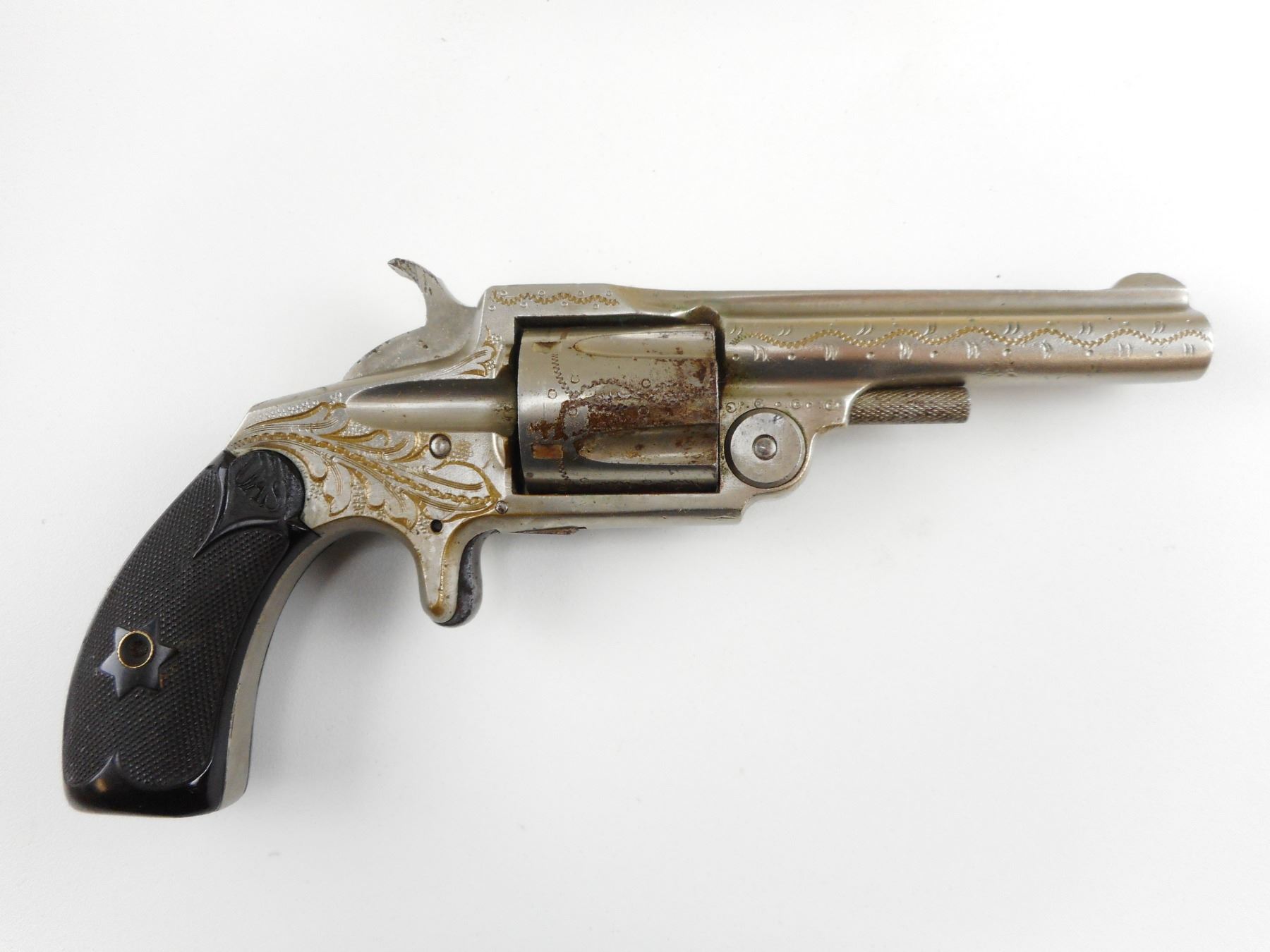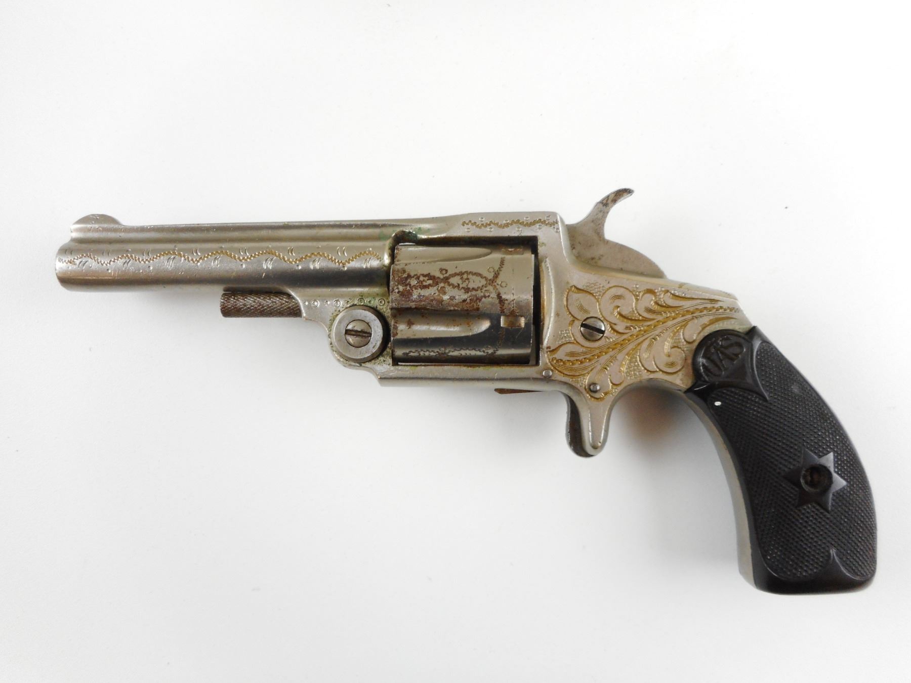 OTIS A. SMITH, MODEL: SMITHS NEW MODEL , CALIBER: 32 SHORT RIM FIRE , 5 SHOT CAPACITY, HALF MOON FRONT AND NOTCH HAMMER REAR SIGHT, LIGHTLY ENGRAVED BARREL CYLINDER AND RECEIVER, CHECKERED PLASTIC GRIP PANELS, DOESN'T HOLD IN THE COCKED POSITION, SPUR TRIGGER, BORE IS FAIR, SHOWS SOME HANDLING MARKS , ACTION: REVOLVER , BARREL LENGTH: 78MM , CONDITION: 5/10 , STOCK # , SERIAL # 20025 , CLASS: CANADIAN ANTIQUE