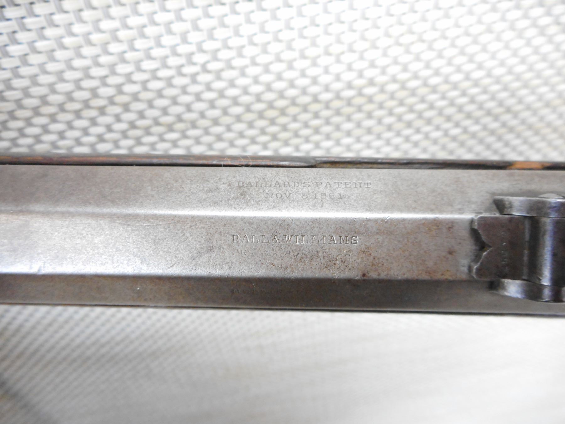 BALLARD , MODEL: CARBINE, CALIBER: 44 RIM FIRE , MANUFACTURED BY BALL & WILLIAMS, PAT NOV 5. 1861, BARREL AND RECEIVER MATCH BY SERIAL #, LIGHT SCATTERED PITTING IN THE BORE, BLADE FRONT AND FLIP ADJUSTABLE REAR SIGHT, REPLACED EJECTOR LEVER, MISSING THE FRONT SLING SWIVEL, SMALL CHIP AT THE TOE, CRACKED FOREND, SHOWS SOME HANDLING MARKS , ACTION: FALLING BLOCK , BARREL LENGTH: 22" , CONDITION: 4/10 ANTIQUE , STOCK # , SERIAL # 4768 , CLASS: CANADIAN ANTIQUE