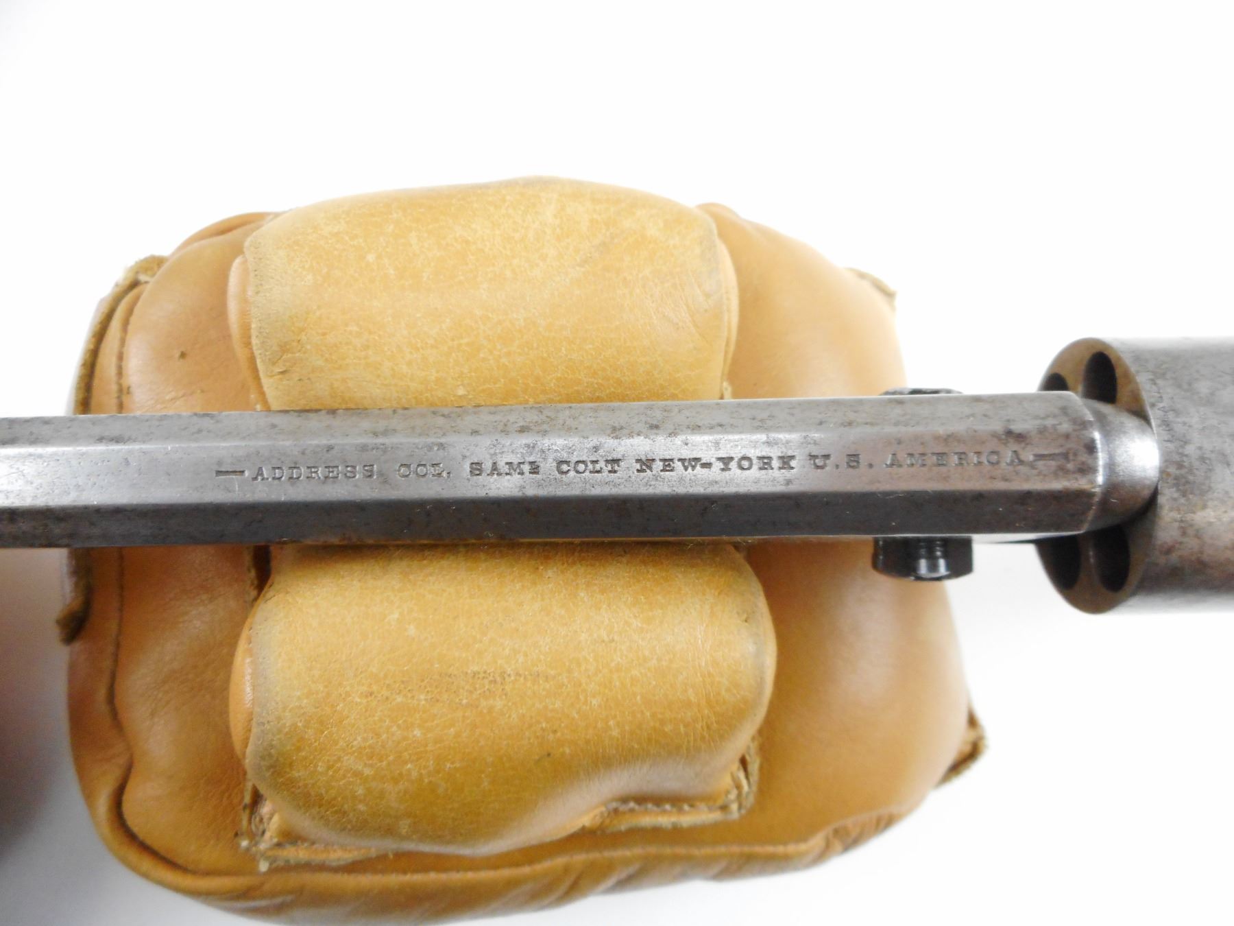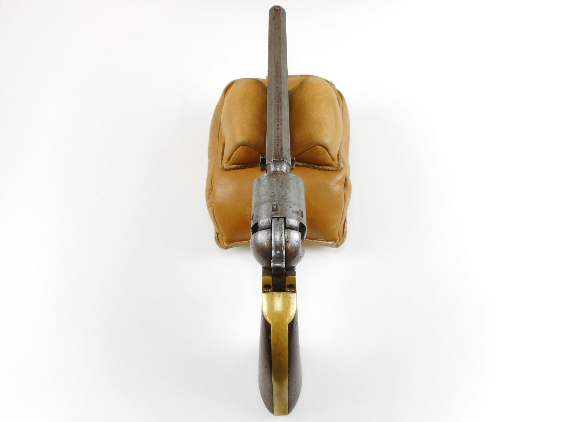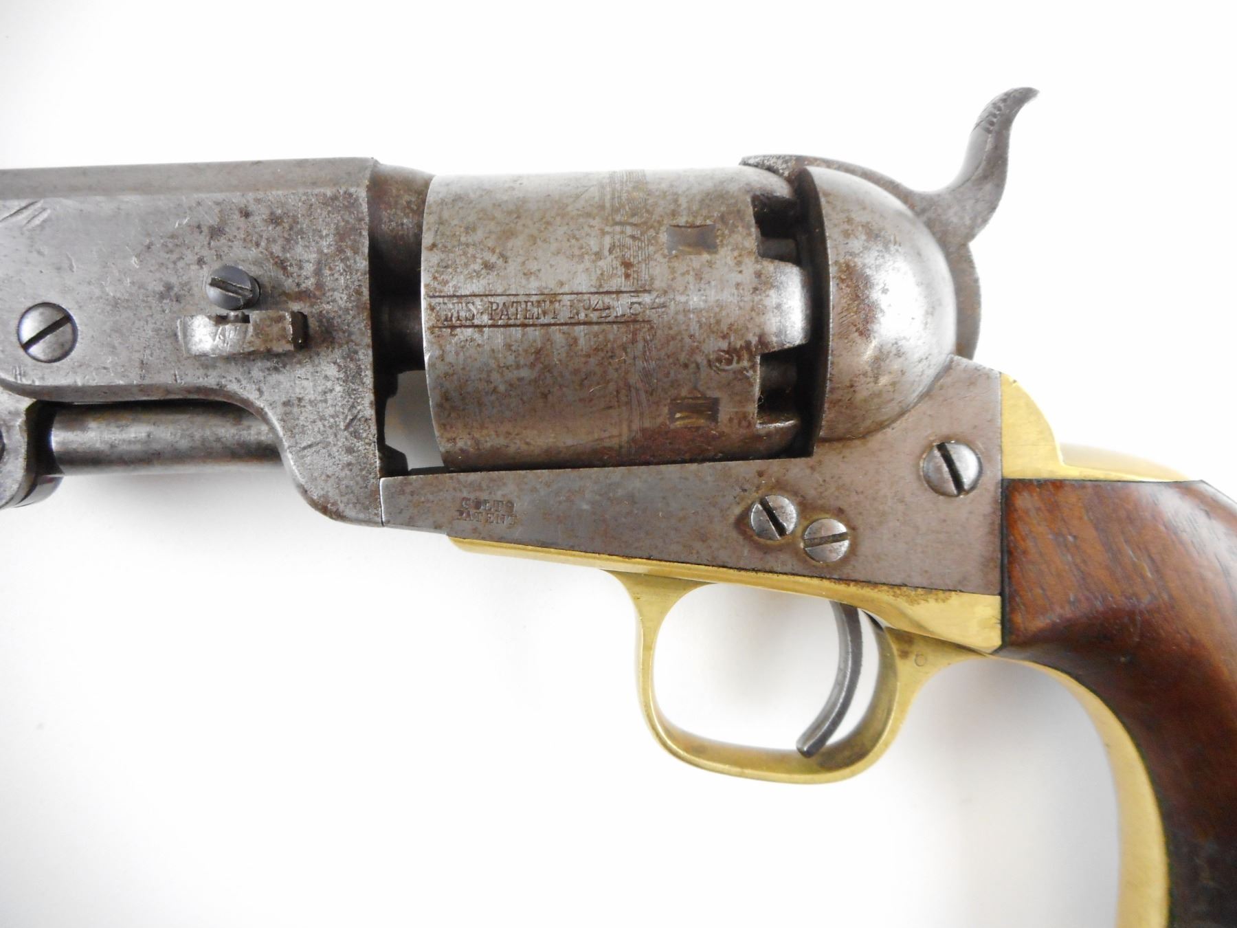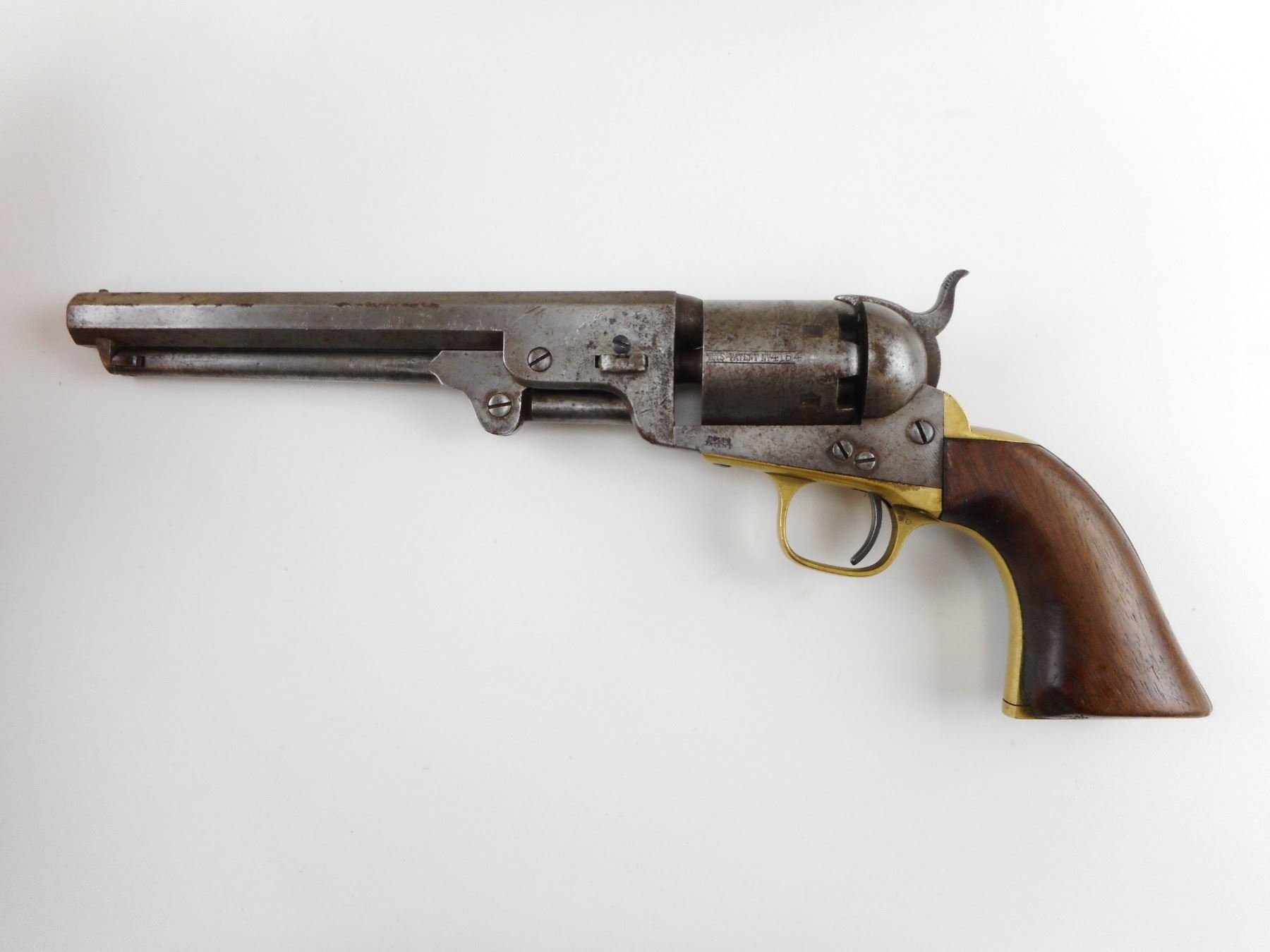 CIVIL WAR ERA, COLT, MODEL: 1851 NAVY , CALIBER: 36 CAL PERC , 6 SHOT CAPACITY, MANUFACTURED IN 1862, OCTAGONAL BARREL, BEAD FRONT SIGHT, HAMMER NOTCH REAR SIGHT, VERY LITTLE FINISH REMAINING ON THE METAL, CHIPPED WOOD GRIP PANELS, DARK BORE, RETAINS SOME OF THE NAVAL ENGRAVED SCENE ON THE CYLINDER, SHOWS SOME HANDLING MARKS , ACTION: REVOLVER , BARREL LENGTH: 191MM , CONDITION: 5/10 ANTIQUE , STOCK # , SERIAL # 124154 , CLASS: CANADIAN ANTIQUE