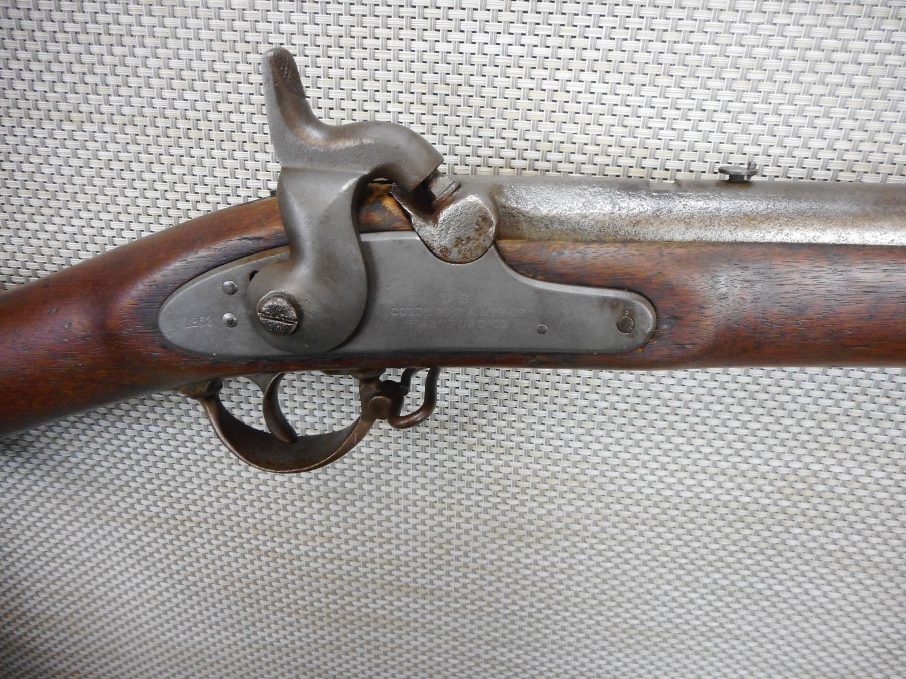 COLT, MODEL: SPRINGFIELD 1861 US RIFLE , CALIBER: 58 CAL PERC , COLT HARTFORD ARSENAL, MARKED "US" ON THE LOCK AND BUTT PLATE, DATED 1863, DARK BORE WITH MINOR DENT AT MUZZLE, BLADE FRONT AND REPLACED REAR SIGHT, RETAINS FULL MILITARY CONFIGURATION WITH RAM ROD, SOME LIGHT SURFACE PITTING ON METAL PARTS , ACTION: MUZZLE LOADER , BARREL LENGTH: 39" , CONDITION: 5/10 ANTIQUE , STOCK # , SERIAL # N/A , CLASS: CANADIAN ANTIQUE