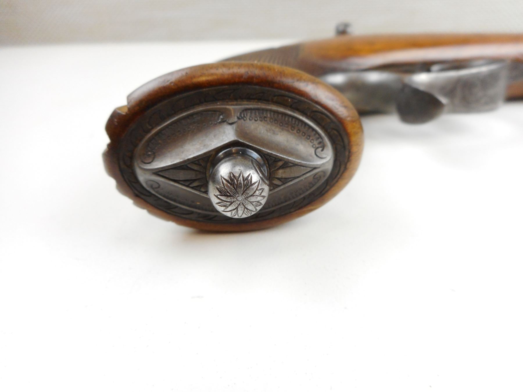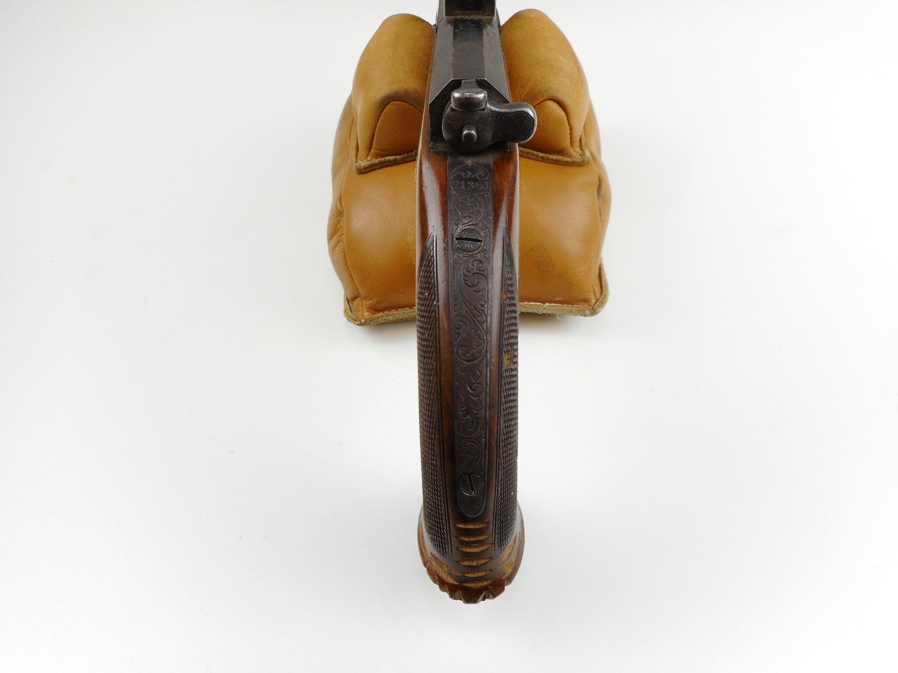 DREYESE, MODEL: SIDE SWING , CALIBER: 9.5MM DREYESE , EXCELLENT BORE, BLADE FRONT AND ADJUSTABLE REAR SIGHT, ENGRAVED OCTAGONAL BARREL, FINGER GROOVED TRIGGER GUARD, FINELY CHECKERED GRIPS, LANYARD LOOP, SHOWS SOME HANDLING MARKS, KNOTCHES HAVE BEEN CARVED INTO THE BUTT, COMES WITH RCMP ANTIQUE LETTER , ACTION: SINGLE SHOT PISTOL , BARREL LENGTH: 191MM , CONDITION: 7/10 ANTIQUE , STOCK # , SERIAL # 21361 , CLASS: CANADIAN ANTIQUE