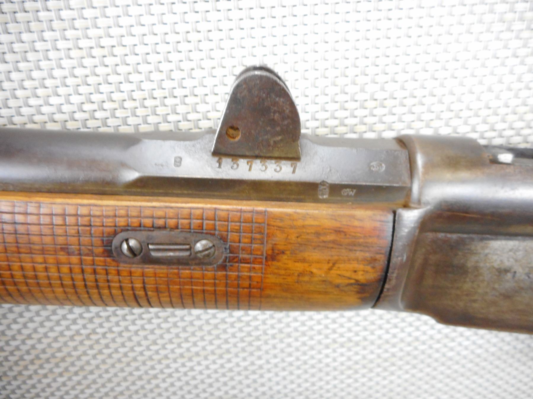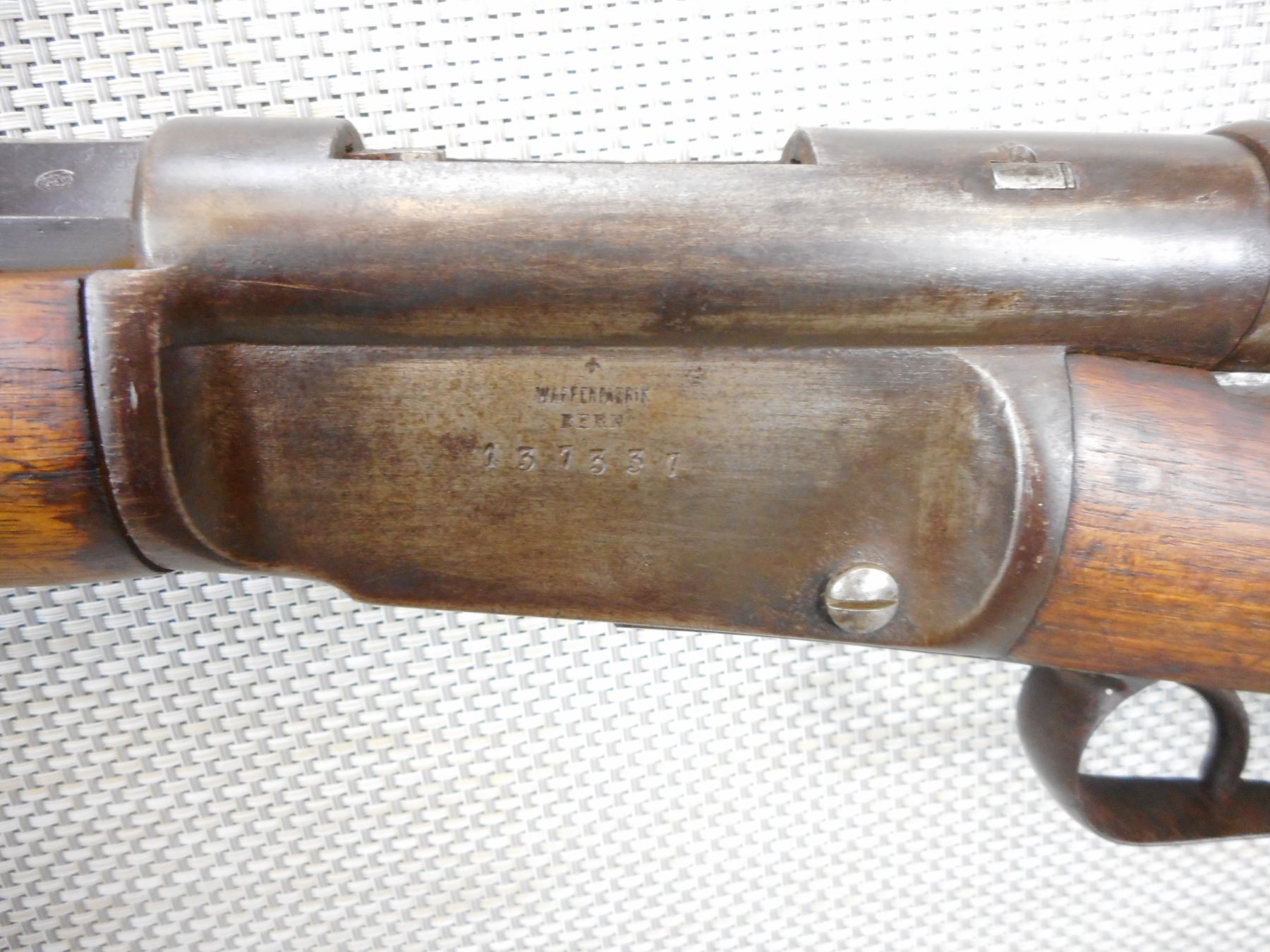 VETTERLI, MODEL: 69/71 SWISS , CALIBER: 41 RIM FIRE SWISS , DARK BORE, RETAINS FULL MILITARY CONFIGURATION, BLADE FRONT AND ADJUTABLE REAR SIGHT, MISSING THE ELEVATOR, CHECKERED FOREND AND STRAIGHT GRIP BUTT STOCK, SHOWS NUMEROUS MILITARY MARKINGS, MISSING THE CLEANING ROD, SLING SWIVEL LOOPS, SOME LIGHT SURFACE PITTING , ACTION: BOLT ACTION REPEATER , BARREL LENGTH: 33" , CONDITION: 6/10 ANTIQUE , STOCK # , SERIAL # 137337 , CLASS: CANADIAN ANTIQUE