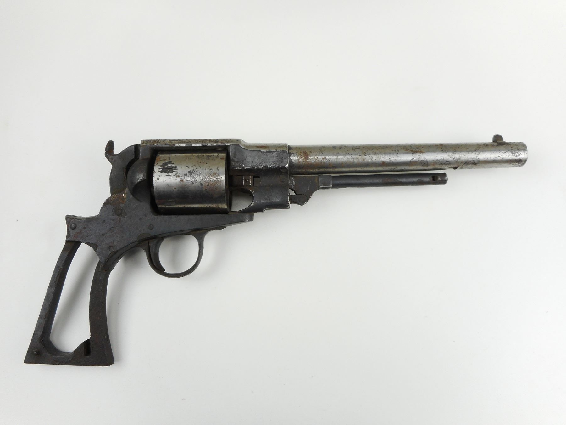 CIVIL WAR ERA, AUSTIN TYLER FREEMAN , MODEL: ARMY , CALIBER: 44 CAL PERC , SAW HANDLE GRIP WITH SQUARE BUTT, MISSING THE MAIN SPRING, ,MISSING LOADING LEVER RETAINING LATCH, MISSING GRIPS, BENT HANDLING SPUR, SHOWS EXTENSIVE HANDLING MARKS, AN INTERESTING CIVIL WAR RESTORATION PROJECT , ACTION: PERCUSSION REVOLVER , BARREL LENGTH: 191MM , CONDITION: 3/10 ANTIQUE , STOCK # , SERIAL # 436 , CLASS: CANADIAN ANTIQUE