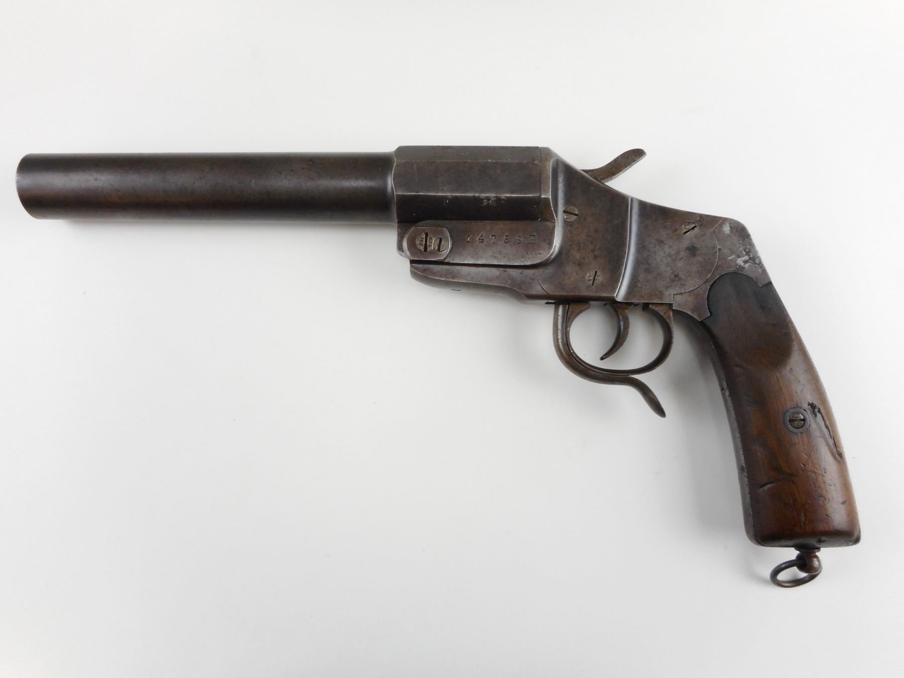 WWI GERMAN, FLARE GUN, MODEL: FLARE GUN , CALIBER: 20GA BARREL , THIS IS A UNIQUE ONE OF A KIND, EXTREMELY HEAVY DUTY BARREL, EXCELLENT BORE, ACTION IS TIGHT, WOOD GRIP PANELS, LANYARD LOOP, SHOWS SOME HANDLING MARKS , ACTION: BREAK ACTION SINGLE SHOT , BARREL LENGTH: 226MM , CONDITION: 7/10 ANTIQUE FLARE , STOCK # , SERIAL # 14759 , CLASS: FLARE