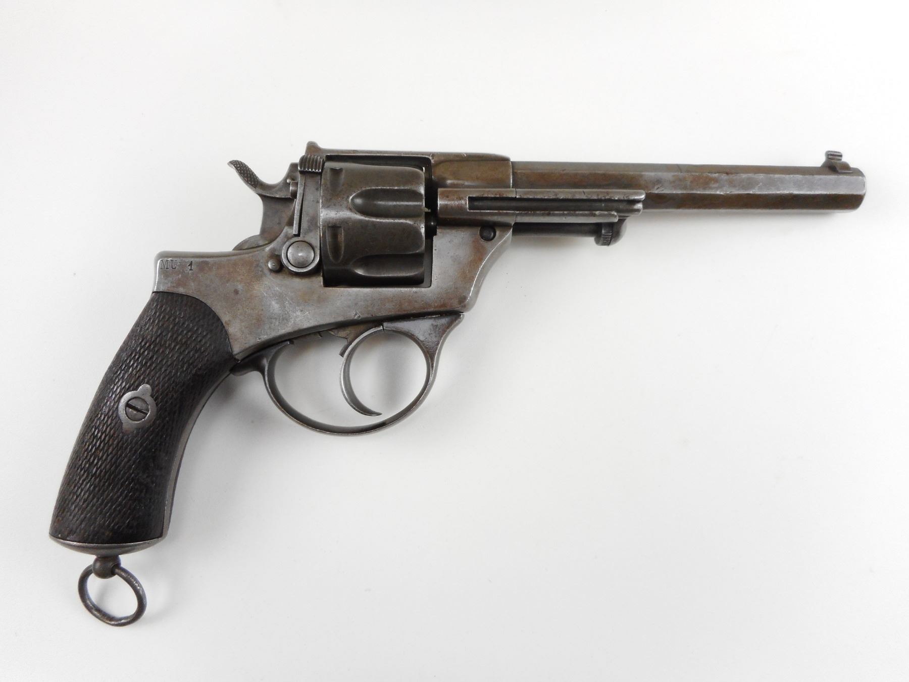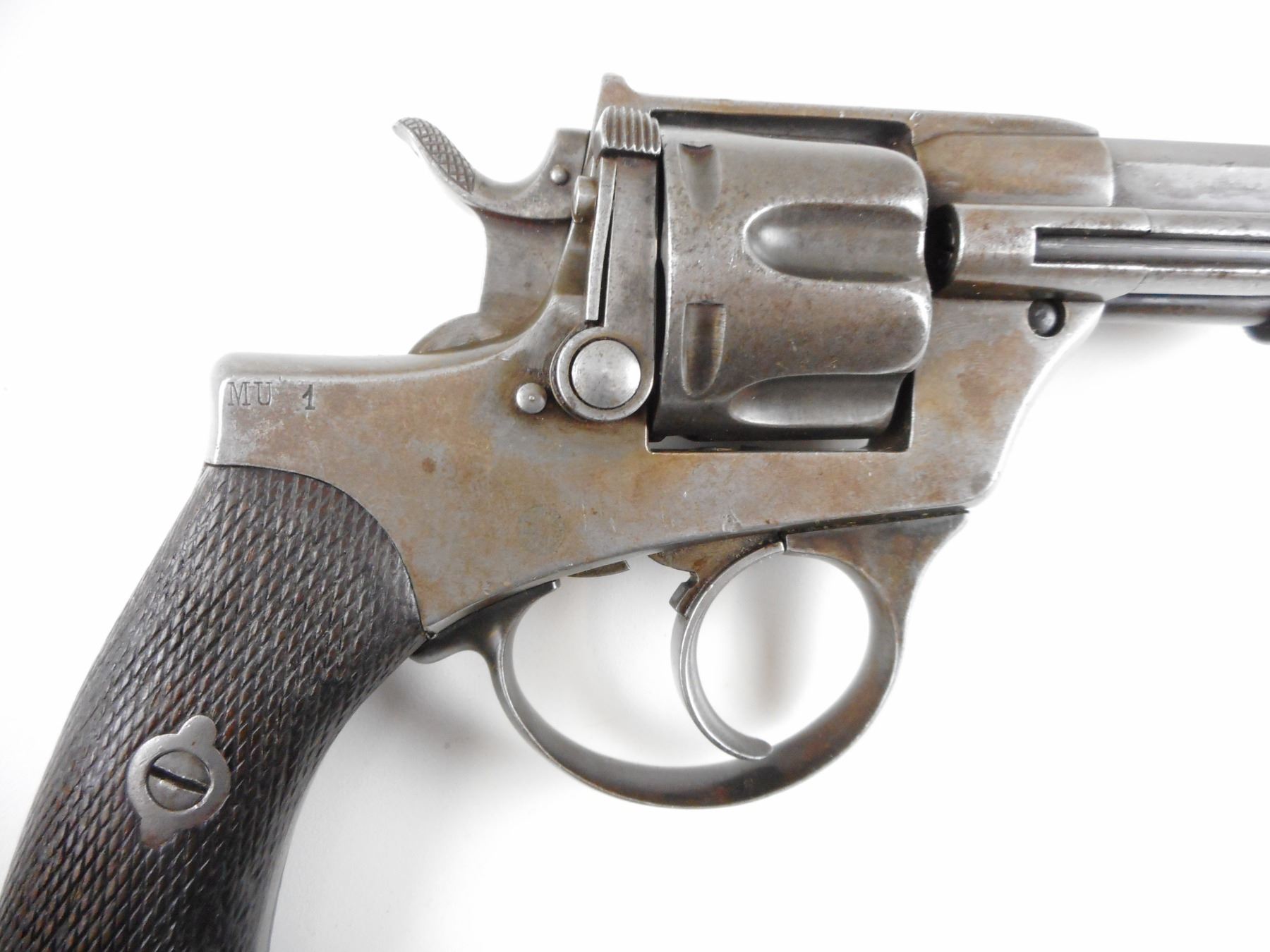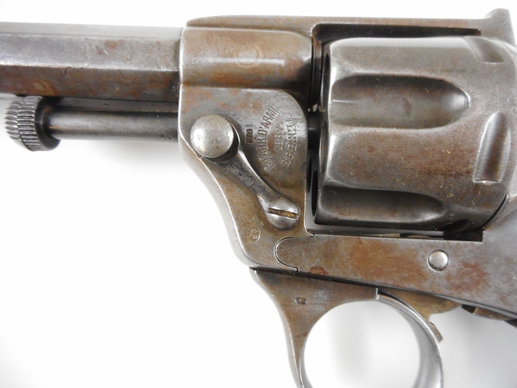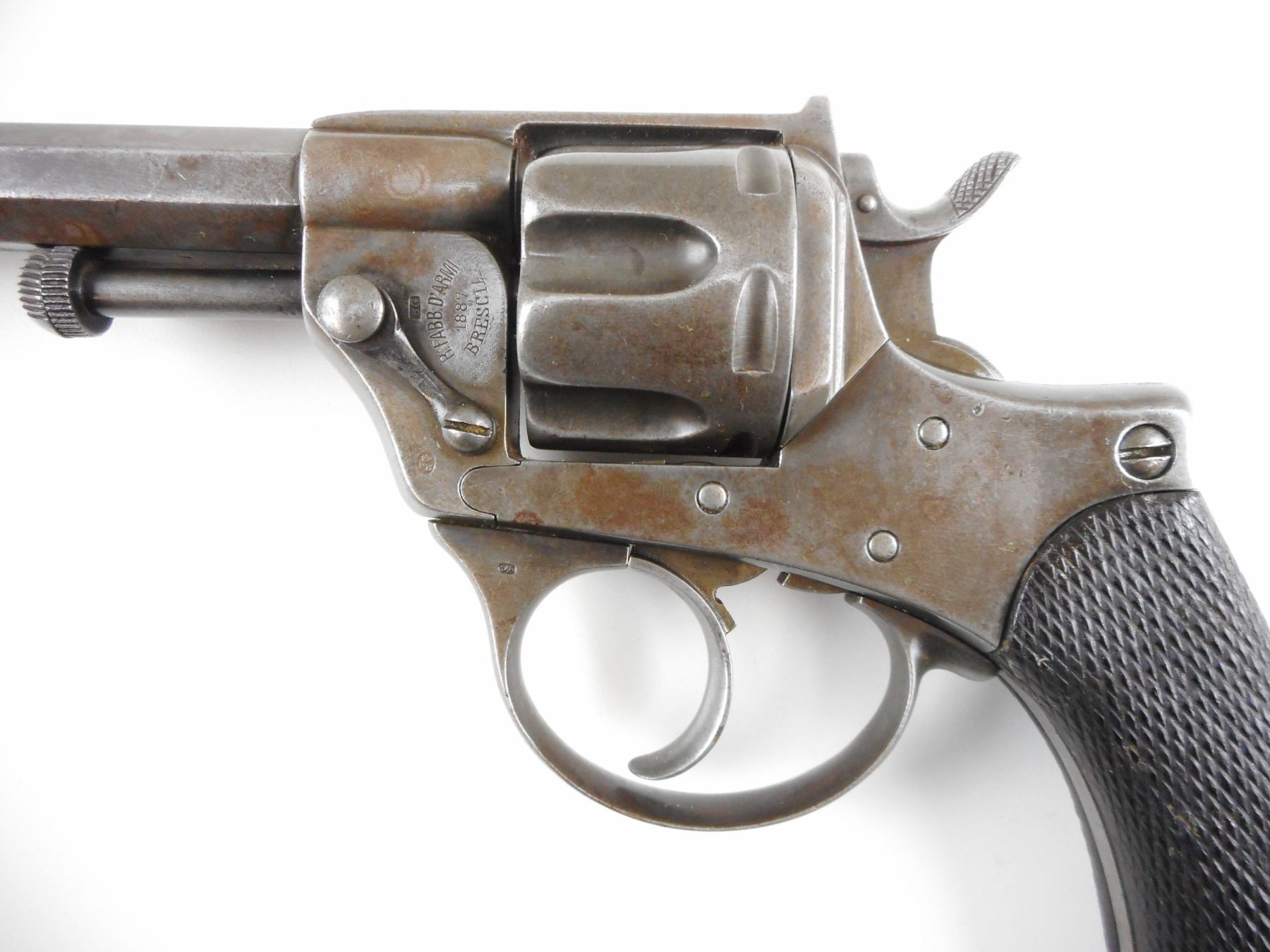 ITALIAN SERVICE , MODEL: 1887, CALIBER: 10.4MM ITALIAN REVOLVER , MANUFACTURED BY GLISENTI, DOVETAIL FRONT AND RAISED NOTCH REAR SIGHTS, HOLDS COCK, INDEXES WELL, ACTION IS TIGHT, BORE IS VERY GOOD, CHECKERED WOOD GRIP PANELS THERE IS A CRACK IN THE LEFT PANEL, OCTAGONAL BARREL, 6 SHOT CAPACITY, COMES WITH RCMP ANTIQUE LETTER , ACTION: REVOLVER , BARREL LENGTH: 155MM , CONDITION: 7/10 ANTIQUE , STOCK # , SERIAL # T905 , CLASS: CANADIAN ANTIQUE