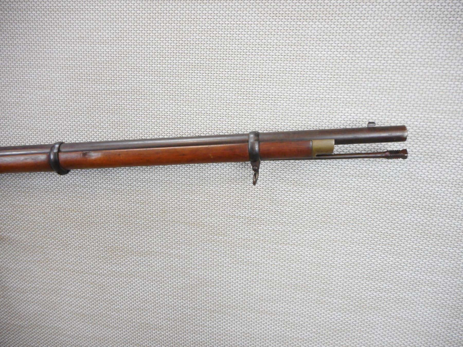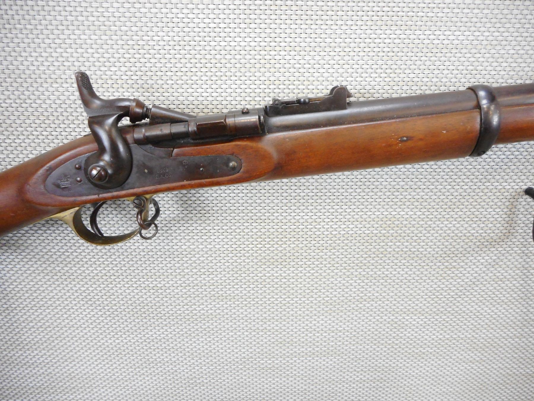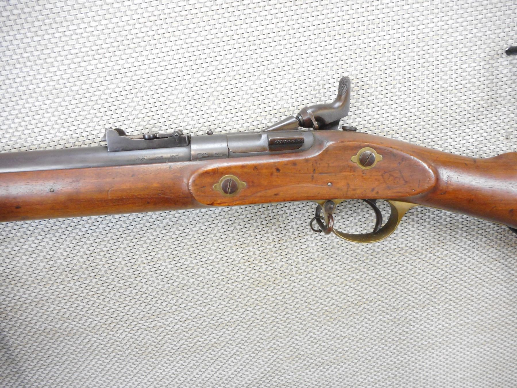 SNIDER ENFIELD , MODEL: III BAND INFANTRY RIFLE MKII**, CALIBER: 577 SNIDER , L.A. CO MANUFACTURE, LOCK DATED 1862, C BRD ARROW ON THE BREECH BLOCK, HAS A NIPPLE PROTECTOR, CLEANING ROD, SLING LOOPS, HAS 3 GROOVE RIFLING IN THE BORE, BRASS BUTT PLATE AND TRIGGER GUARD, CRACK IN THE WOOD AT THE TOE OF THE BUTT STOCK , ACTION: BREECH BLOCK , BARREL LENGTH: 36 1/2" , CONDITION: 7/10 ANTIQUE , STOCK # , SERIAL # N/A , CLASS: CANADIAN ANTIQUE