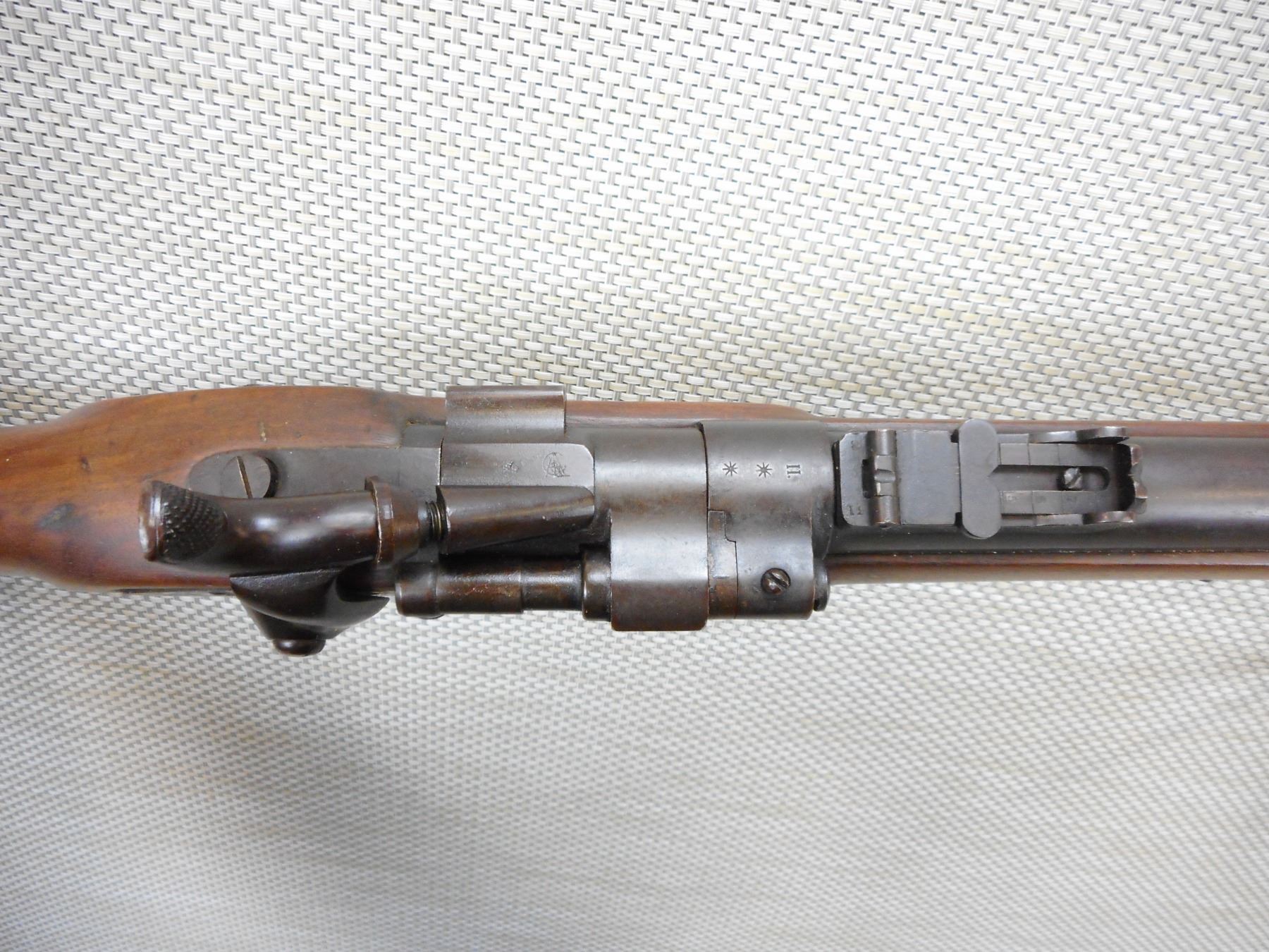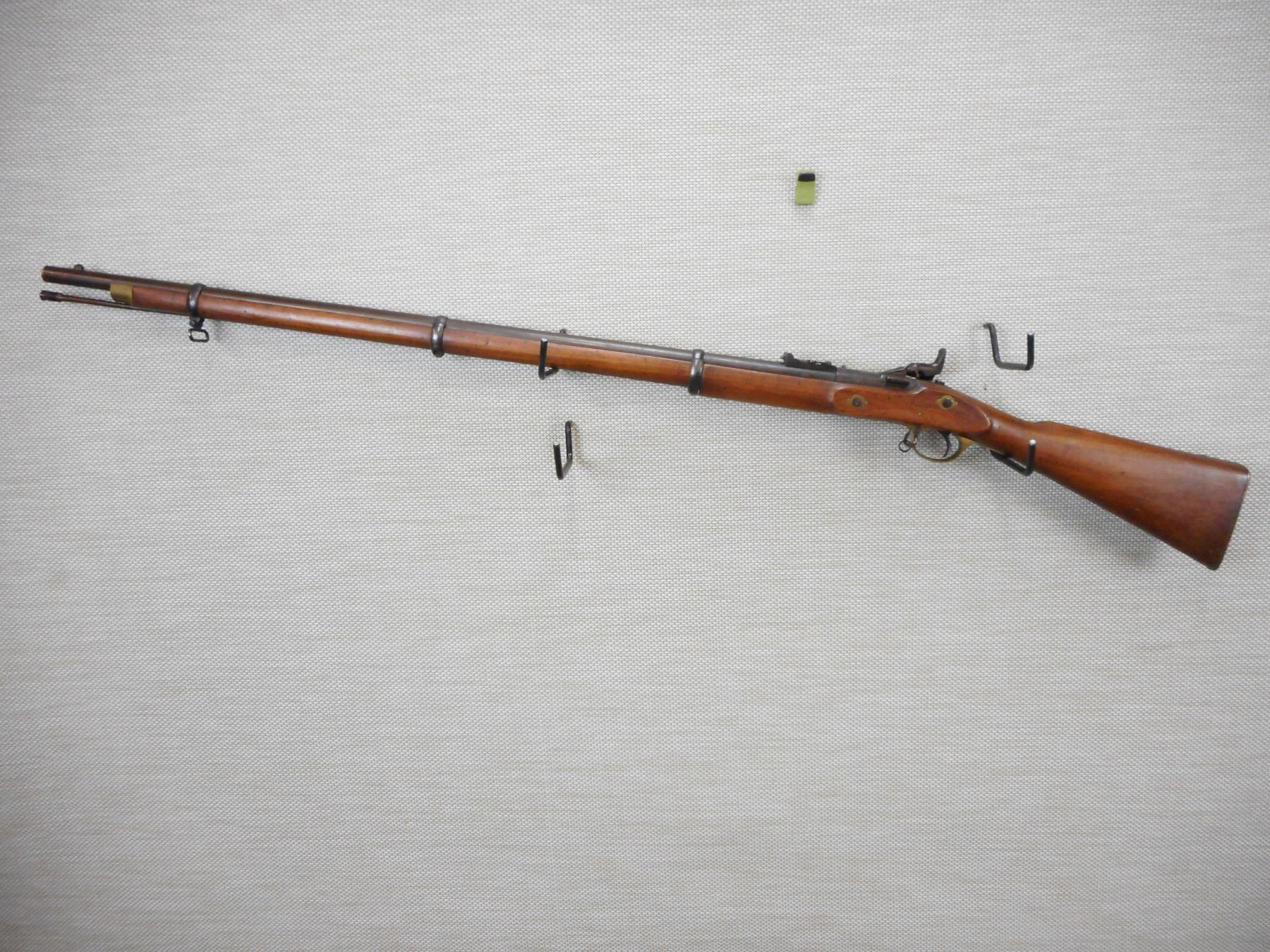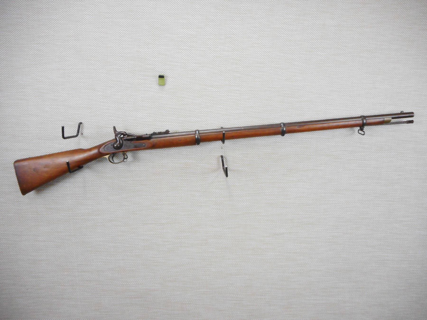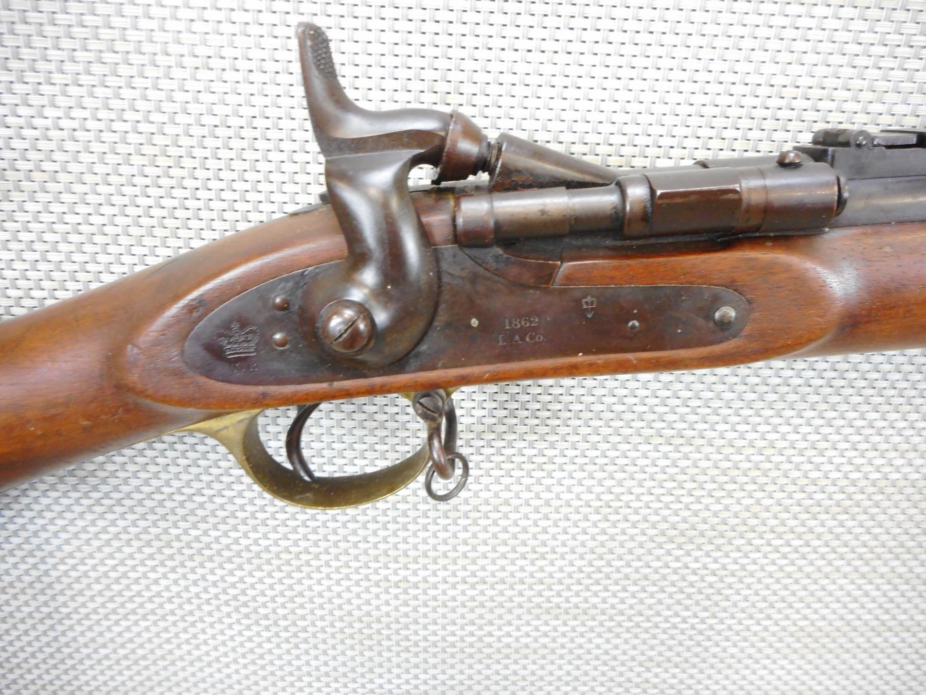SNIDER ENFIELD , MODEL: III BAND INFANTRY RIFLE MKII**, CALIBER: 577 SNIDER , L.A. CO MANUFACTURE, LOCK DATED 1862, C BRD ARROW ON THE BREECH BLOCK, HAS A NIPPLE PROTECTOR, CLEANING ROD, SLING LOOPS, HAS 3 GROOVE RIFLING IN THE BORE, BRASS BUTT PLATE AND TRIGGER GUARD, CRACK IN THE WOOD AT THE TOE OF THE BUTT STOCK , ACTION: BREECH BLOCK , BARREL LENGTH: 36 1/2" , CONDITION: 7/10 ANTIQUE , STOCK # , SERIAL # N/A , CLASS: CANADIAN ANTIQUE