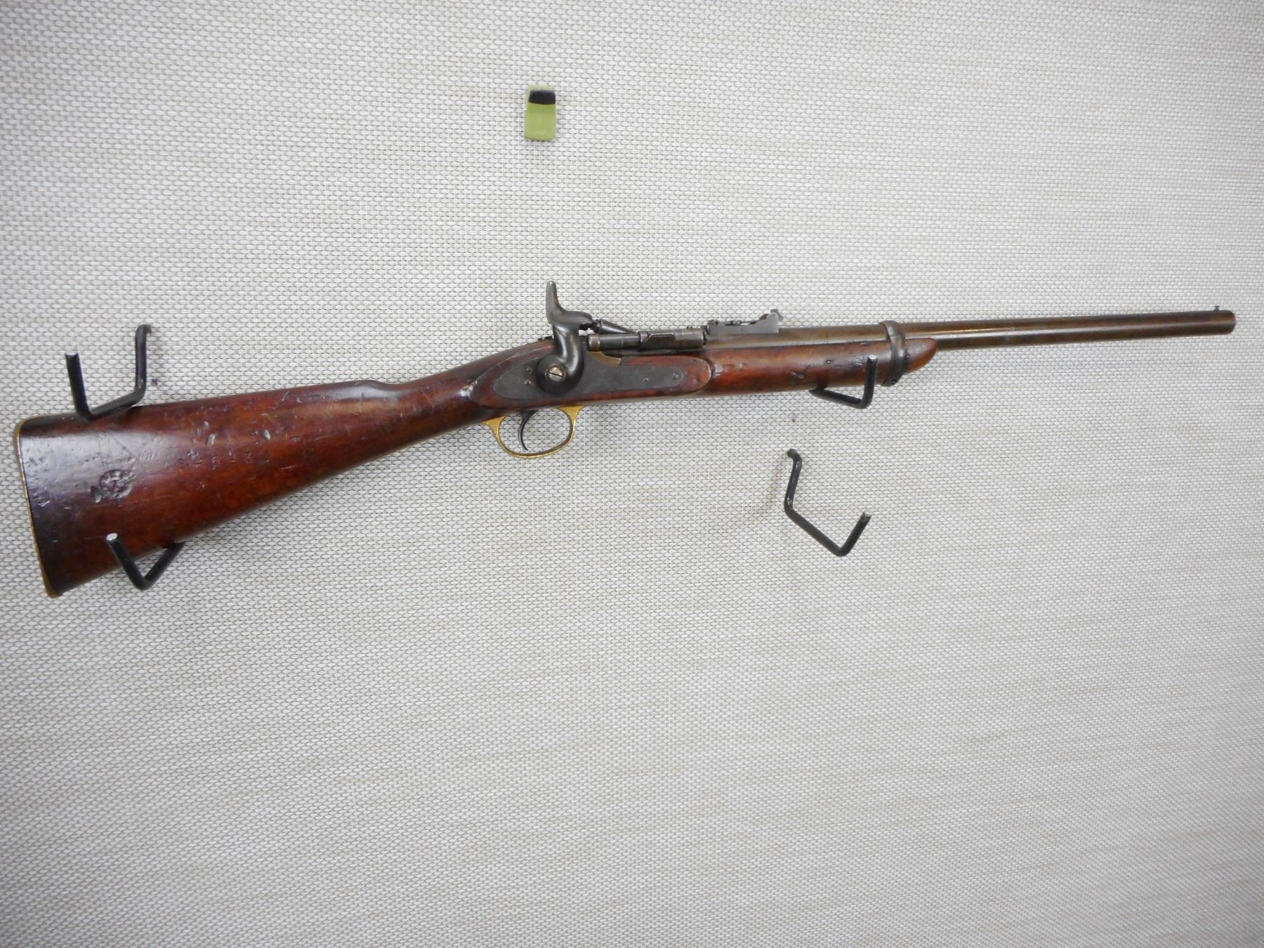 SNIDER ENFIELD , MODEL: CADET CARBINE MKII**, CALIBER: 577 SNIDER , MANUFATURED BY ENFIELD, LOCK DATED 1868, GOOD BORE WITH LOTS OF RIFLING, REAR LADDER SIGHT AND A FRONT PIN SIGHT, WD ARROW MARKED ON THE BREECH BLOCK, RACK # 22/77/6 ON THE BUTT PLATE, VARIOUS IMPRESSESS ON THE BUTT STOCK , ACTION: BREECH BLOCK , BARREL LENGTH: 19 1/4" , CONDITION: 8/10 ANTIQUE , STOCK # , SERIAL # N/A , CLASS: CANADIAN ANTIQUE