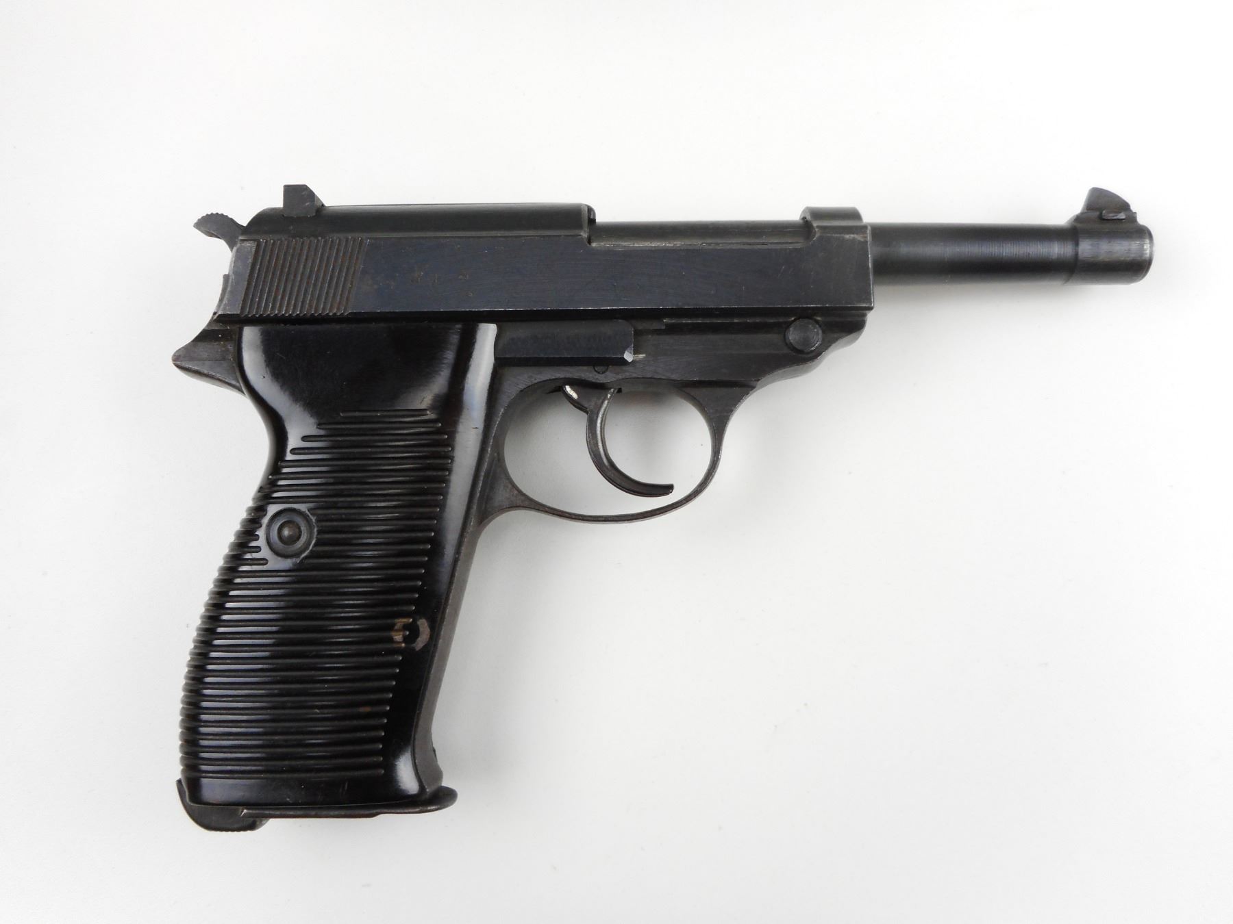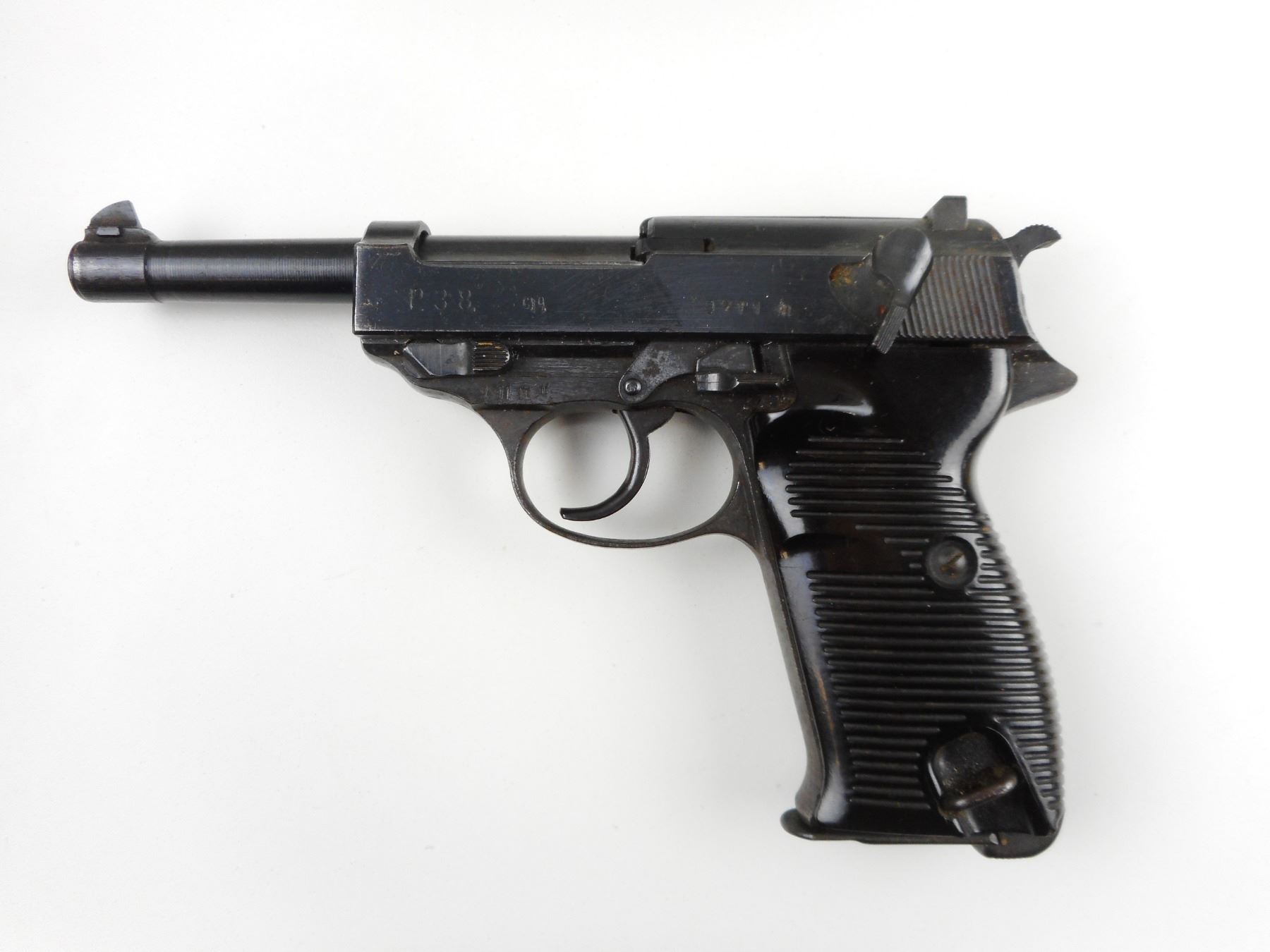 DEACTIVATED, WWII ERA, WALTHER, MODEL: P38, CALIBER: 9MM LUGER, COMES WITH A ORIGINAL REMOVABLE P38 MAGAZINE, GERMAN MILITARY MARKED, MADE AT SPREEWERKE (CYQ), THIS WOULD NORMALLY BE A PROHIBITED FIREARM, BUT HAS BEEN DEACTIVATED AND NO LONGER FUNCTIONS, BARREL IS WELDED, ALL NUMBERS ARE MATCHING, ORIGINAL GRIPS ARE IN GOOD CONDITION, SHOWS SOME HANDLING MARKS , ACTION: SEMI AUTOMATIC DEACTIVATED HANDGUN , BARREL LENGTH: 121MM , CONDITION: 8/10 DEACTIVATED , STOCK # , SERIAL # 9711M , CLASS: DEACTIVATED