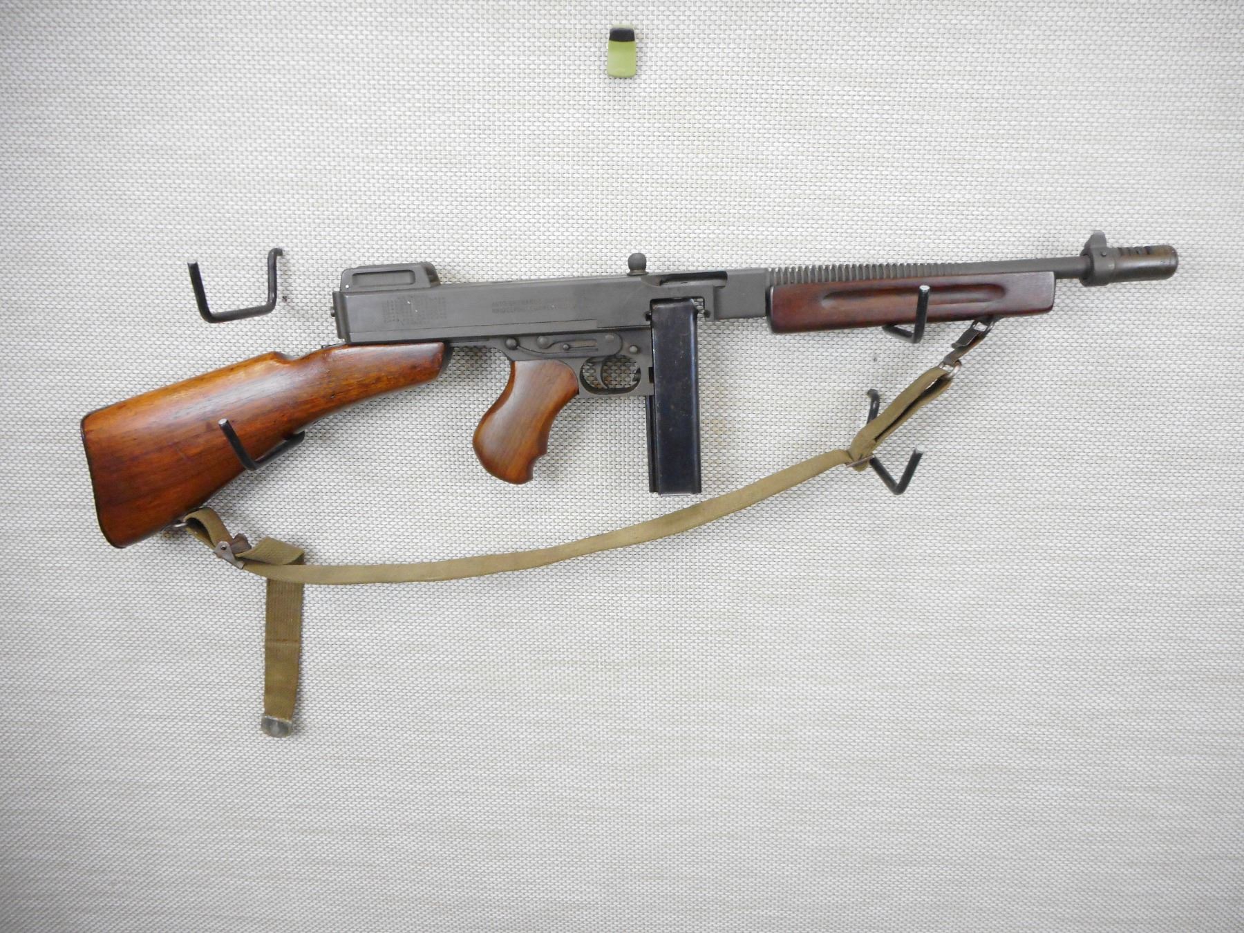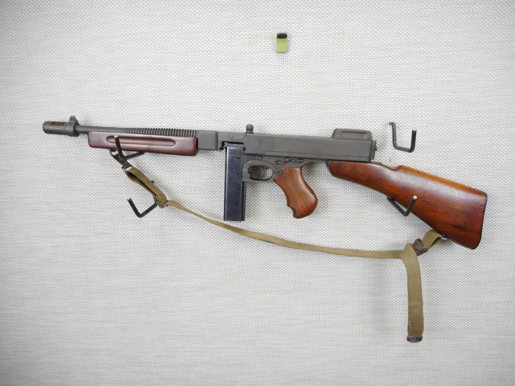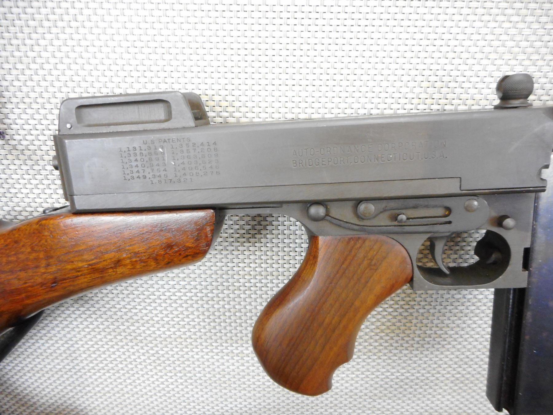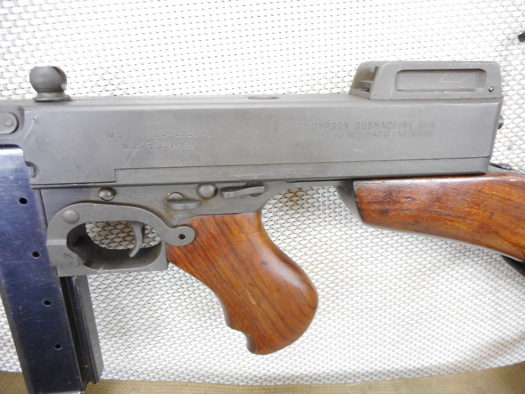THOMPSON, MODEL: MODEL OF 1928A1, CALIBER: 45AUTO , COMES WITH A MAGAZINE, THIS IS A CLASS 12-3 PROHIBITED, YOU REQUIRE 12-3 PRIVILEGE ON YOUR LICENSE TO PURCHASE UNLESS YOU WOULD LIKE TO HAVE IT DEACTIVATED, DEACTIVATION WILL COST $150.00, CFR TECHNICAL INSPECTION HAS ALREADY TAKEN PLACE AND REQUIRED MODIFICATIONS HAVE BEEN MADE, BORE IS VERY GOOD, BLADE FRONT AND ADJUSTABLE REAR SIGHT, CUTTS COMPENSATOR AT THE MUZZLE, 3 PIECE HARDWOODS STOCK WITH FULL PISTOL GRIP, SLING SWIVEL LOOPS WITH ORIGINAL CANVAS SLING, SHOWS VERY LITTLE HANDLING MARKS, STEEL BUTT PLATE , ACTION: SUBMACHINE GUN / CONVERTED AUTO , BARREL LENGTH: 305MM , CONDITION: 8/10 , STOCK # 2363 , SERIAL # S331861 , CLASS: CANADIAN PROHIBITED CLASS