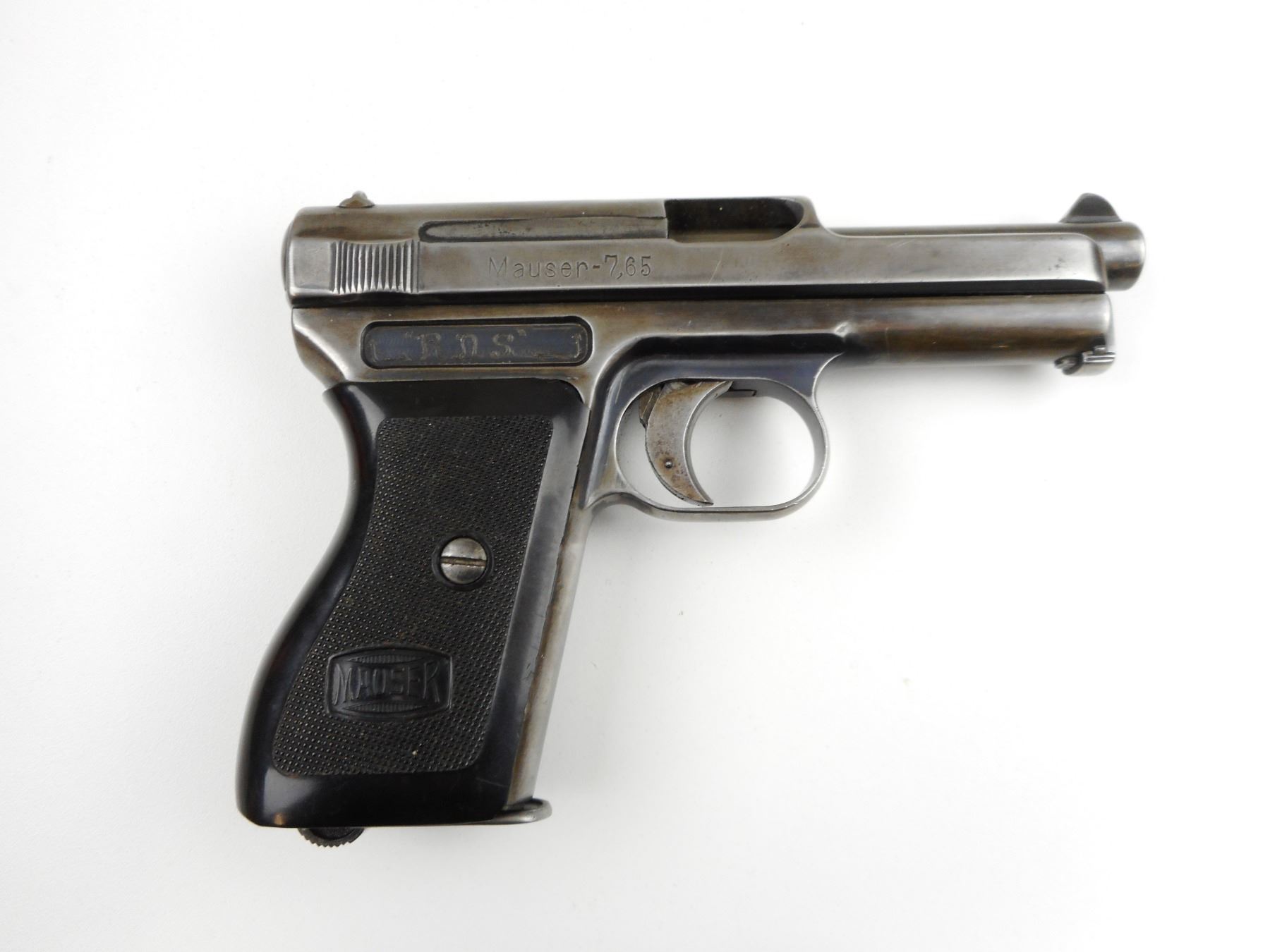 MAUSER, MODEL: 1934, CALIBER: 7.65MM , COMES WITH MAGAZINE, BLADE FRONT AND RAISED NOTCH REAR SIGHT, GOOD BORE, CHECKERED WRAP AROUND GRIP PANELS, MARKED RDS IN SCRIPT ON THE RIGHT SIDE OF RECEIVER (MOST LIKELY FORMER OWNER) SHOWS SOME HANDLING MARKS, VERY LITTLE FINISH REMANING , ACTION: SEMI-AUTOMATIC HANDGUN , BARREL LENGTH: 89MM , CONDITION: 5/10 , STOCK # 2388 , SERIAL # 206869 , CLASS: CANADIAN PROHIBITED CLASS