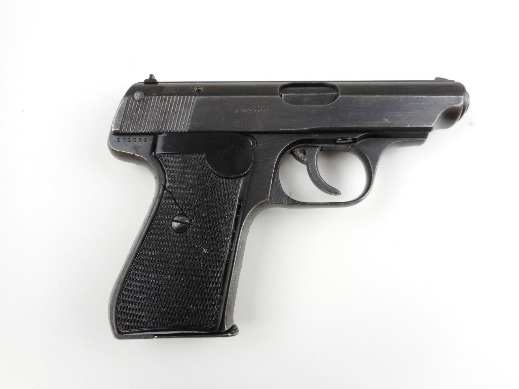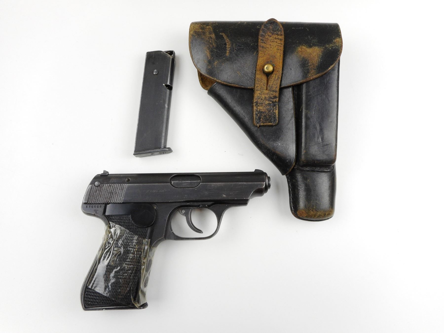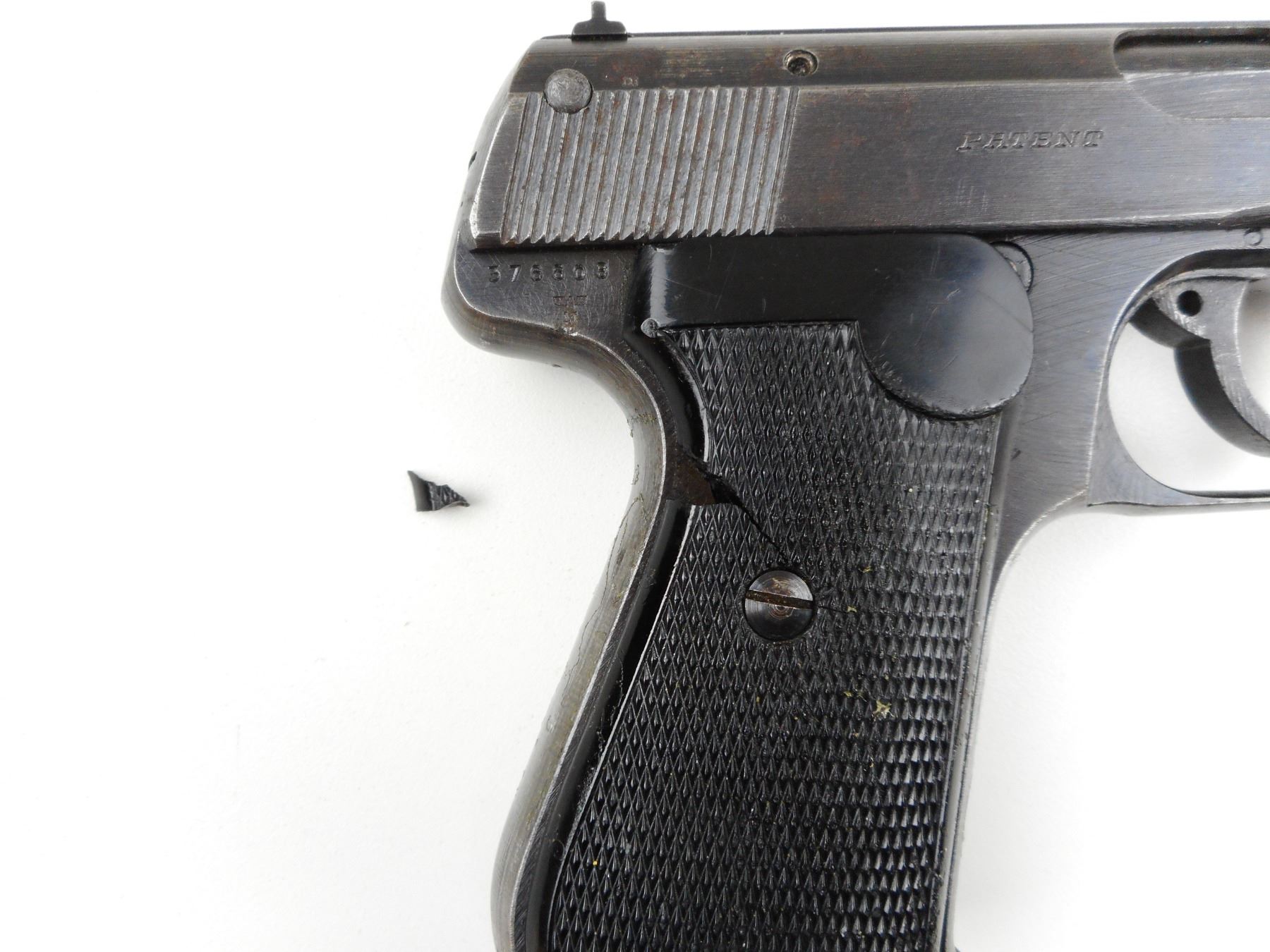 SAUER, MODEL: 38H, CALIBER: 7.65MM , COMES WITH LEATHER HOLSTER AND A TOTAL OF 2 MAGAZINES, VERY GOOD BORE, CRACKED BLACK PLASTIC GRIP PANELS, SOME SURFACE PITTING, GERMAN MILITARY ACCEPTANCE MARKS, SHOWS SOME HANDLING MARKS, HOLSTER IS MARKED DRGM , ACTION: SEMI-AUTOMATIC HANDGUN , BARREL LENGTH: 83MM , CONDITION: 5/10 , STOCK # 2406 , SERIAL # 376608 , CLASS: CANADIAN PROHIBITED CLASS