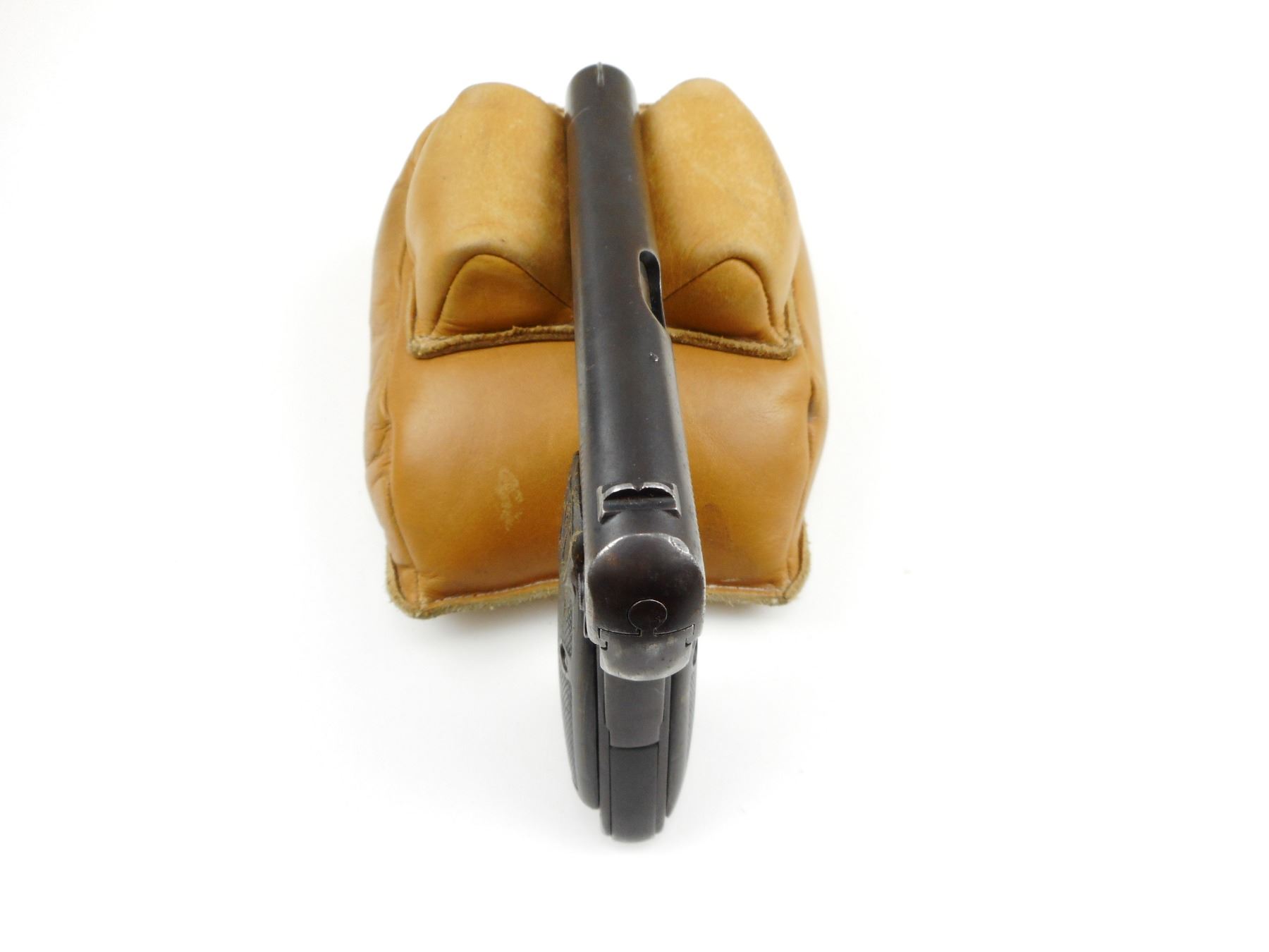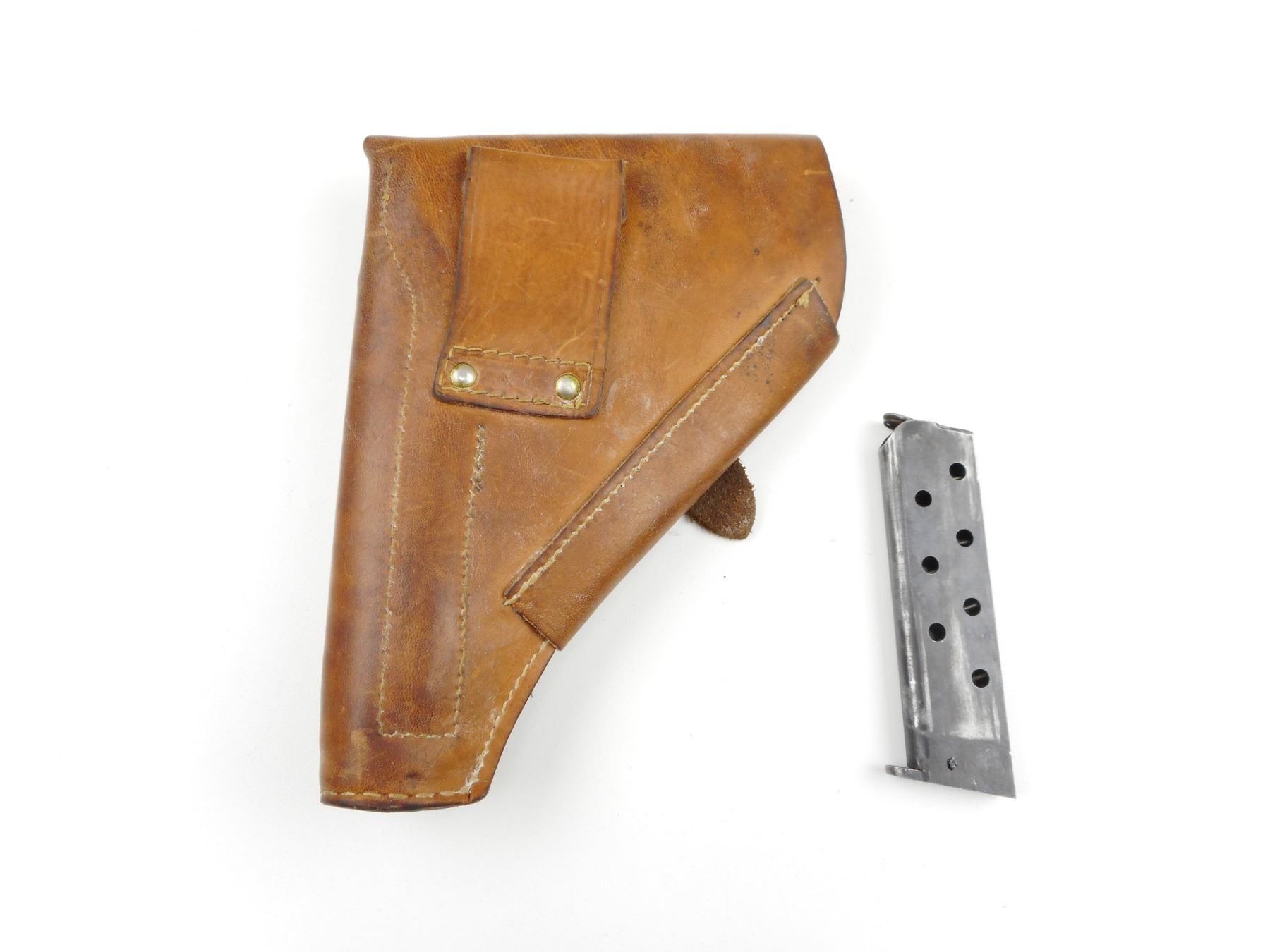 FN BROWNING, MODEL: 1922, CALIBER: 7.65MM , COMES WITH LEATHER HOLSTER AND TOTAL OF 2 MAGAZINES, BORE IS GOOD, BLADE FRONT AND RAISED NOTCH REAR SIGHTS, WORN CHECKERED GRIP PANELS WITH FN LOGO, GRIP SAFETY, SHOWS SOME HANDLING MARKS, HAS SOME CYRYLLIC , ACTION: SEMI-AUTOMATIC HANDGUN , BARREL LENGTH: 114MM , CONDITION: 5/10 , STOCK # 2407 , SERIAL # 37718 , CLASS: CANADIAN PROHIBITED CLASS