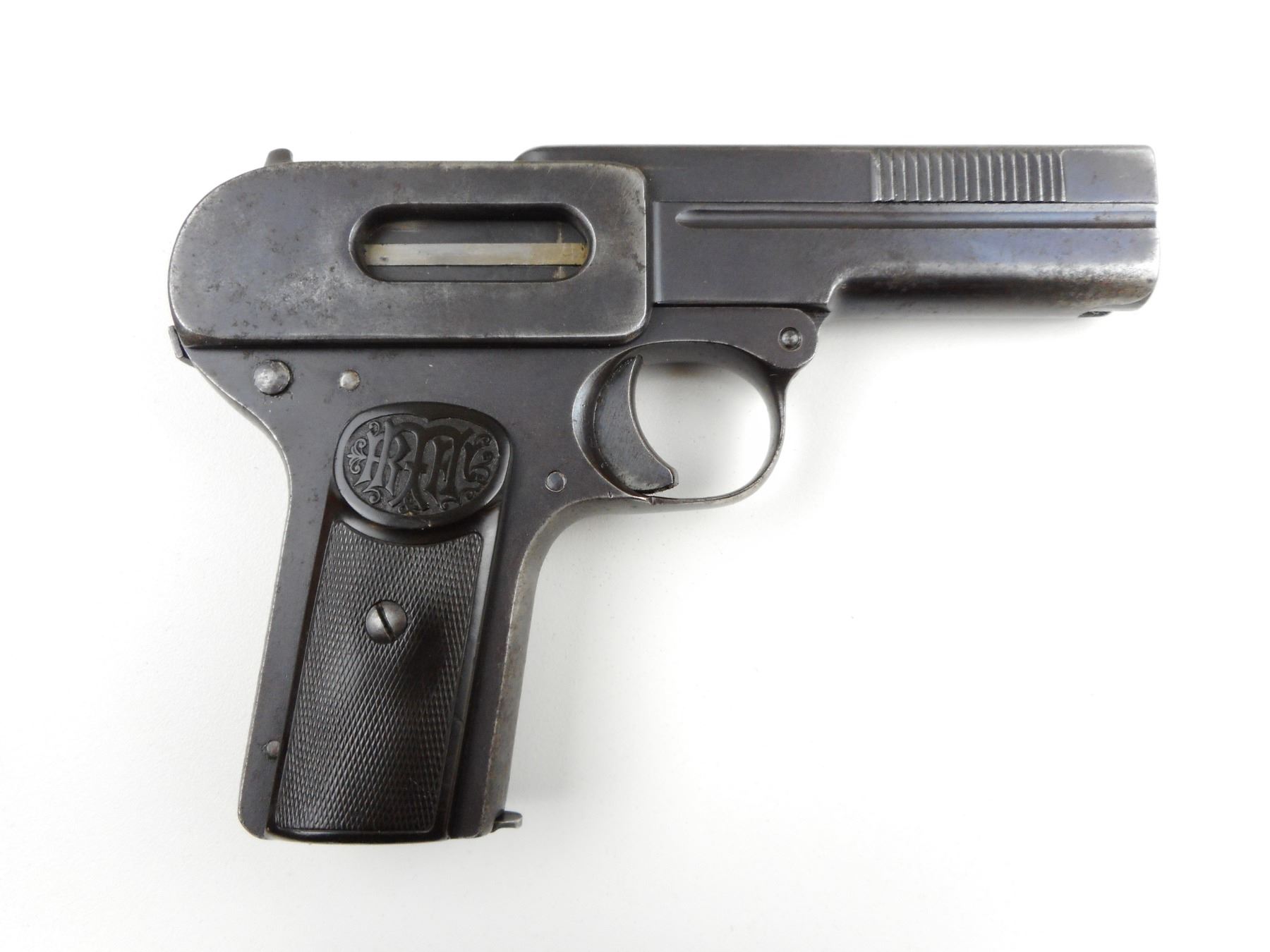 DREYSE, MODEL: DREYSE 1907, CALIBER: 7.65MM , COMES WITH MAGAZINE, BORE IS GOOD, BLADE FRONT AND RAISED NOTCH REAR SIGHTS, BLACK PLASTIC CHECKERED GRIP PANELS, SHOWS SOME HANDLING MARKS , ACTION: SEMI-AUTOMATIC HANDGUN , BARREL LENGTH: 93MM , CONDITION: 5/10 , STOCK # 2417 , SERIAL # 62967 , CLASS: CANADIAN PROHIBITED CLASS