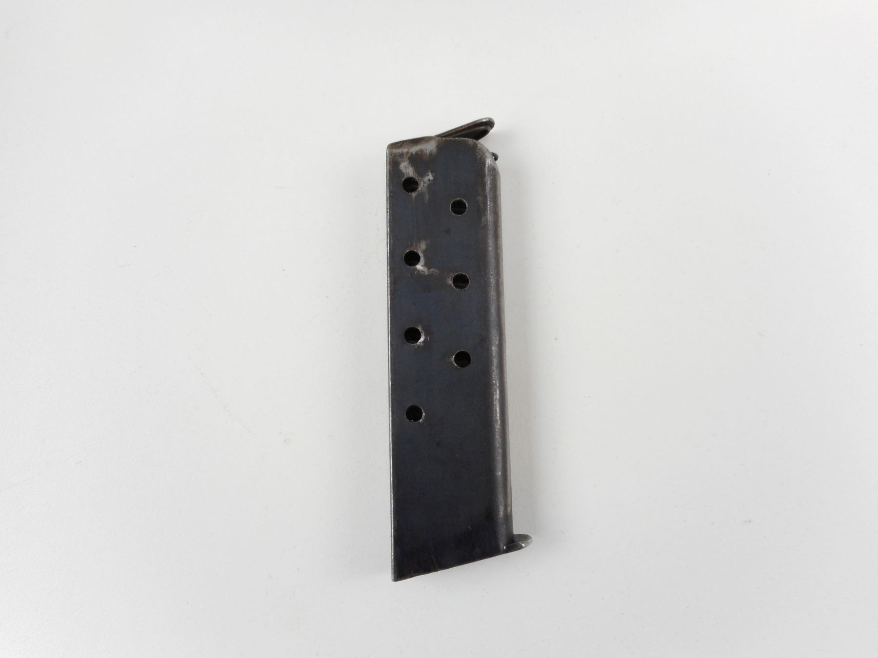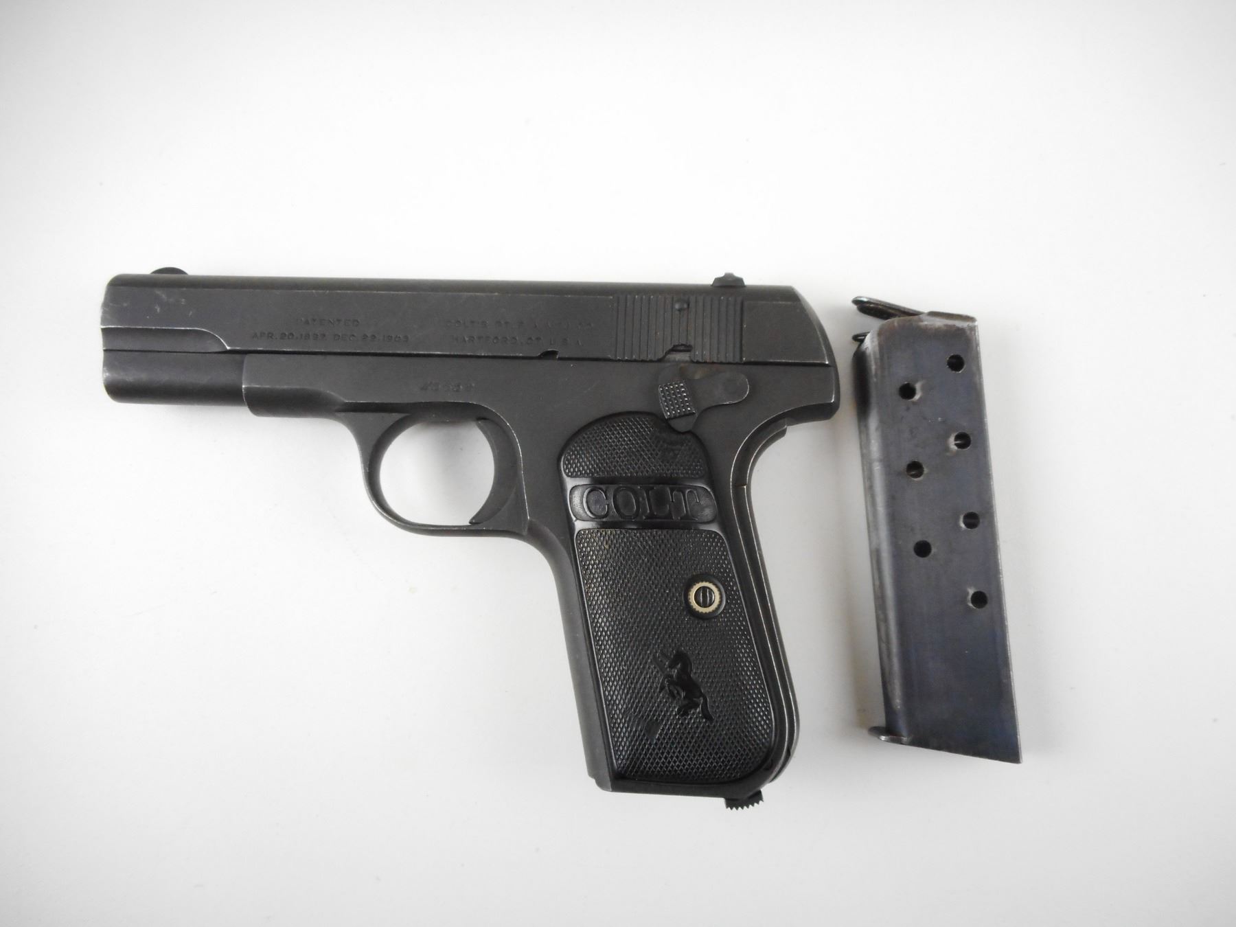 COLT, MODEL: 1903, CALIBER: 380 AUTO , COMES WITH MAGAZINE, VERY GOOD BORE, BLADE FRONT AND RAISED NOTCH REAR SIGHTS, PARKERIZED FINISH, CHECKERED PLASTIC GRIP PANELS WITH COLT LOGO, SHOWS SOME HANDLING MARKS , ACTION: SEMI-AUTOMATIC HANDGUN , BARREL LENGTH: 95MM , CONDITION: 6/10 , STOCK # 2422 , SERIAL # 45652 , CLASS: CANADIAN PROHIBITED CLASS