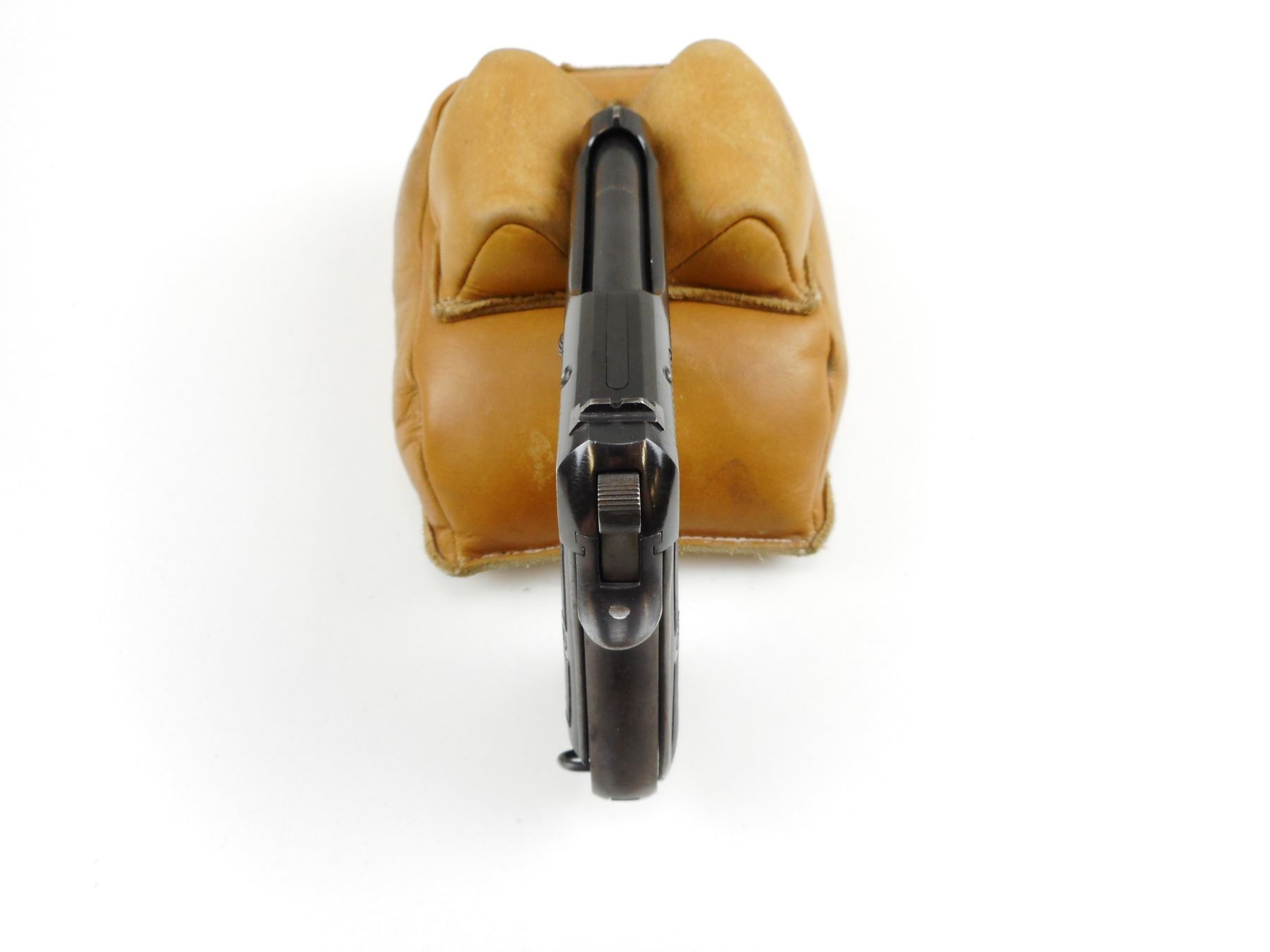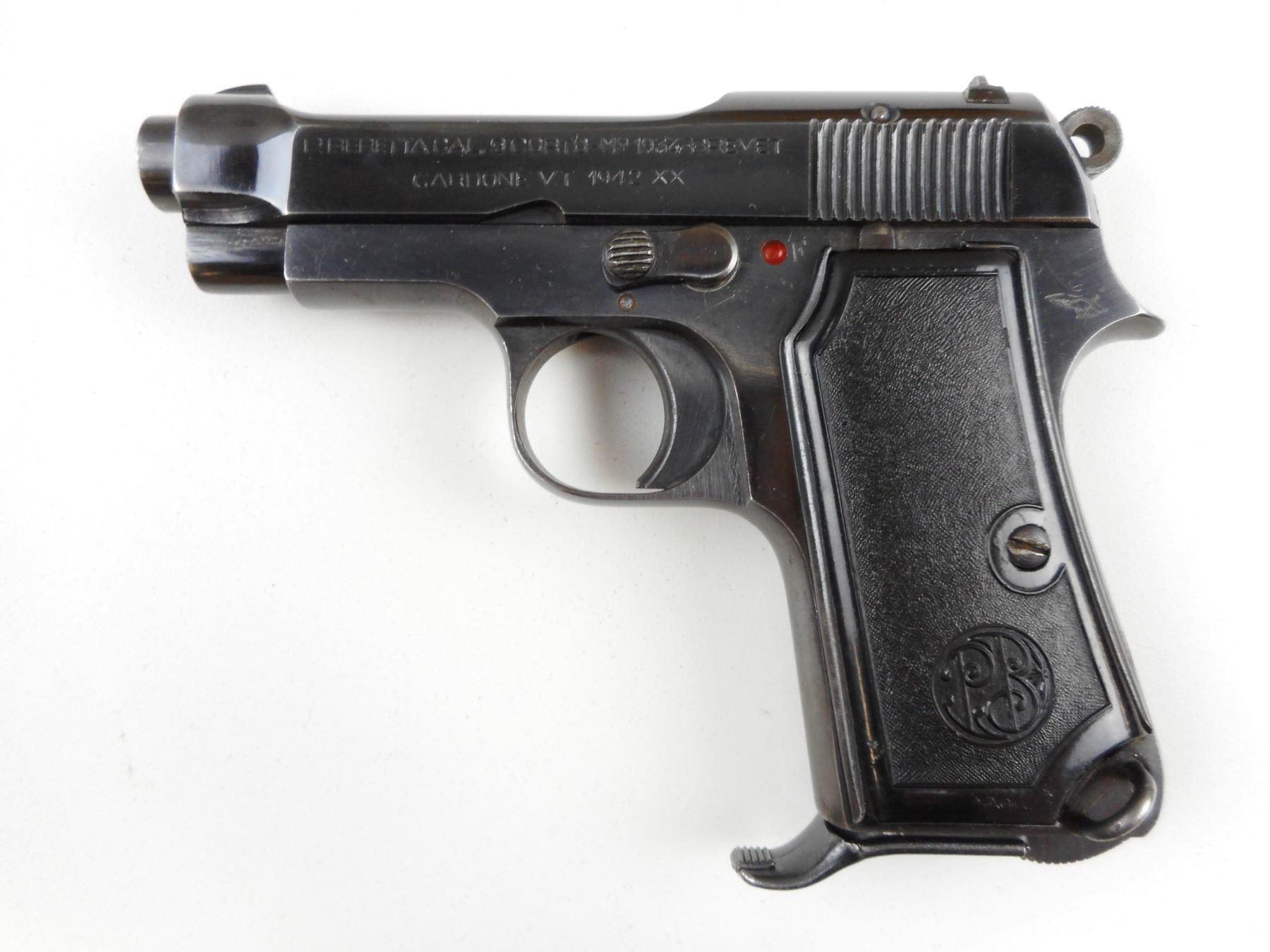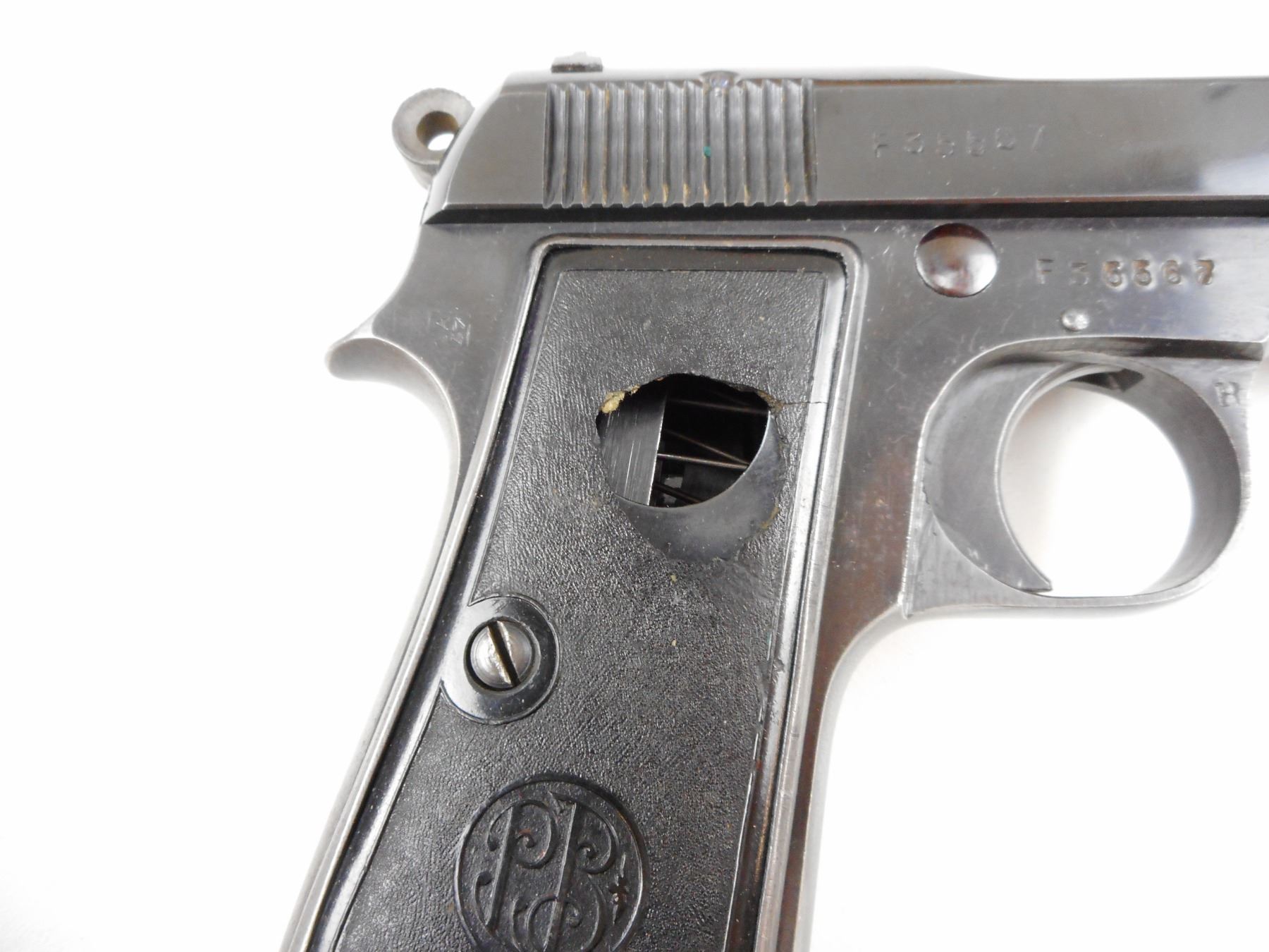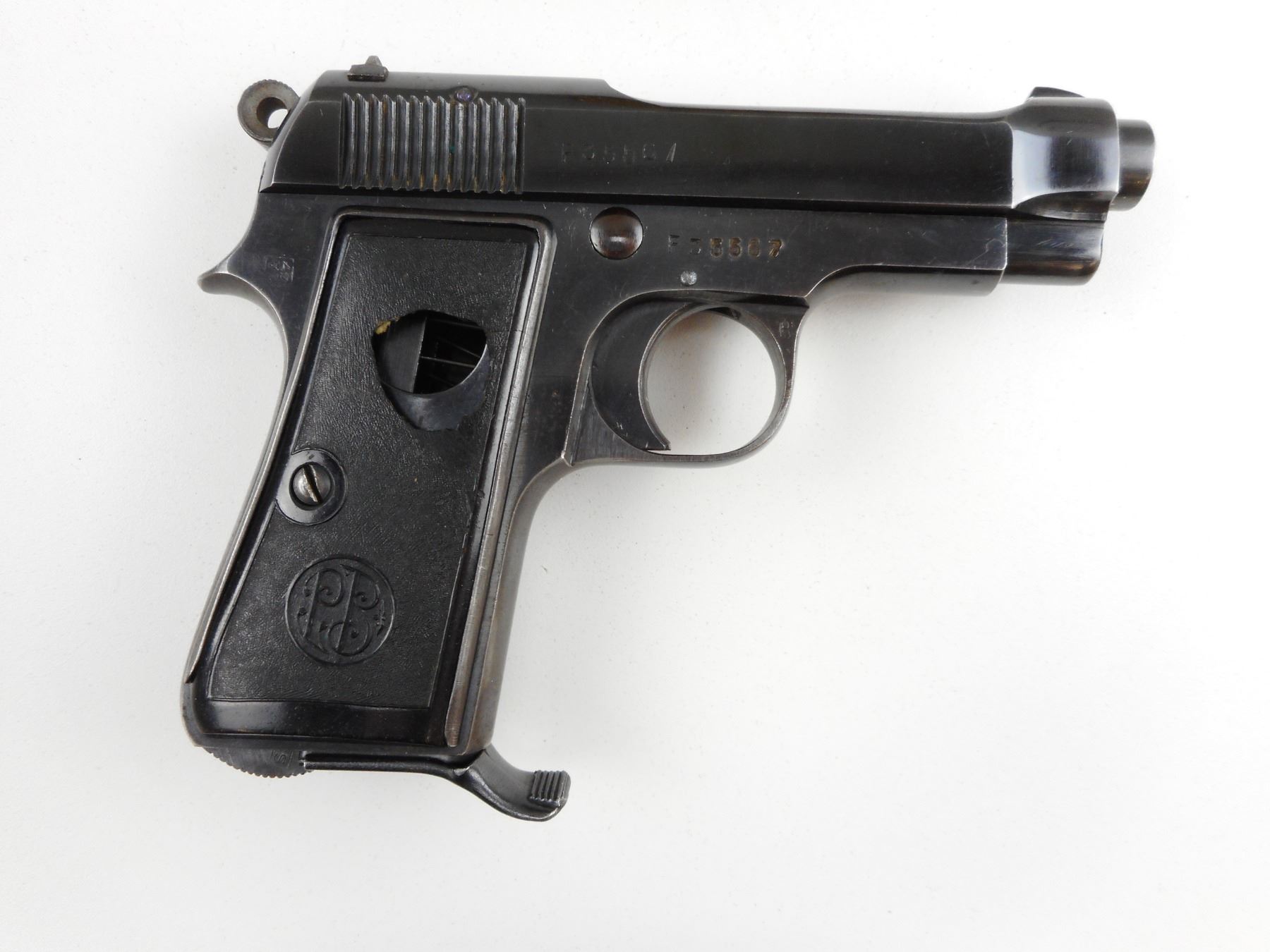 BERETTA, MODEL: 1934, CALIBER: 9MM SHORT , COMES WITH MAGAZINE, GOOD BORE, BLADE FRONT AND RAISED NOTCH REAR SIGHTS, BLACK PLASTIC GRIP PANELS THE RIGHT PLASTIC GRIP PANEL HAS A LARGE HOLE IN IT, FINGER GRIP MAGAZINE, SHOWS VERY LITTLE HANDLING MARKS , ACTION: SEMI-AUTOMATIC RIFLE , BARREL LENGTH: 87MM , CONDITION: 5/10 , STOCK # 2428 , SERIAL # F35567 , CLASS: CANADIAN PROHIBITED CLASS