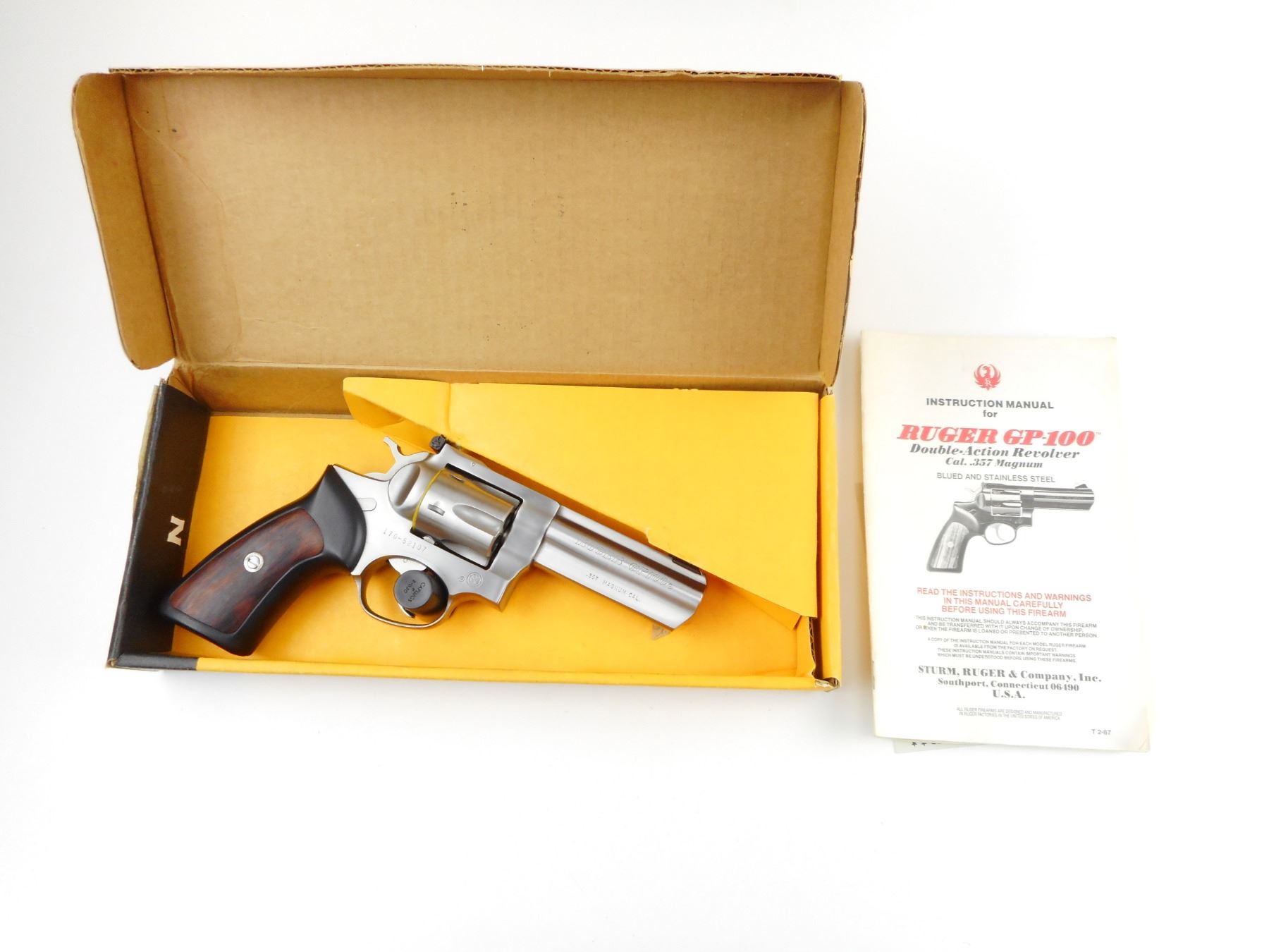RUGER , MODEL: GP-100, CALIBER: 357 MAGNUM , COMES WITH BOX WITH MANUAL, BLADE FRONT AND ADJUSTABLE REAR SIGHTS, TWO PIECE PLASTIC AND WOOD GRIP PANELS, SHOWS VERY LITTLE HANDLING MARKS, BORE IS EXCELLENT , ACTION: REVOLVER , BARREL LENGTH: 102MM , CONDITION: 9+/10 , STOCK # 2444 , SERIAL # 17052107 , CLASS: CANADIAN PROHIBITED CLASS