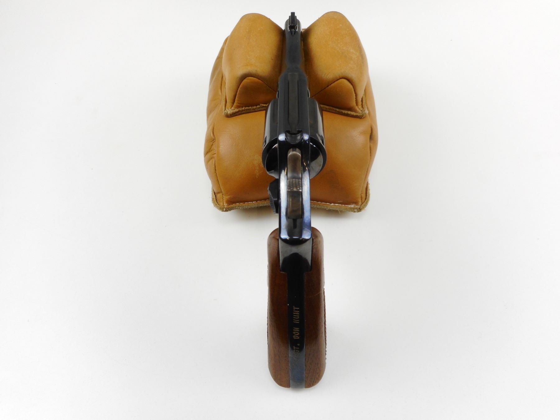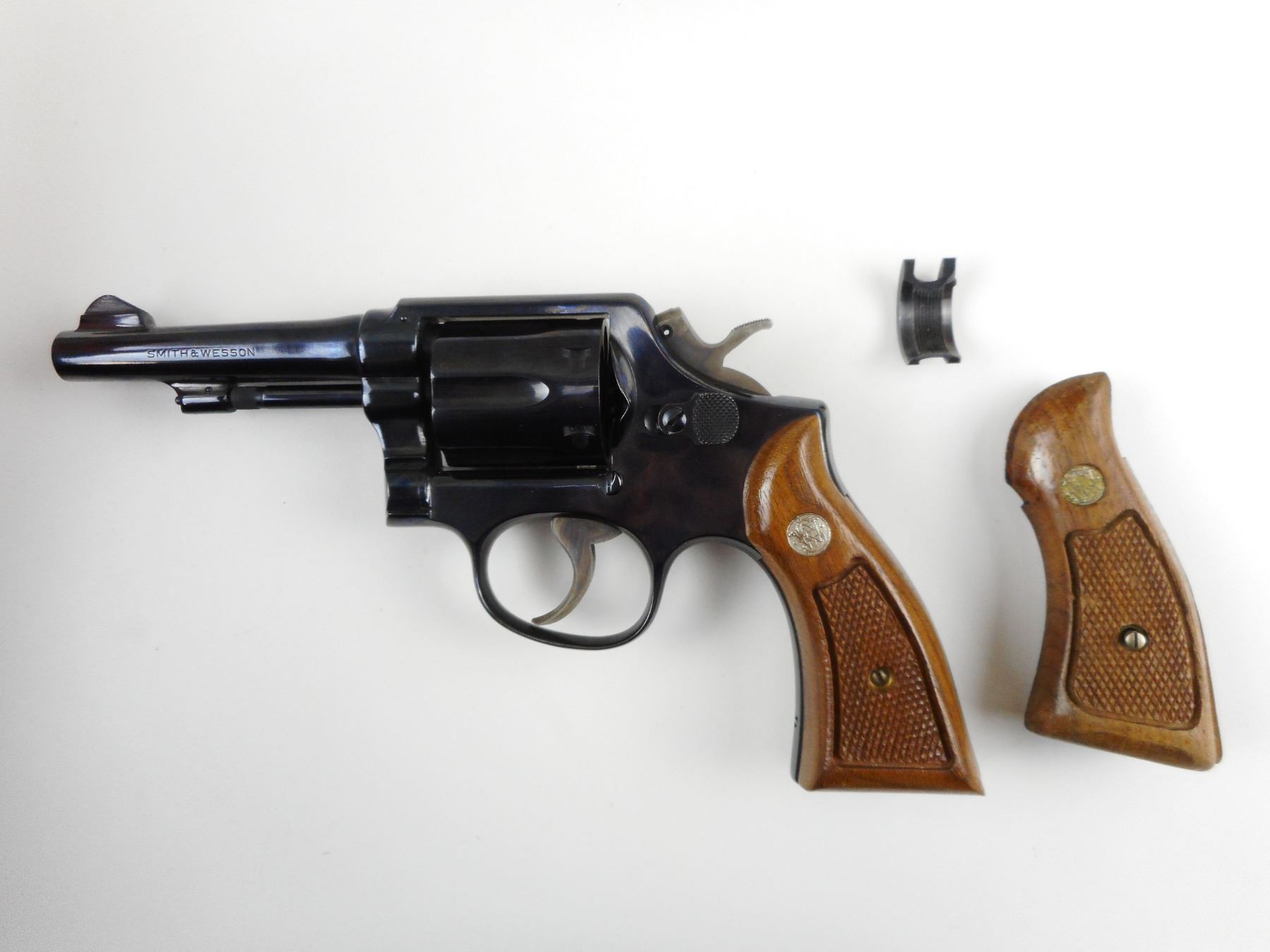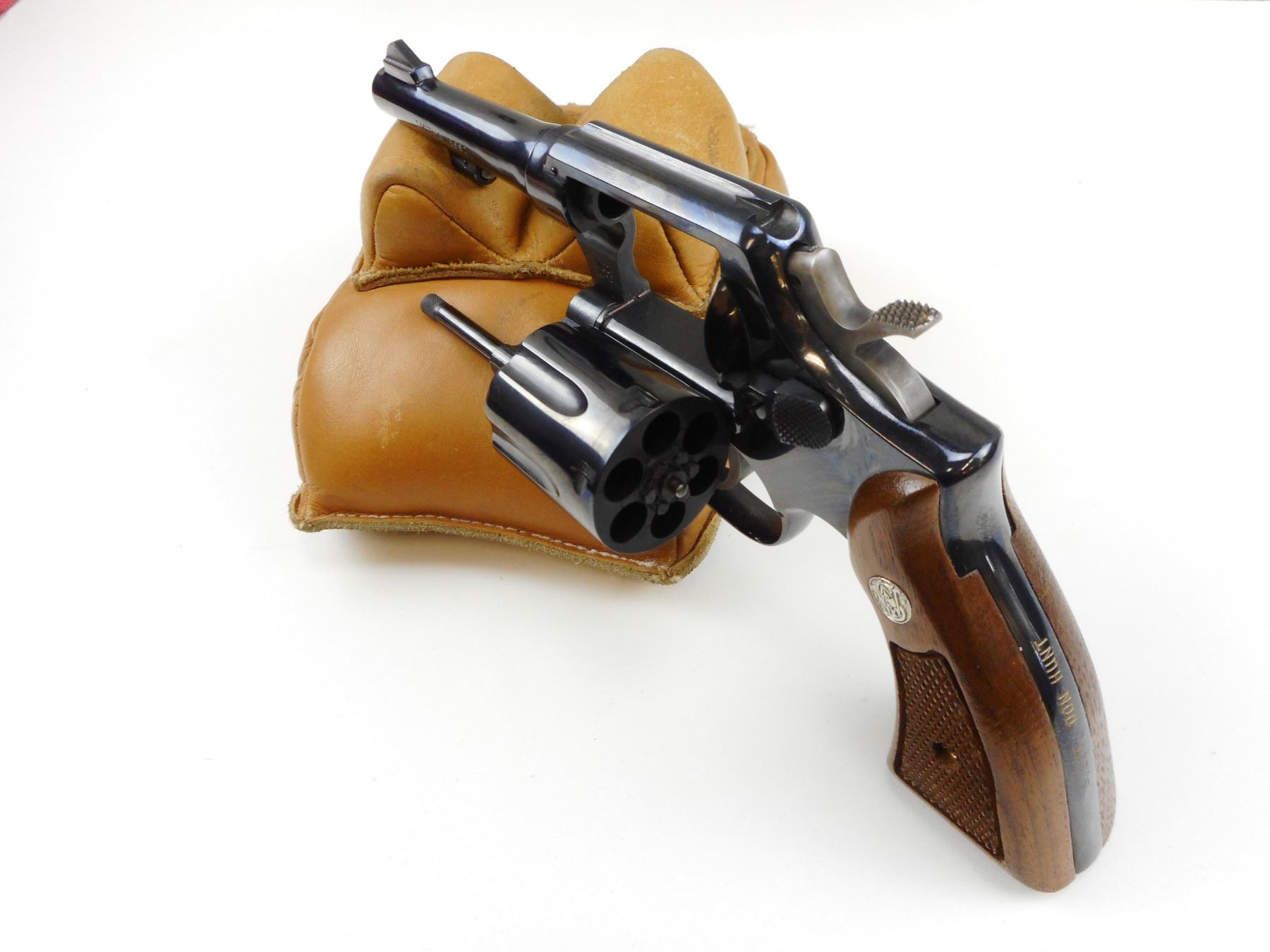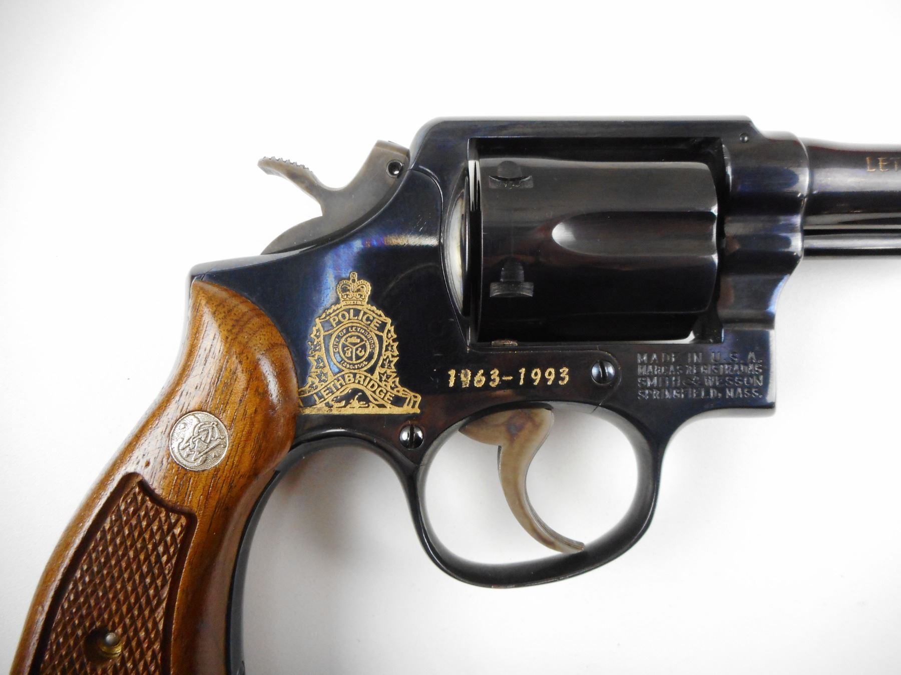 POLICE ISSUE, SMITH & WESSON , MODEL: 10-5, CALIBER: 38 SPECIAL , COMES WITH 2ND SET OF WOODEN S&W GRIPS AND A TRIGGER SHOE, THIS FIREARM WAS THE SERVICE REVOLVER FOR SGT DON HUNT HE WAS A OFFICER FROM 1963-1993 FOR THE LETHBRIDGE CITY POLICE, THIS FIREARM WAS REBLUED AND ETCHED AND PRESENTED TO HIM UPON HIS RETIREMENT, 6 SHOT CAPACITY, HOLD COCK, INDEXES WELL, ACTION IS TIGHT, BORE IS EXCELLENT, RAMP FRONT AND GROOVED REAR SIGHT, AS NEW REBLUED CONDITION , ACTION: REVOLVER , BARREL LENGTH: 101MM , CONDITION: 9+/10 REBLUED , STOCK # 2456 , SERIAL # D179183 , CLASS: CANADIAN PROHIBITED CLASS